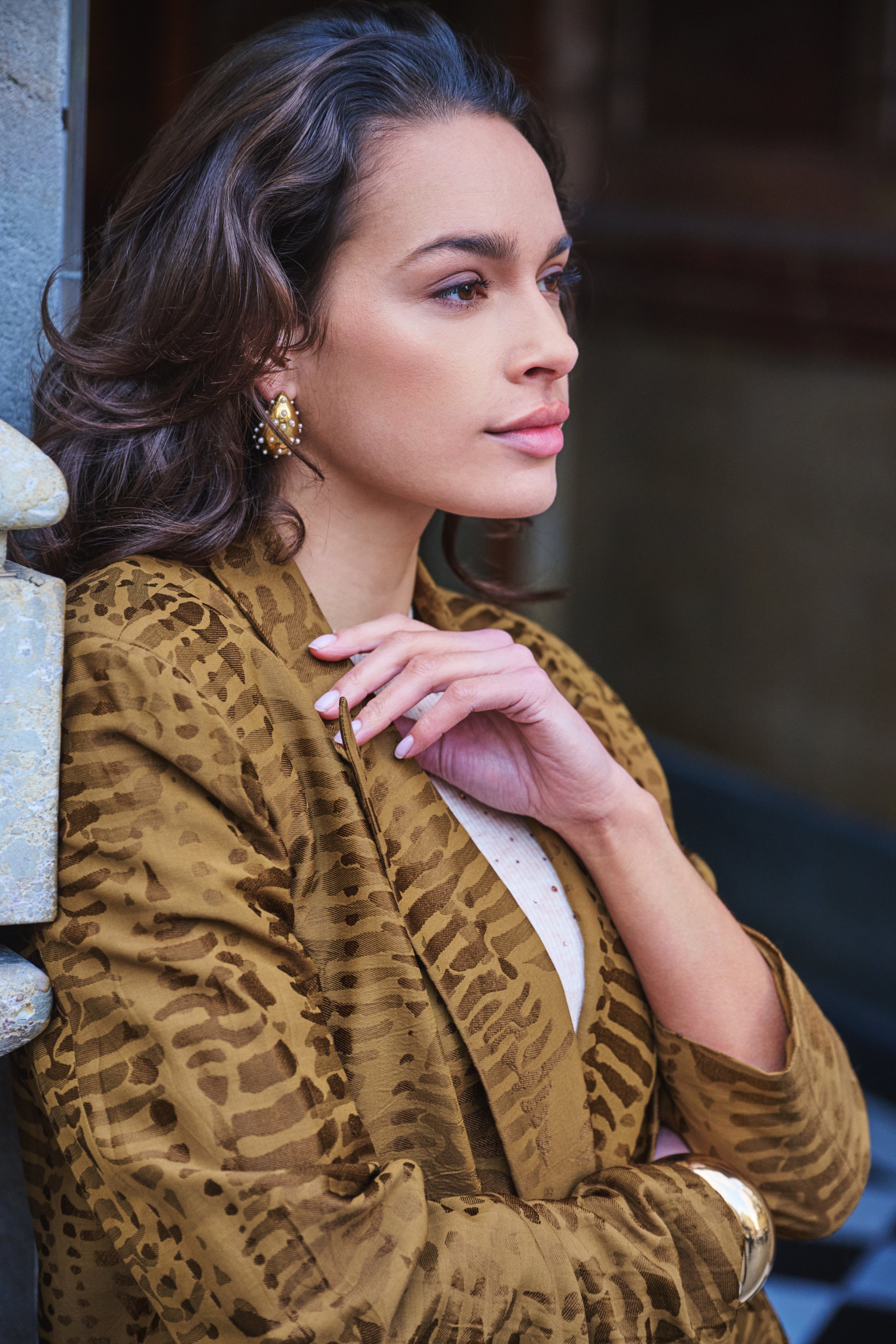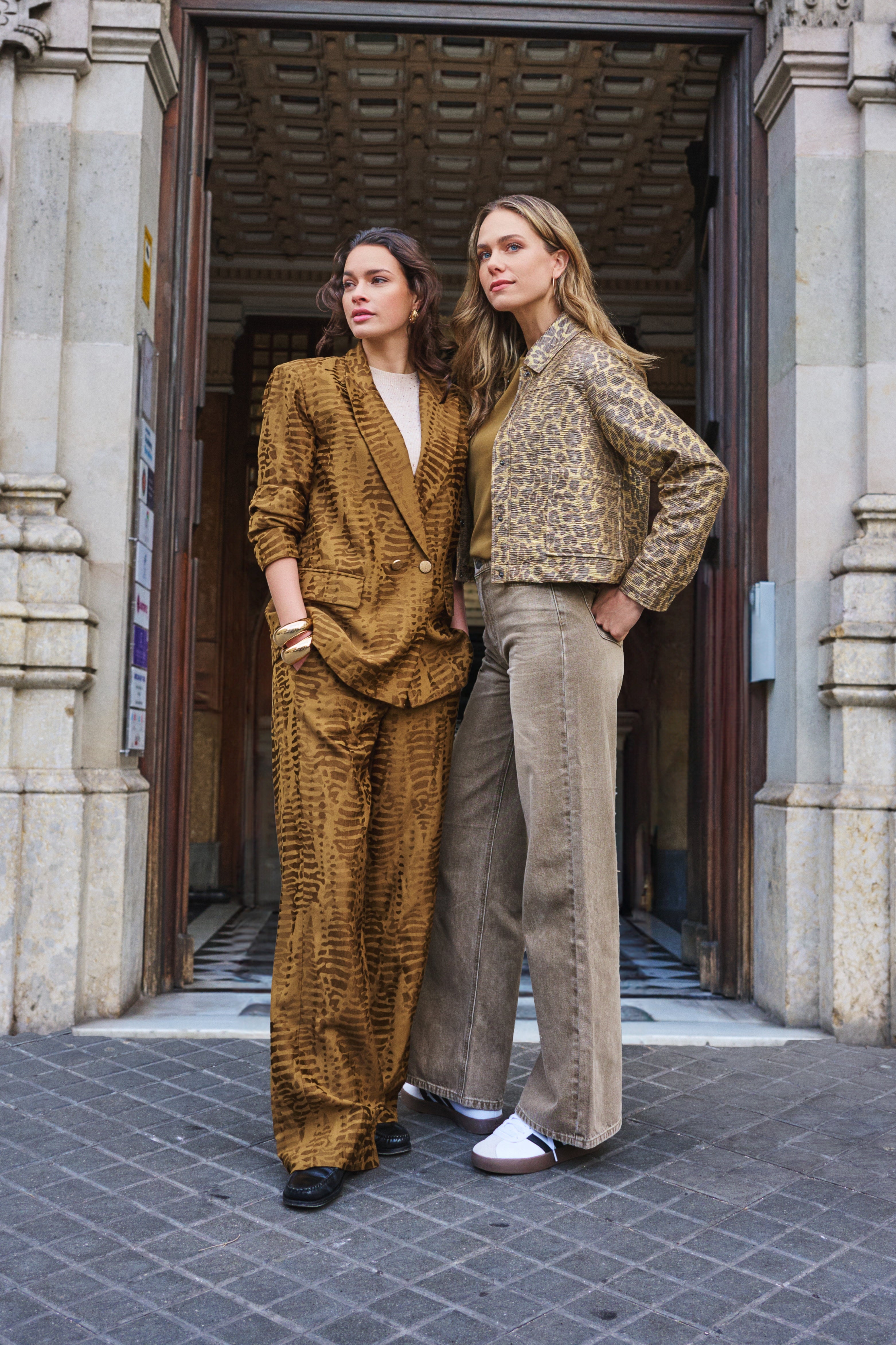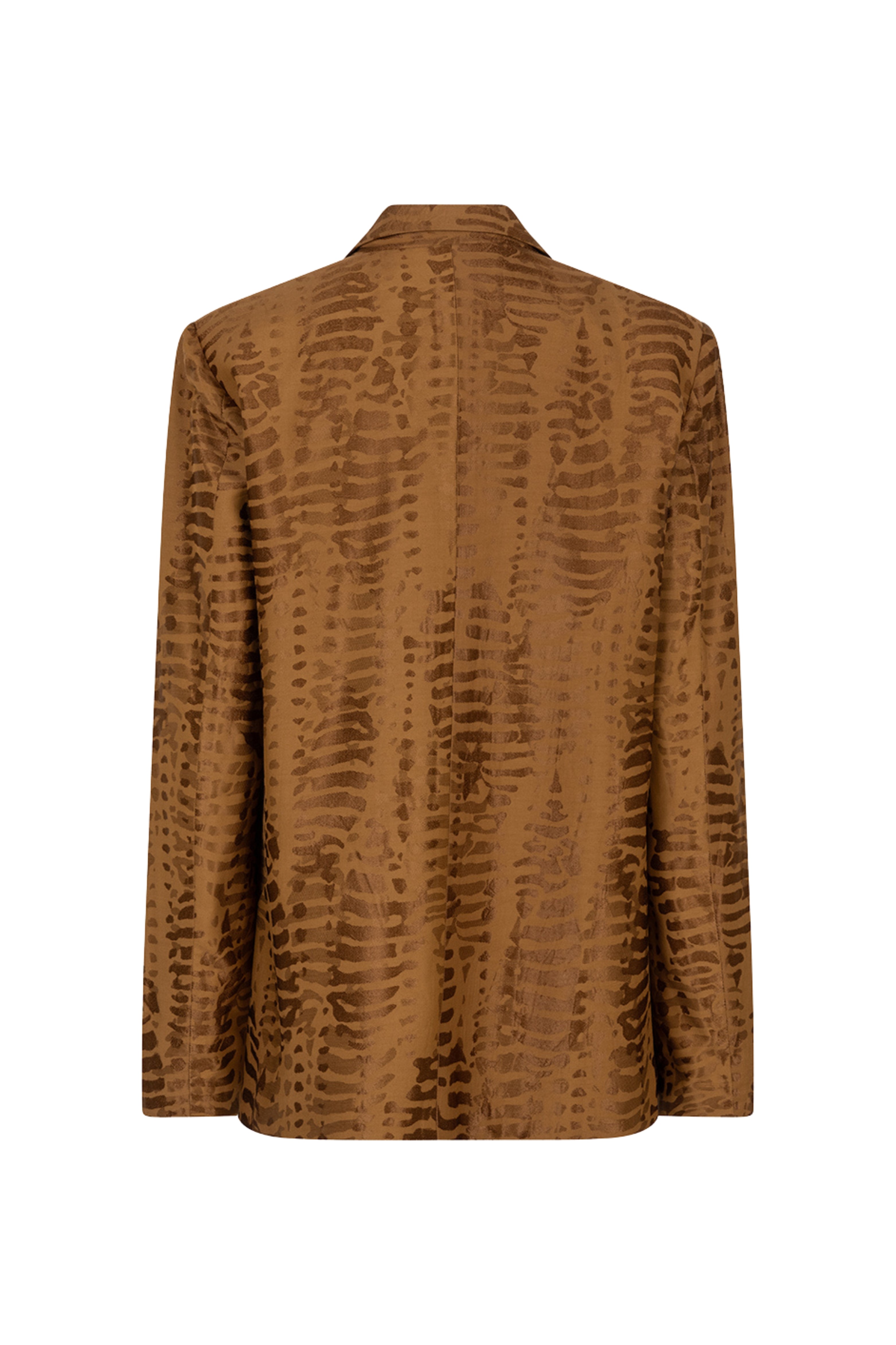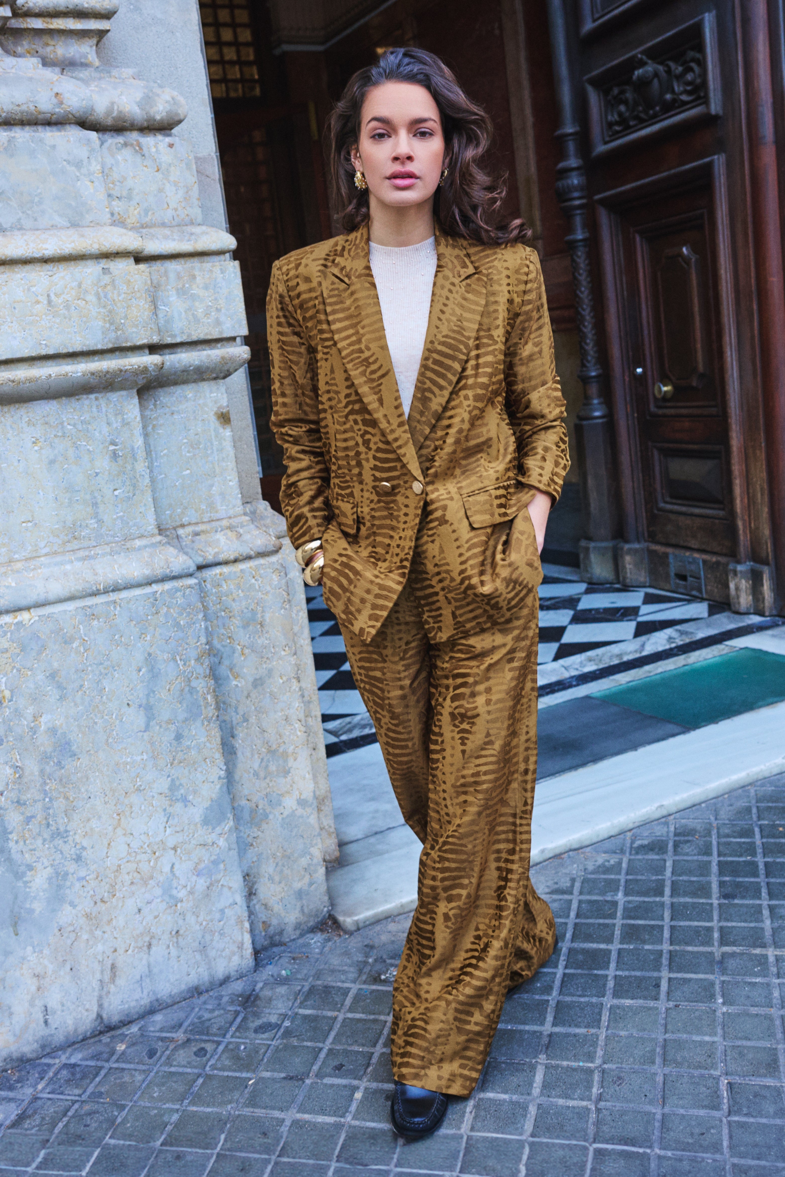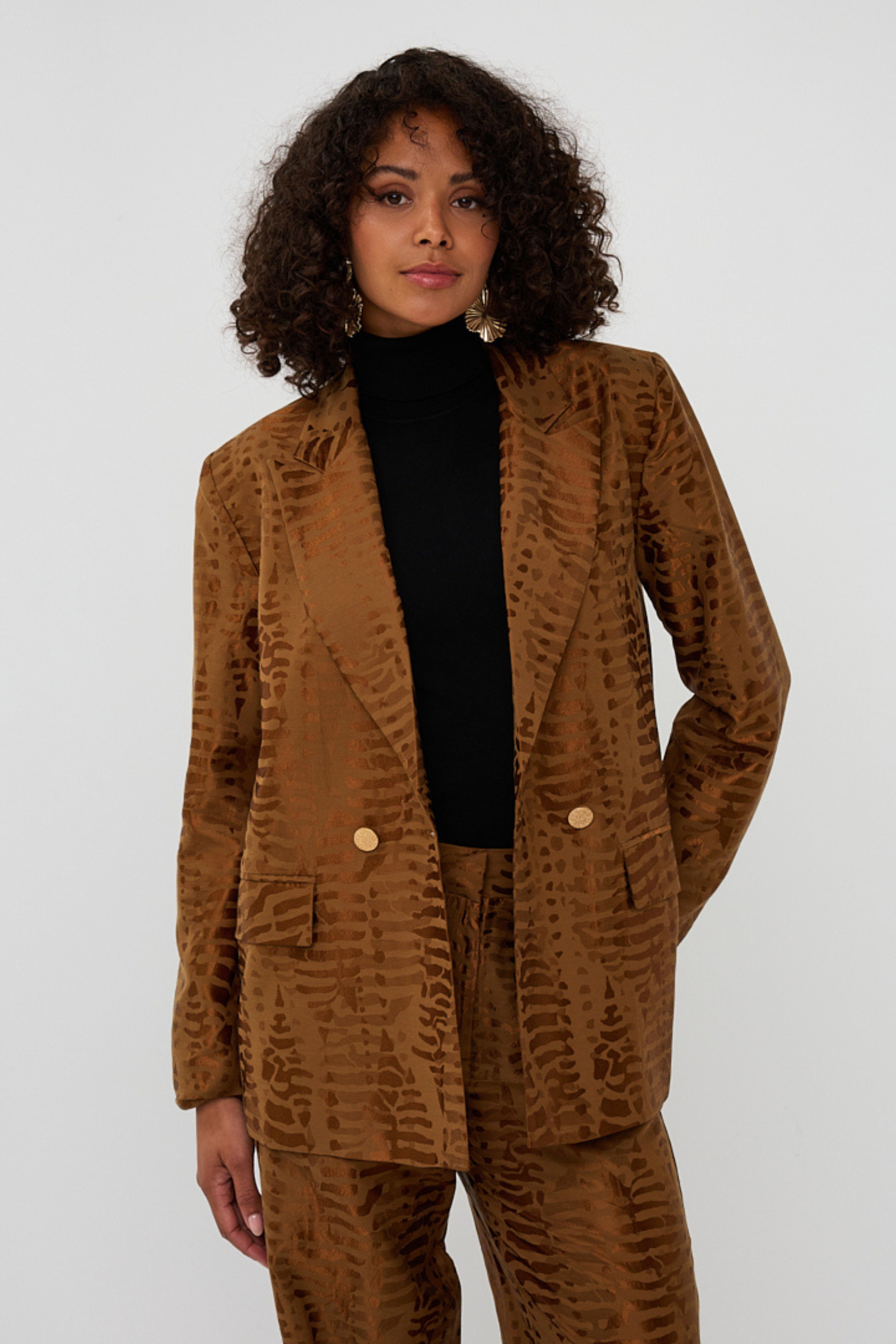 Blazer Animal Jacquard Olive van EsQualo brengt een speelse twist in je garderobe. Het glanzende jacquard dessin en de goudkleurige knopen maken dit item stijlvol en uniek, perfect voor een fashionable look.
