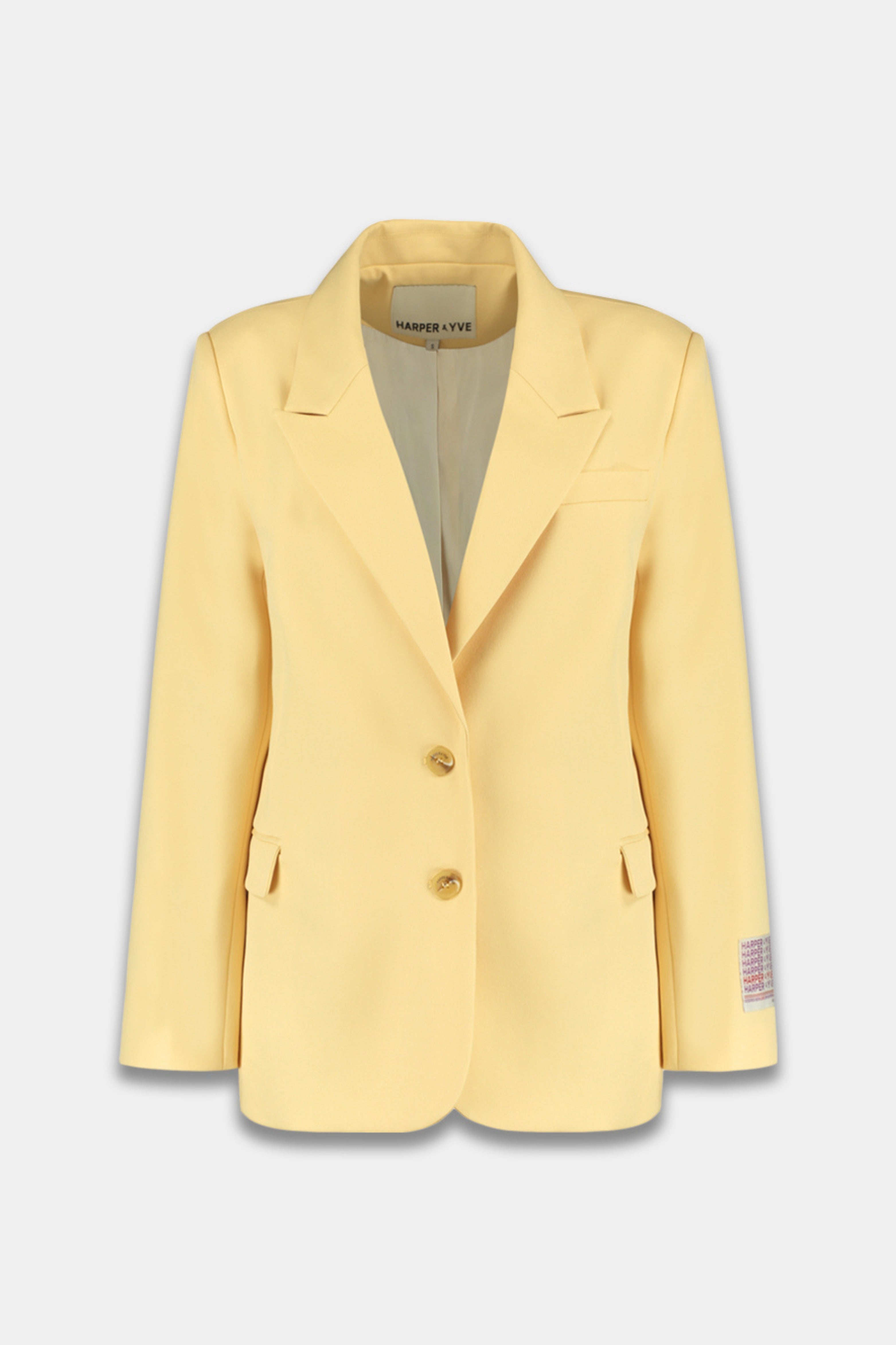 De Blazer Anna Light Yellow van Harper & Yve is een frisse, lichtgele blazer met een tijdloze pasvorm. De dubbele knoopsluiting en minimalistische details geven dit item een moderne, stijlvolle uitstraling voor elke look.