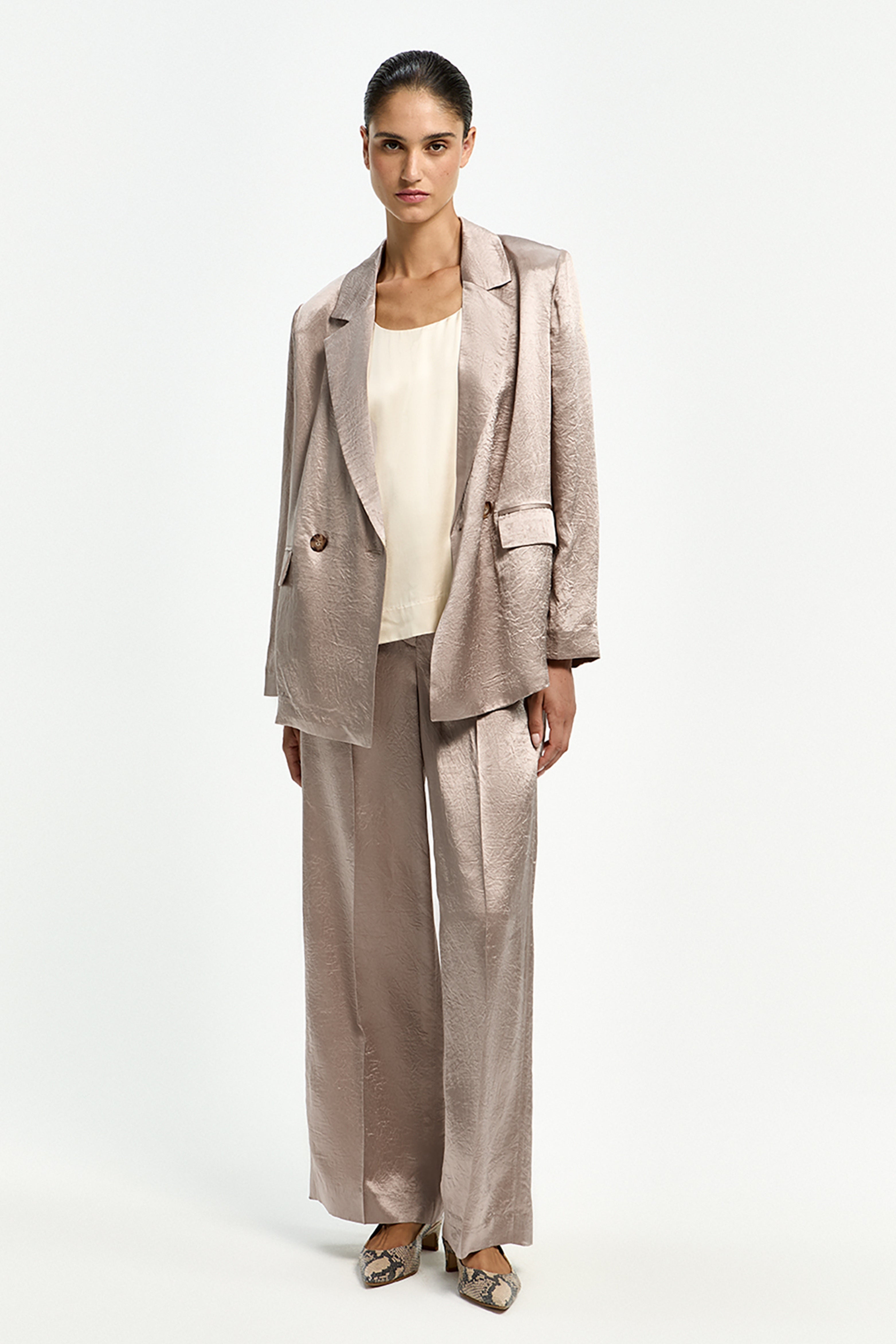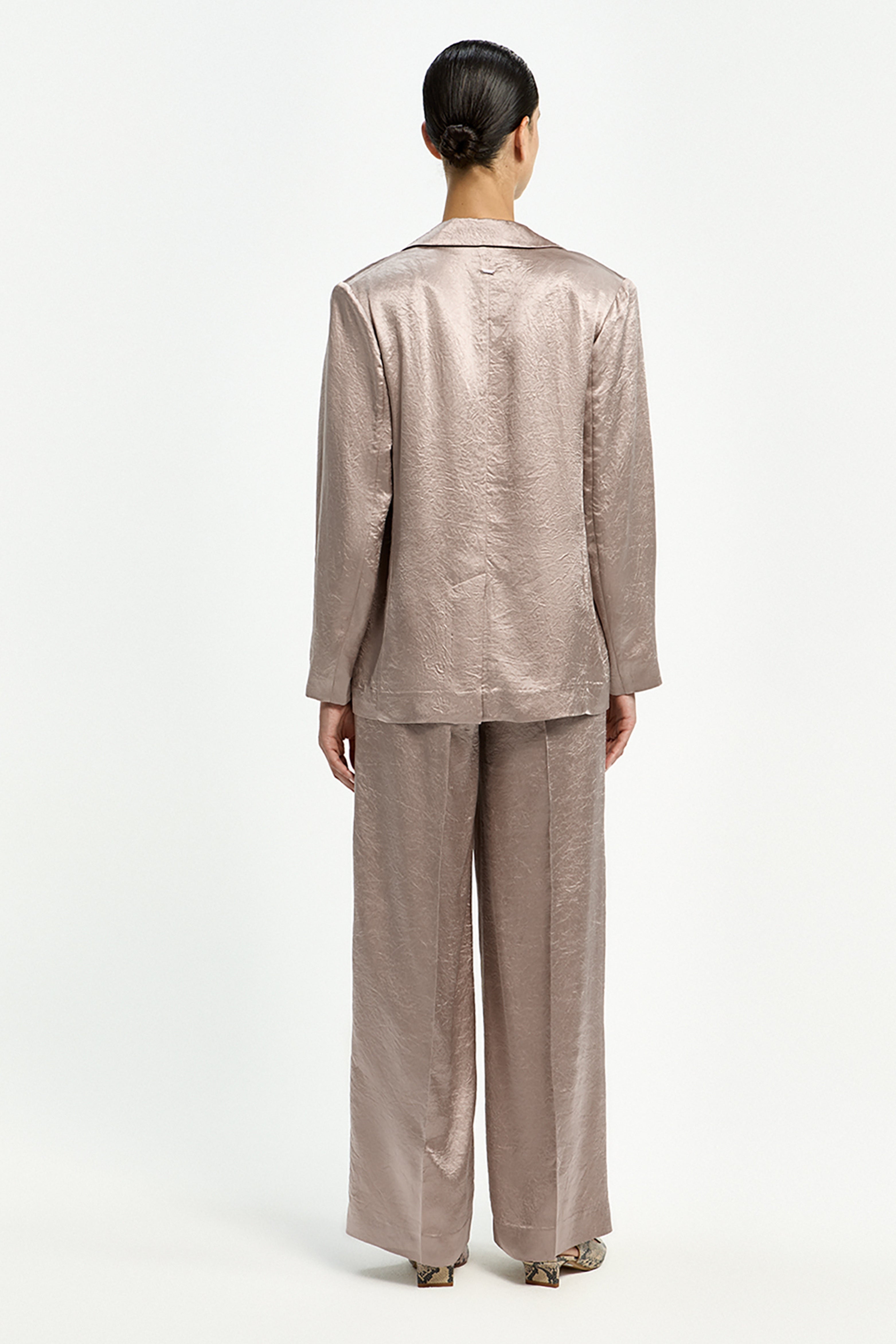 De Blazer Bilia Dark Oyster van Xandres is een statement blazer met een luxe, glanzende finish. De double-breasted sluiting en verfijnde stofstructuur geven dit item een krachtige en elegante uitstraling, perfect voor zowel formele gelegenheden als een stijlvolle avondlook.