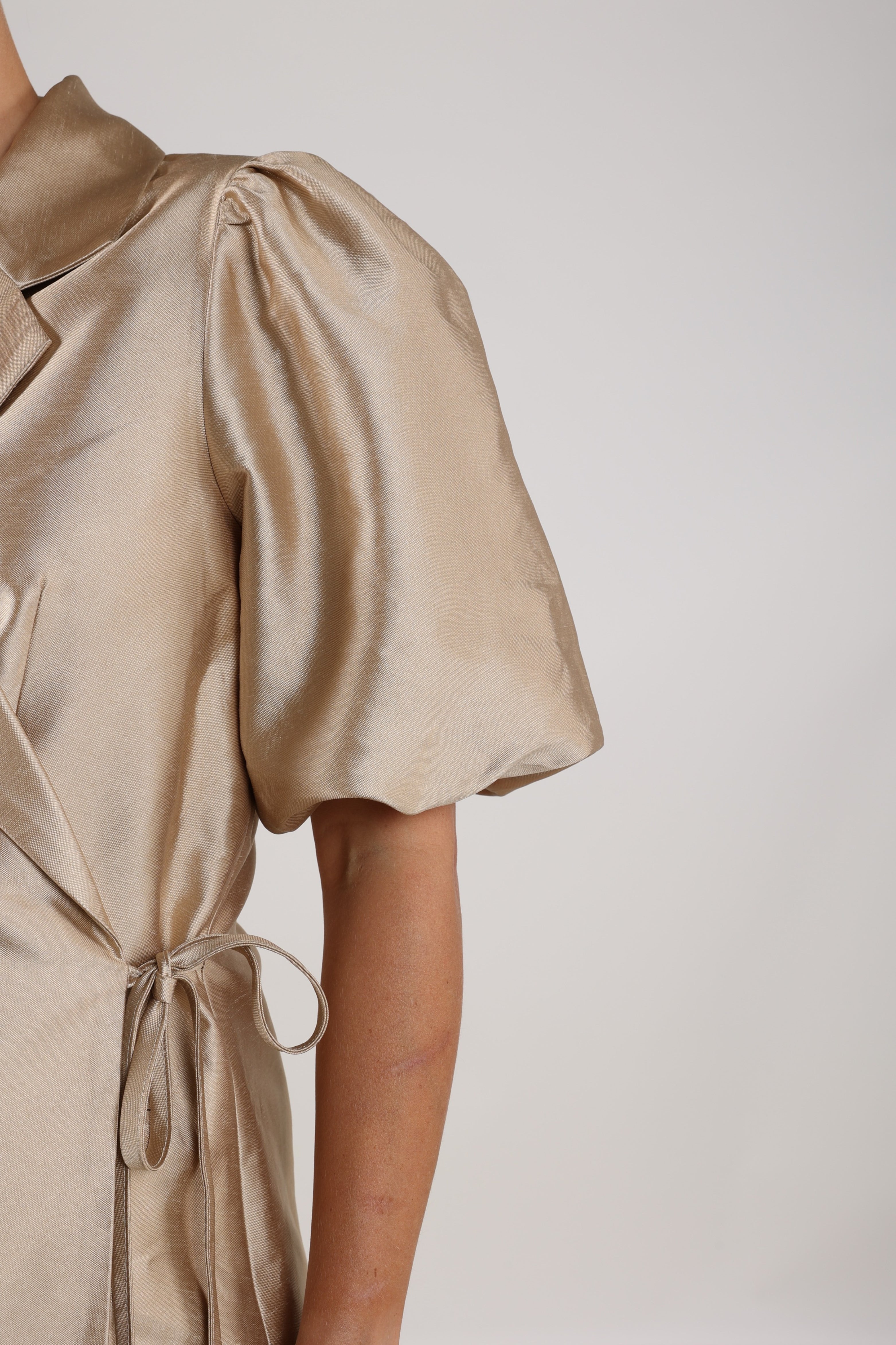 De Blazer Fabienne Gold van Nukus is een elegante wrap-blazer met reverskraag en strikceintuur. De glanzende stof en pofmouwen geven een luxe uitstraling. Perfect voor feestelijke gelegenheden.