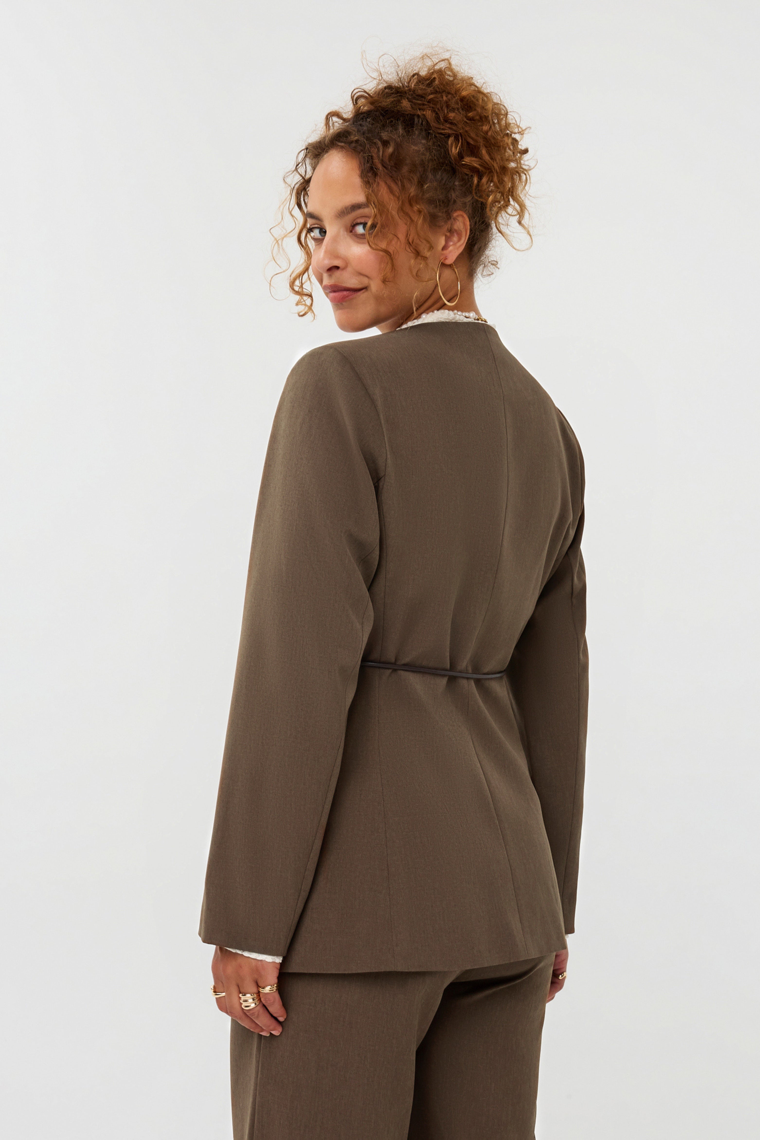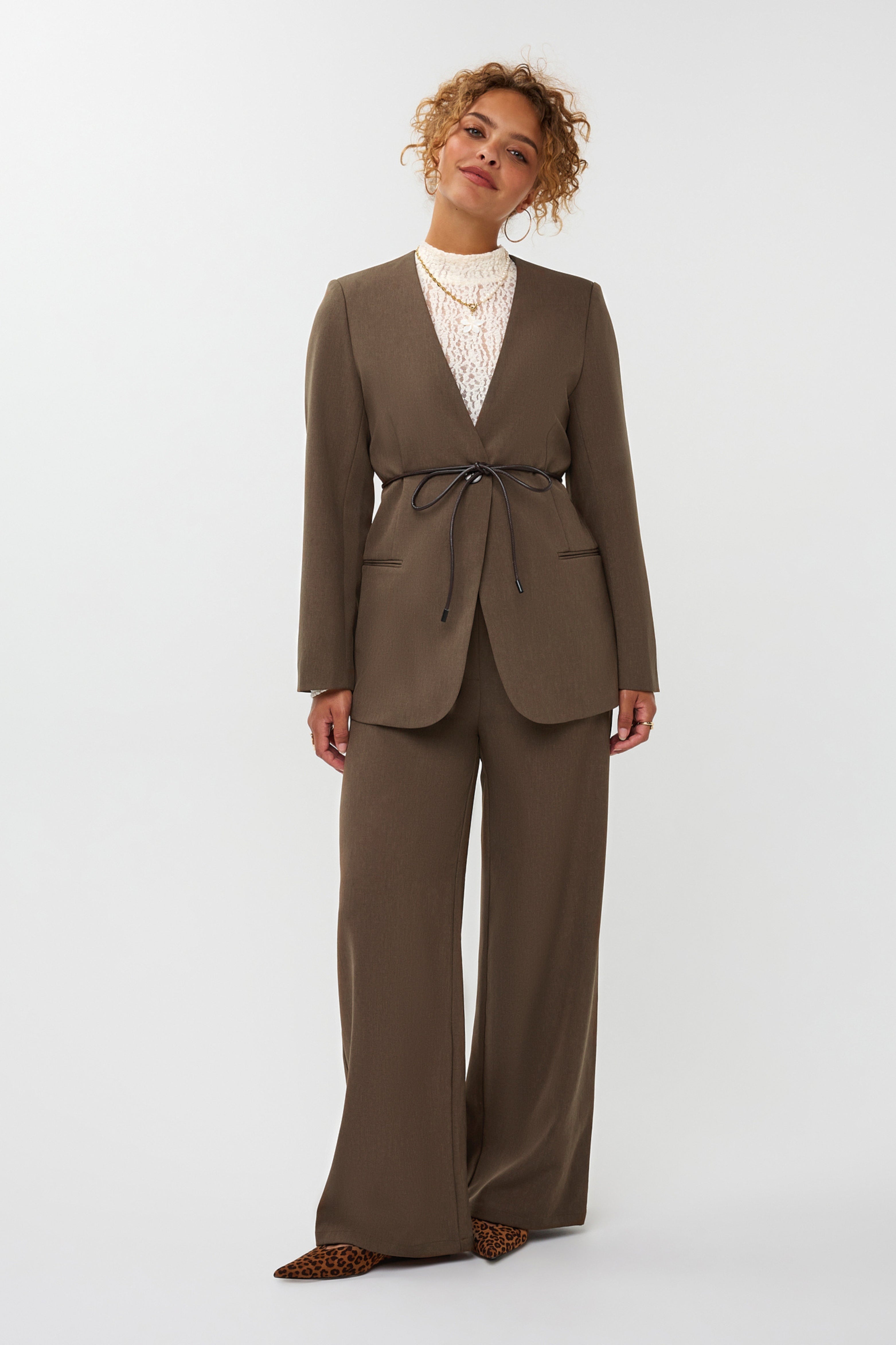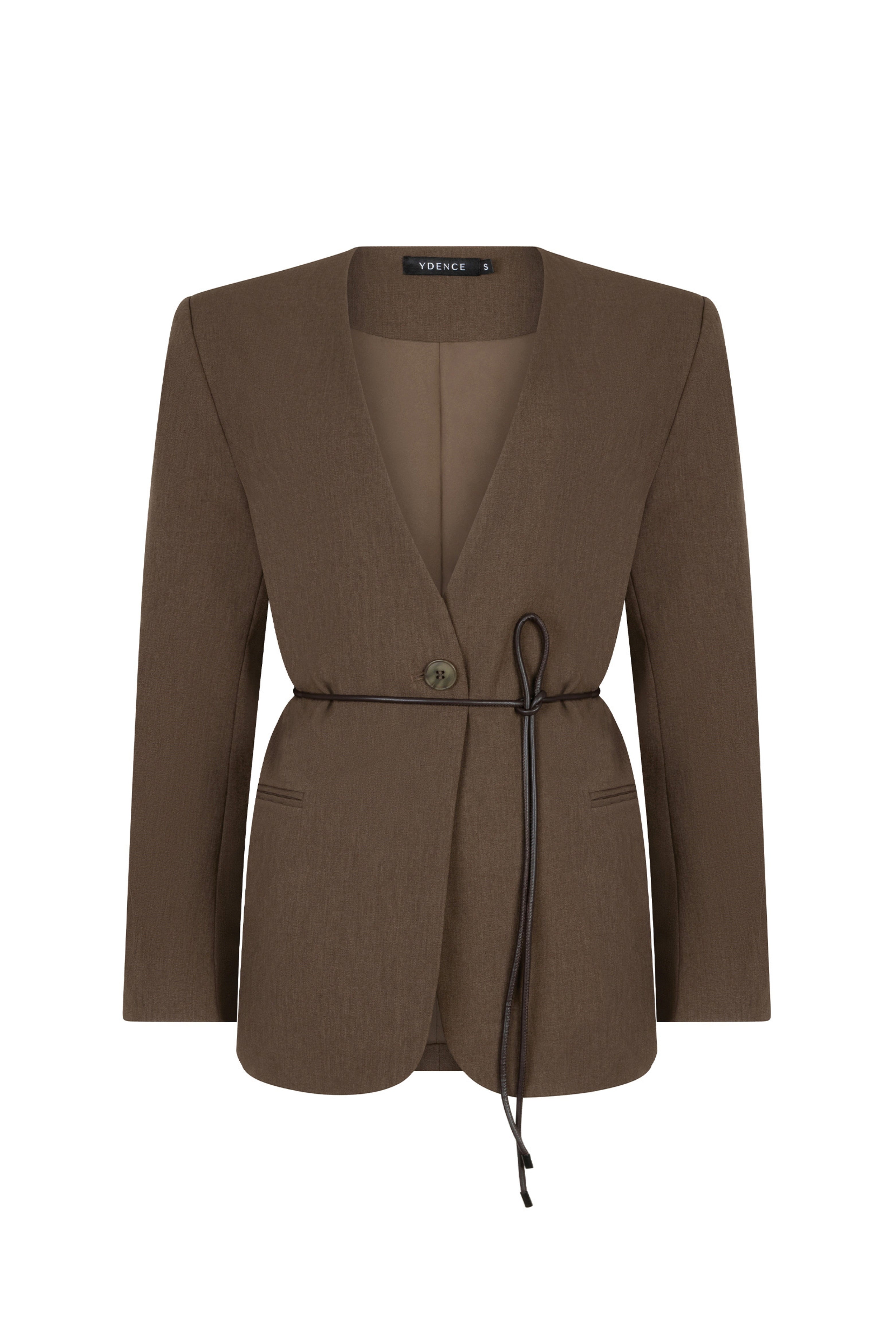 De Blazer Lexie Mud van Ydence is een moderne, getailleerde blazer in een warme bruintint. Uitgevoerd met een diepe V-hals, eenknoopsluiting en een veterceintuur om de taille te accentueren. Combineer als co-ord set voor een stijlvolle outfit.
