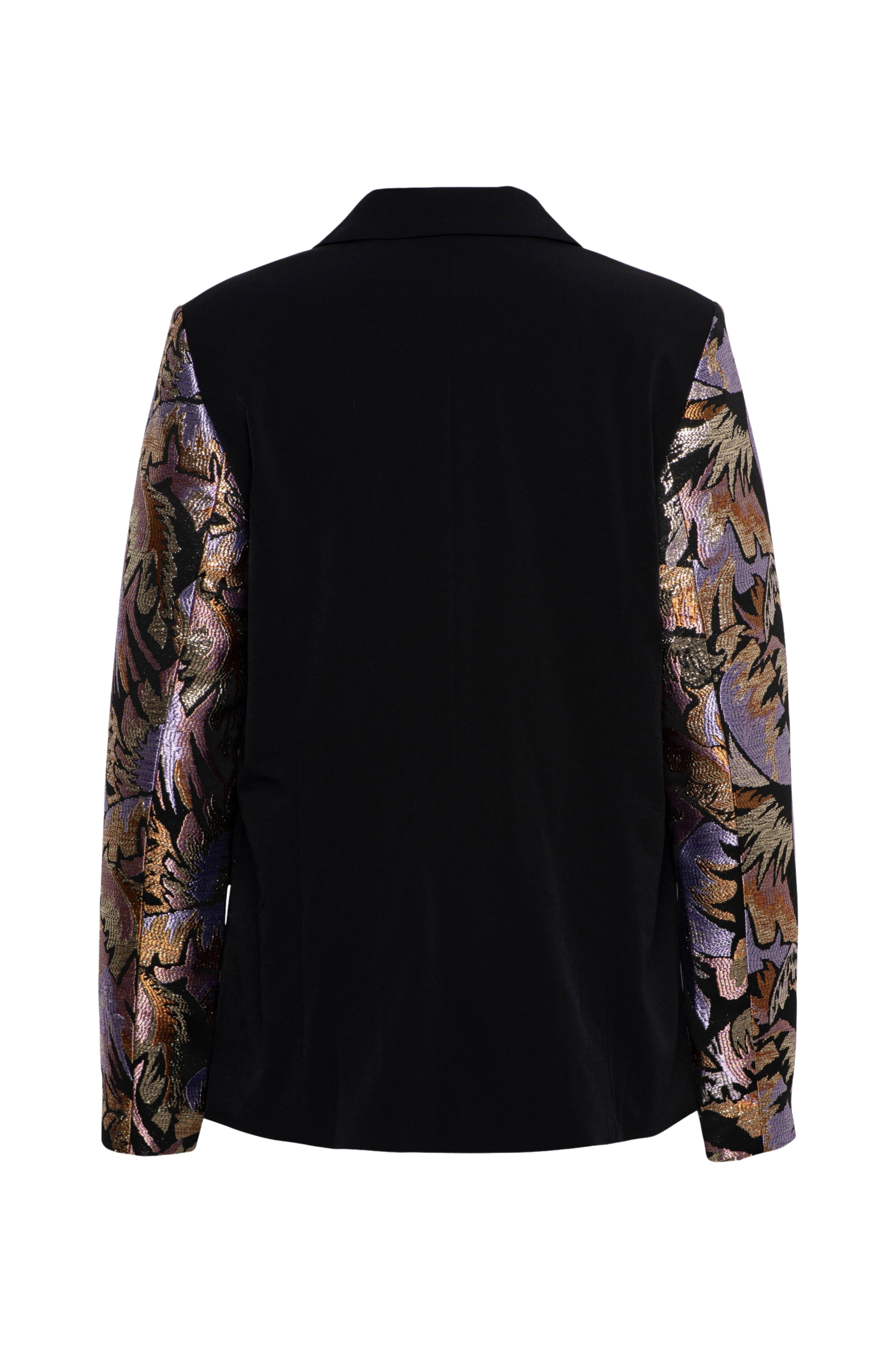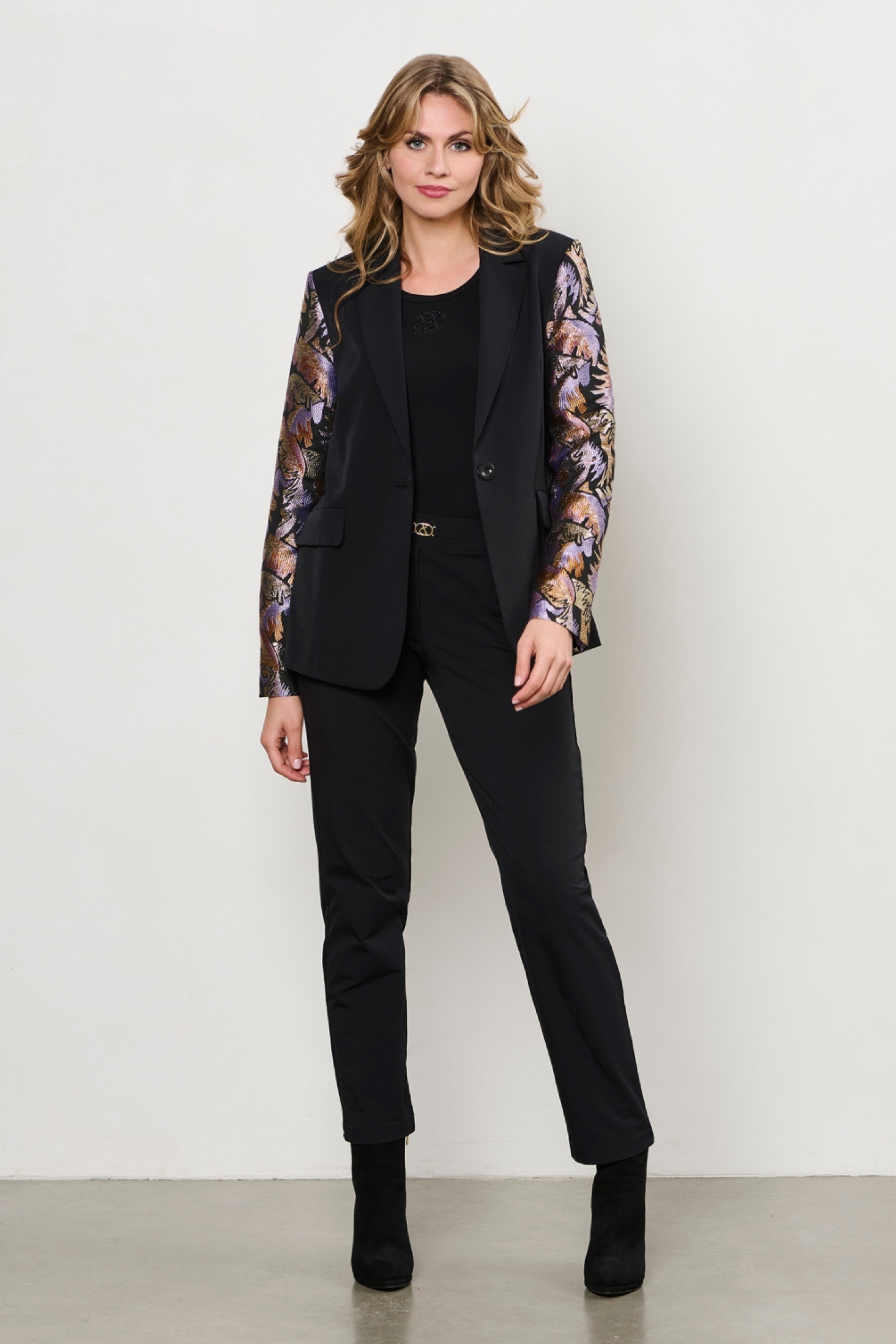 De Blazer Paree Black Multi van &Co Woman is een elegante zwarte blazer met een rechte fit en opvallende jacquardmouwen met glanzende multicolor print. Een echte eyecatcher die elke outfit direct een feestelijke upgrade geeft.