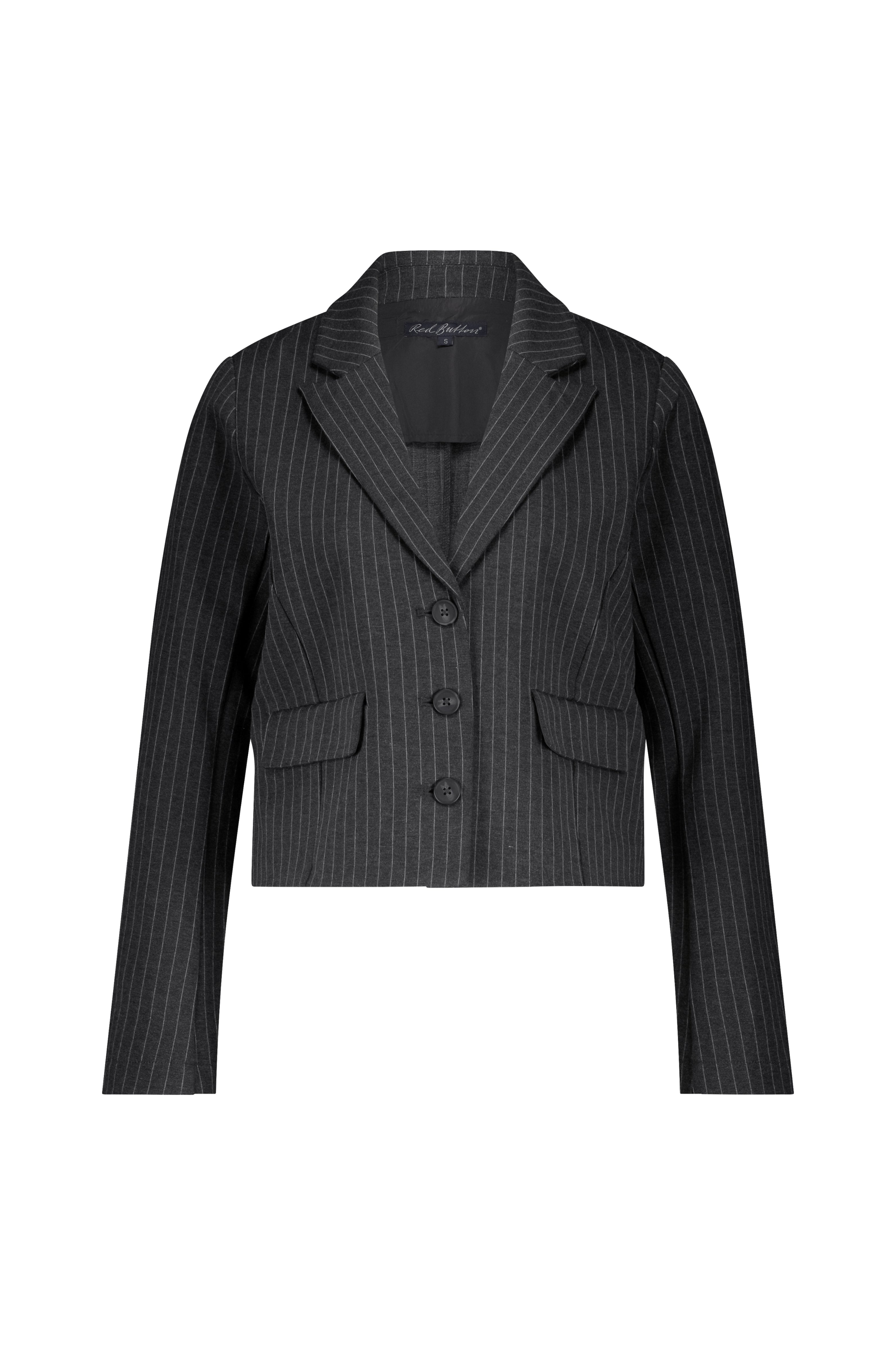 De Blazer Punta Pinstripe Grey Melange van Red Button is een stijlvol kort model met subtiele krijtstreep. De reverskraag en knoopsluiting geven een klassieke touch, terwijl de klepzakken zorgen voor een tijdloze afwerking.