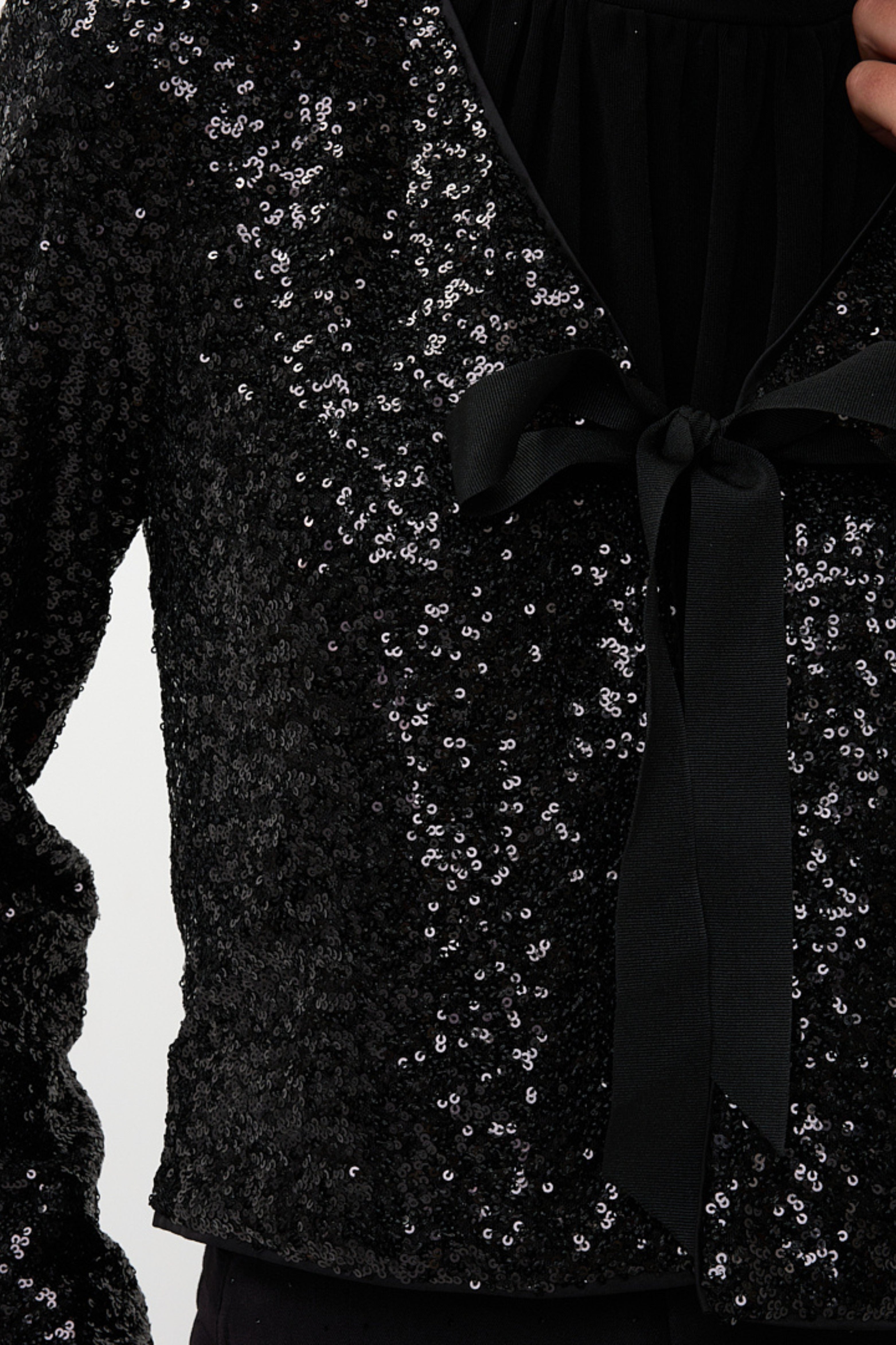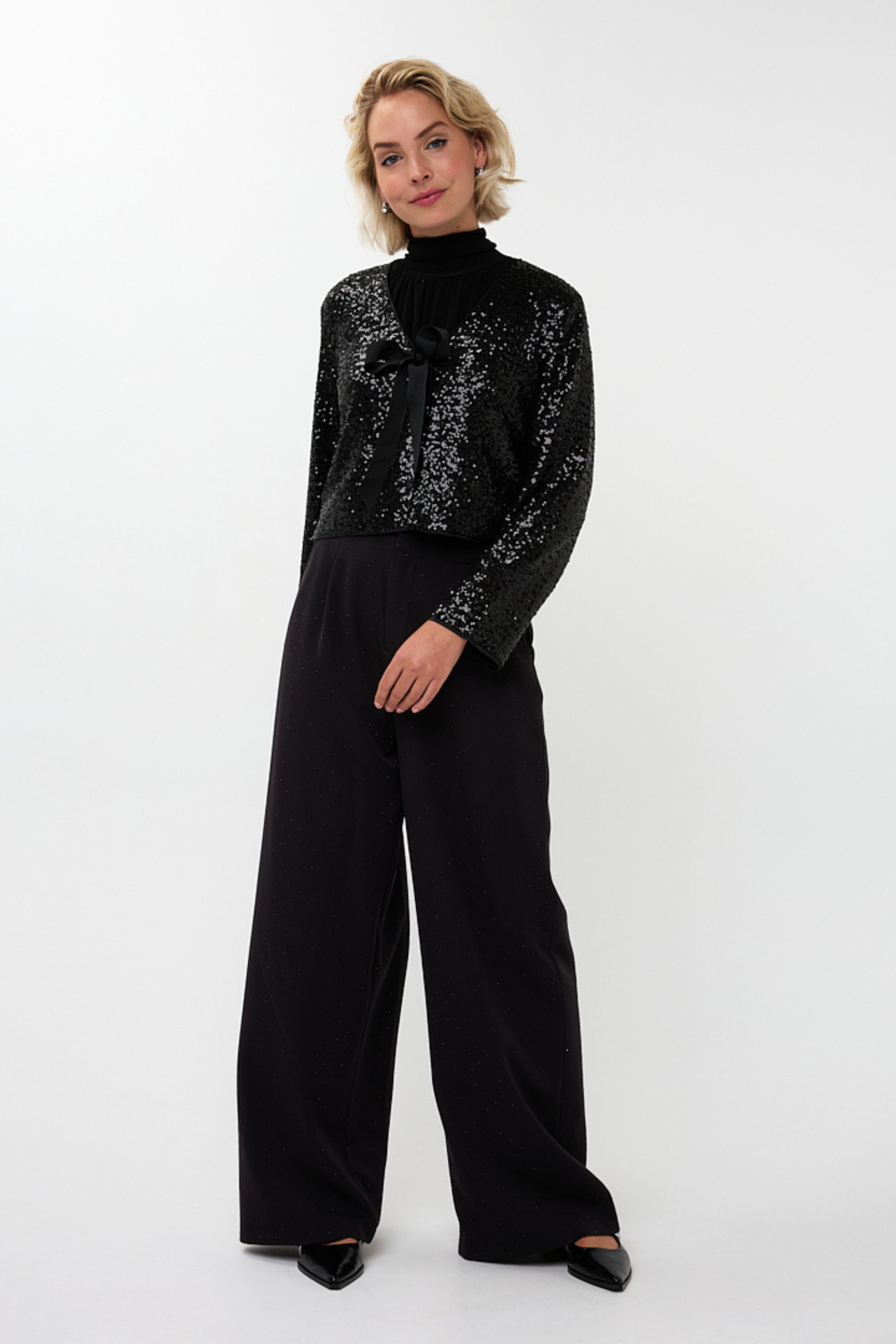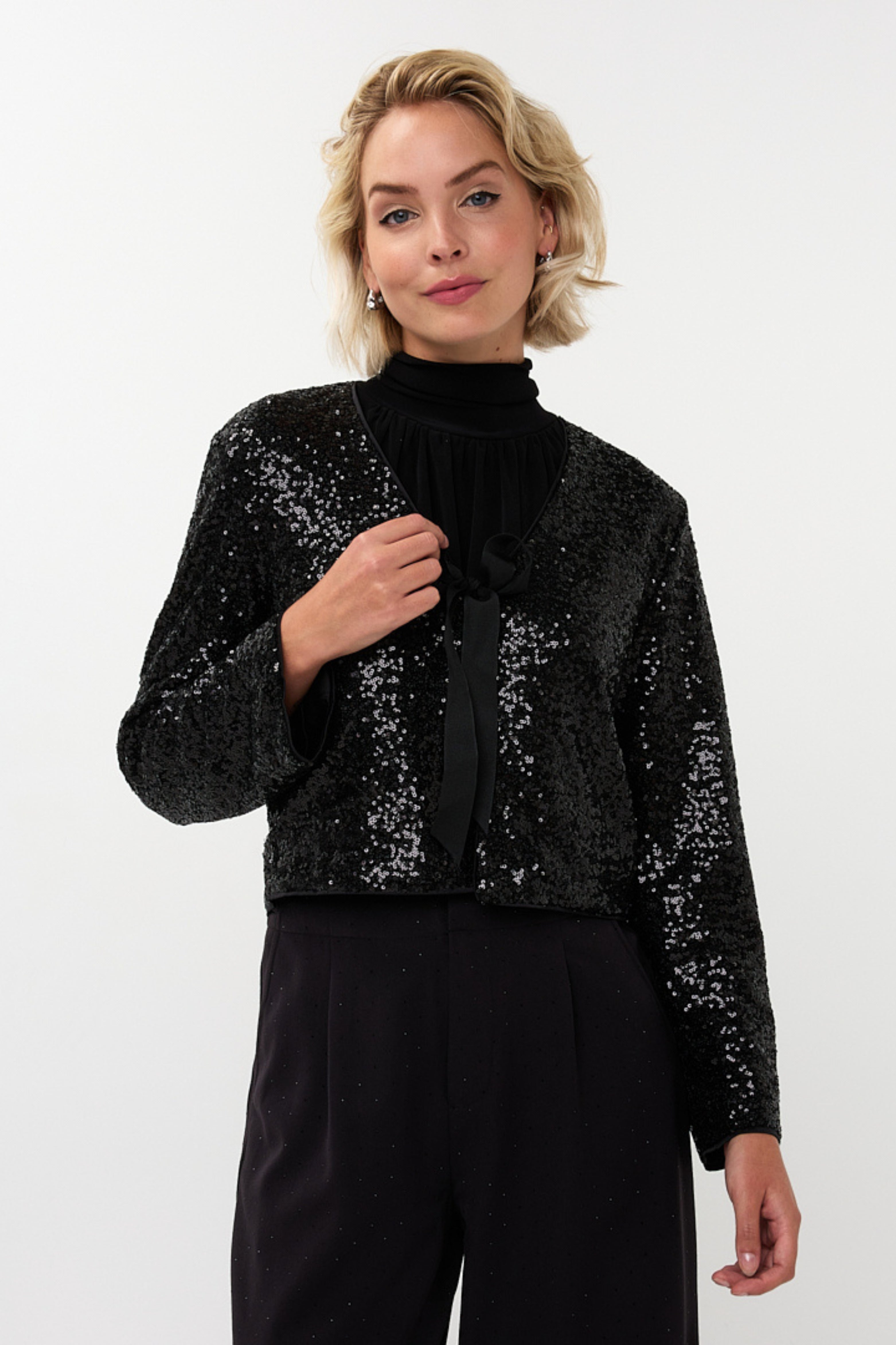 De Blazer Short Bow Black van Esqualo is een elegante en feestelijke blazer die direct een luxe uitstraling geeft. De sprankelende pailletten en de striksluiting maken dit korte model perfect voor speciale gelegenheden.