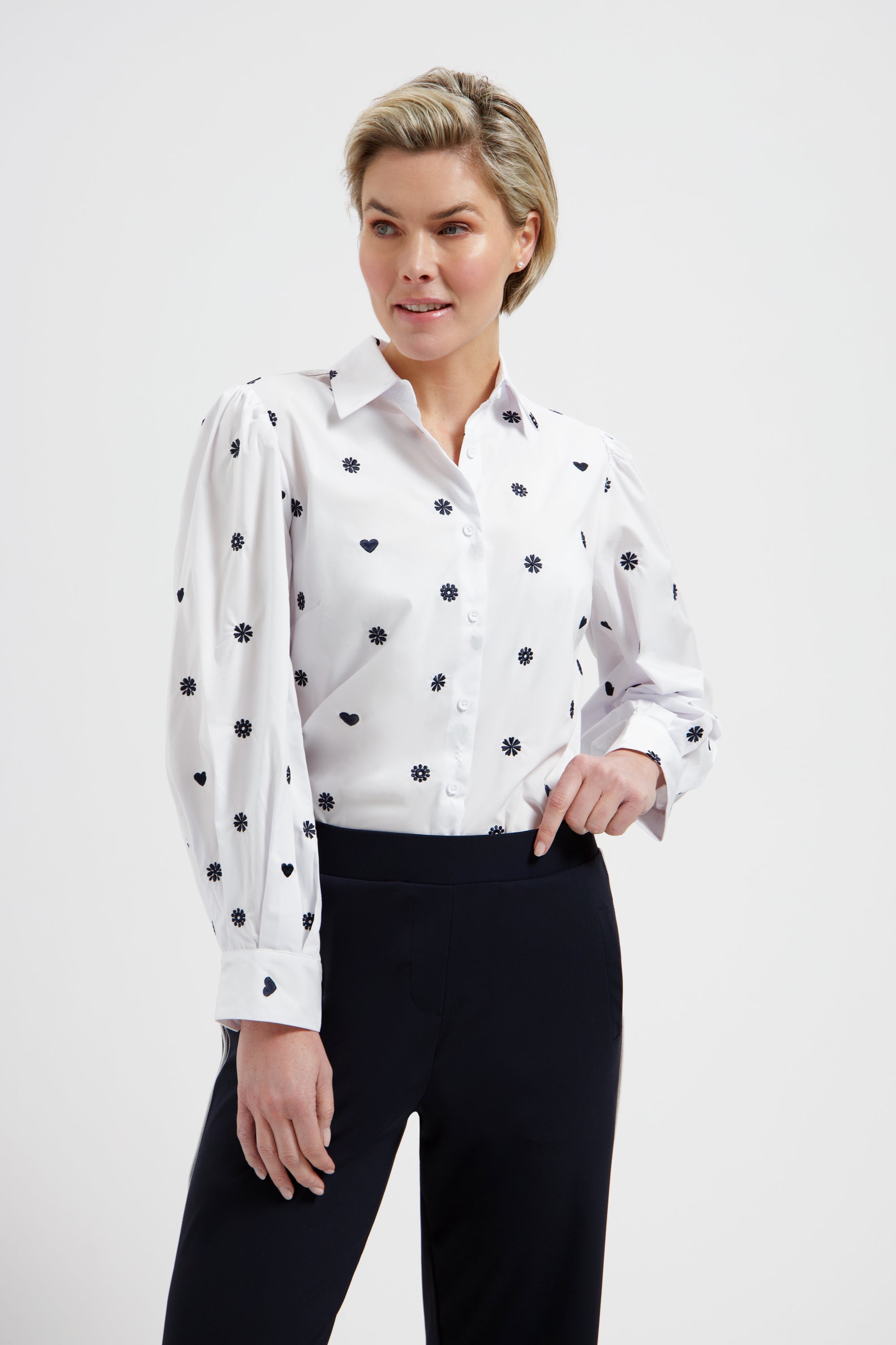 De Blouse Andrea Simple White van Lady Day is een vrouwelijke blouse met klassieke kraag. Luchtige stof, pofmouwen en allover hartjesprint. Perfect voor werk en casual looks.