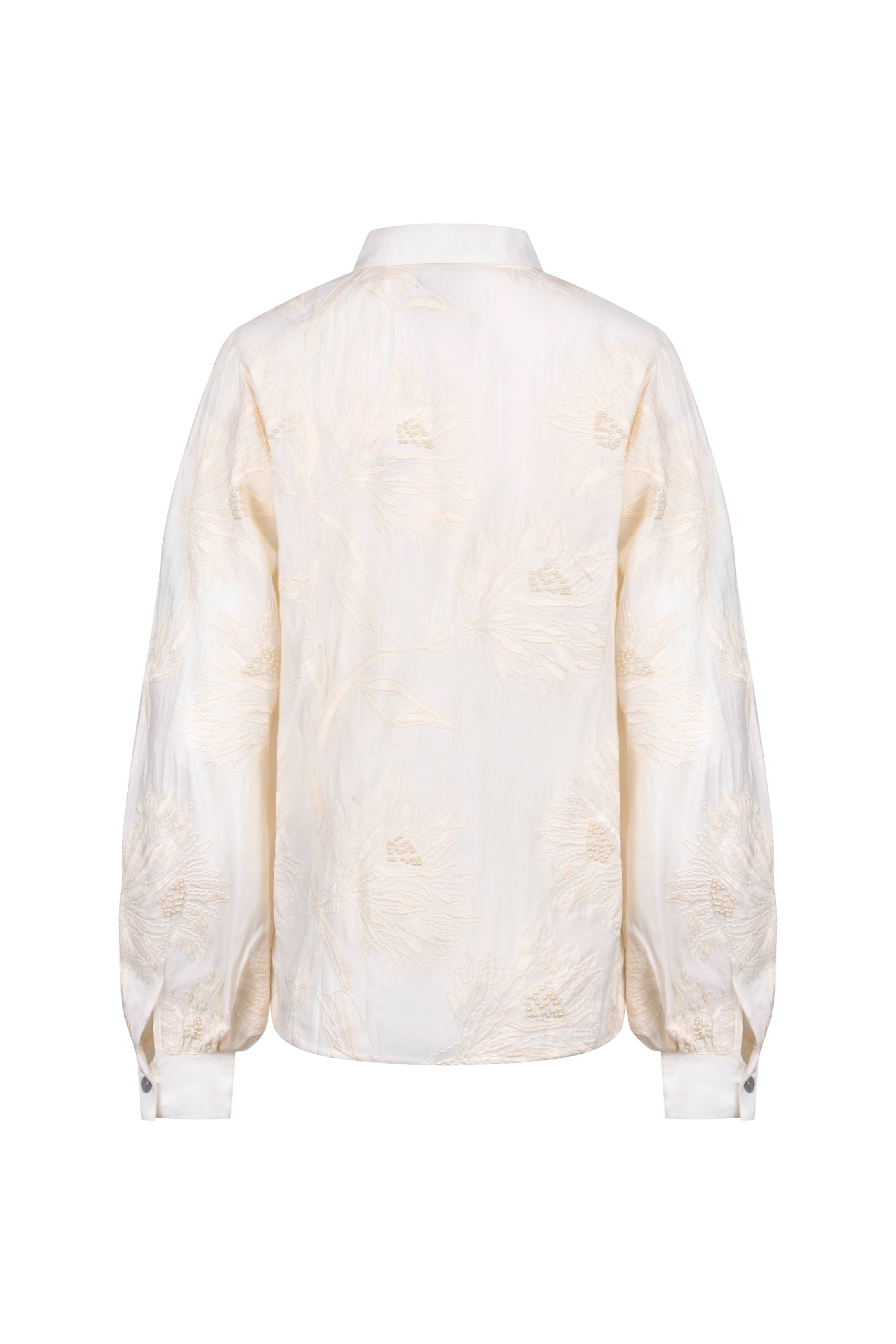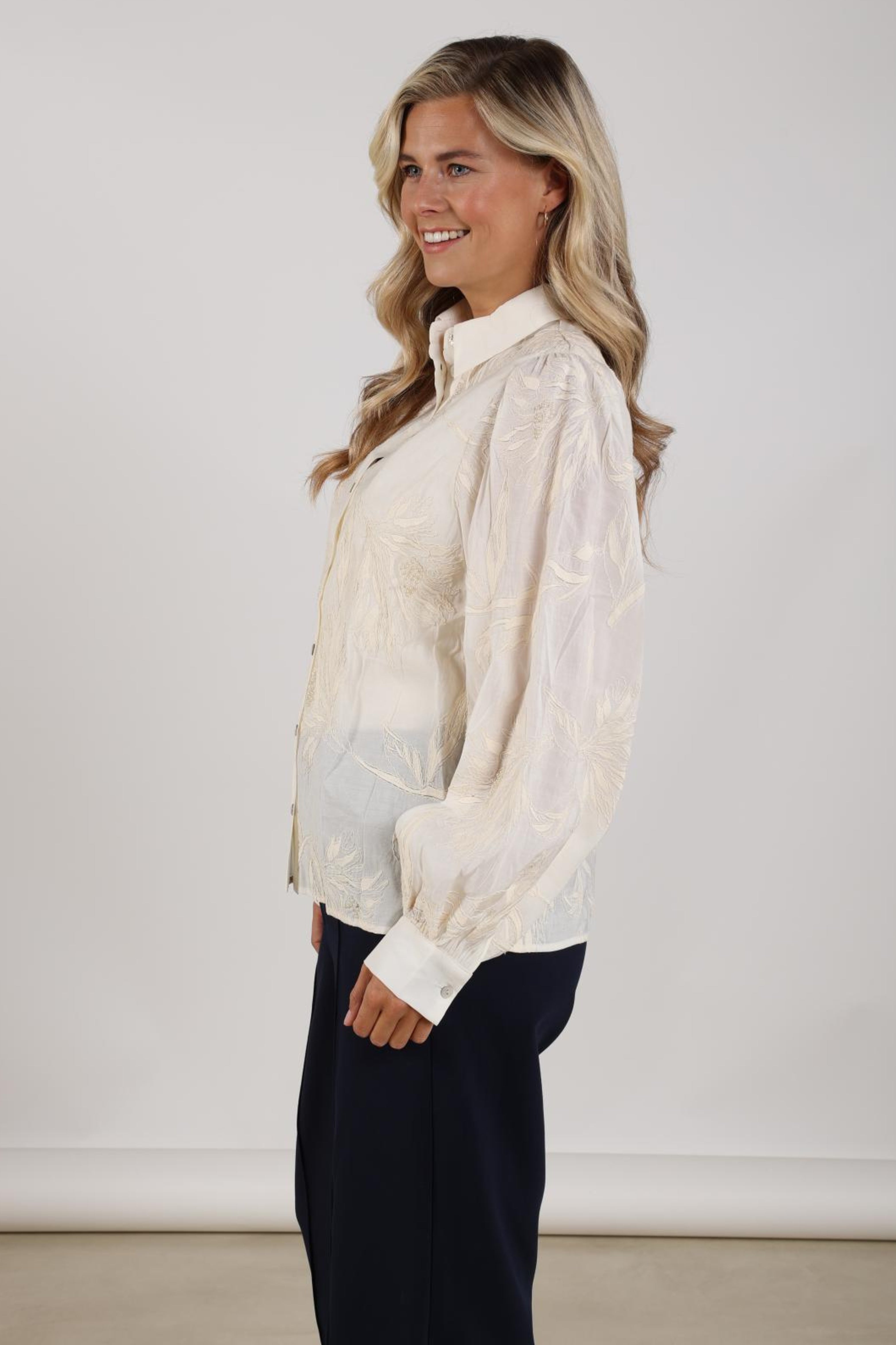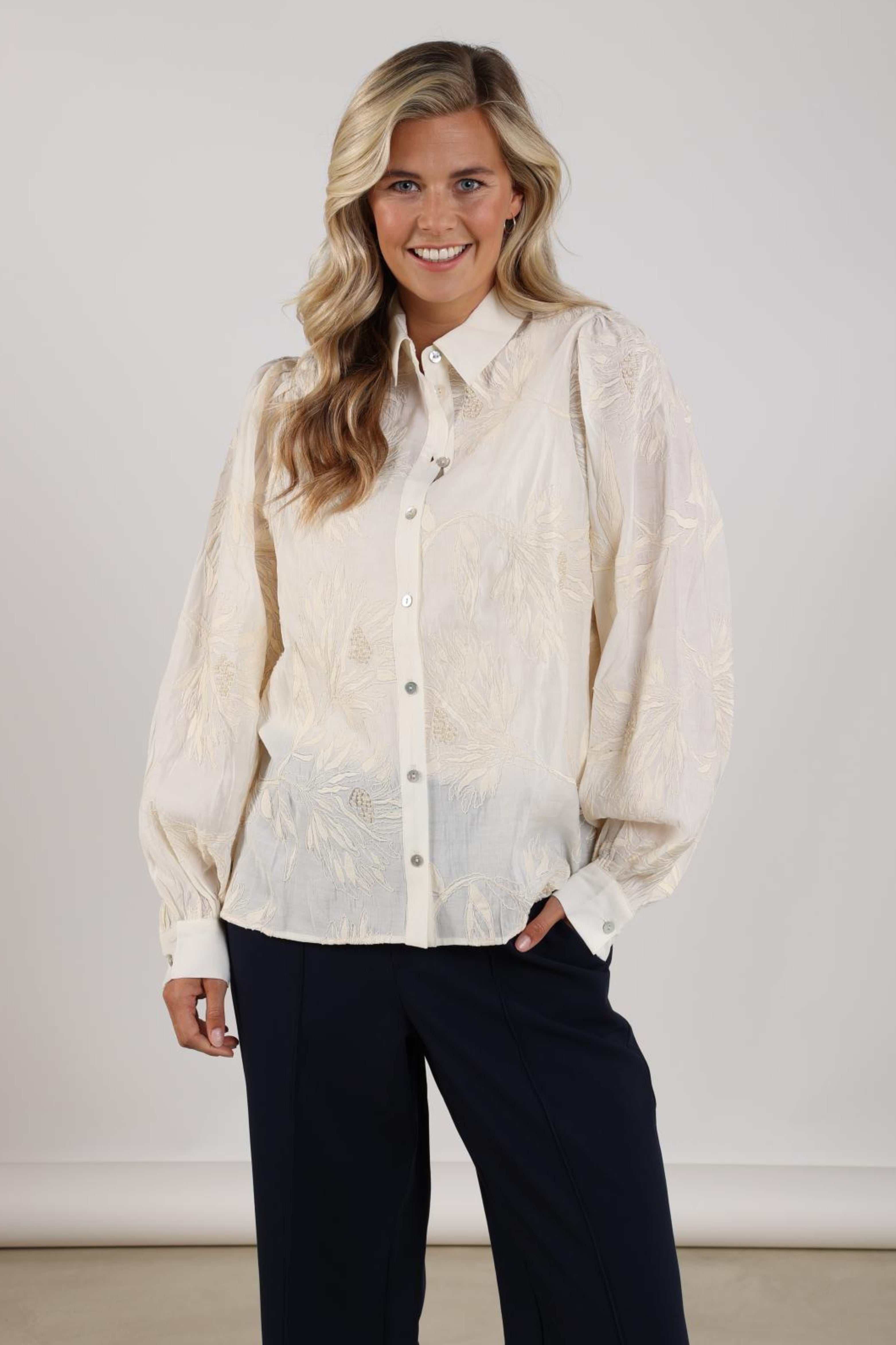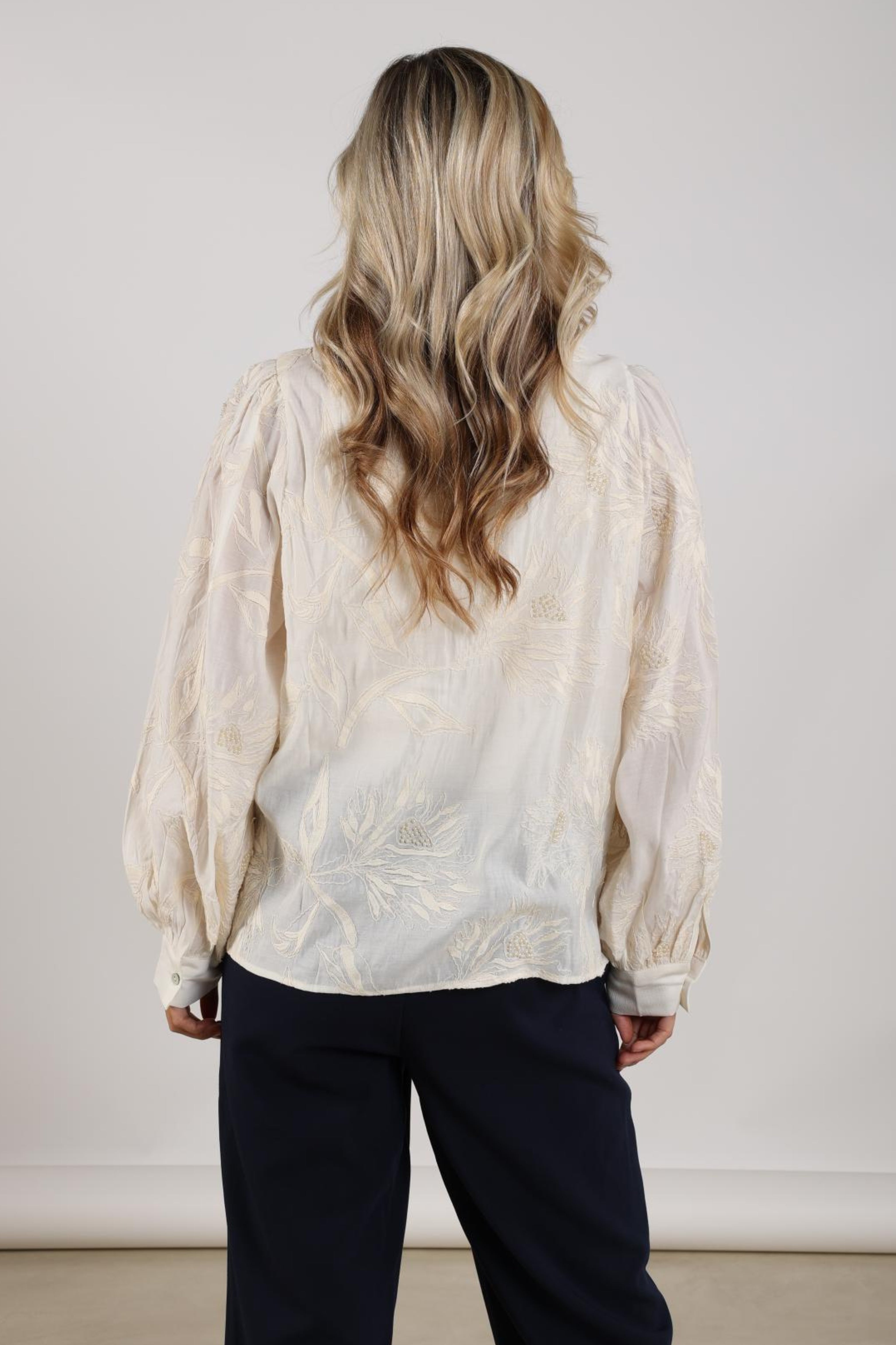 Blouse Avy Embroidery Offwhite van Nukus is een elegante blouse met verfijnde all-over borduursels en een vrouwelijke ballonmouw. De luchtige stof en zachte kleur geven dit item een tijdloze uitstraling en is gemakkelijk te combineren.