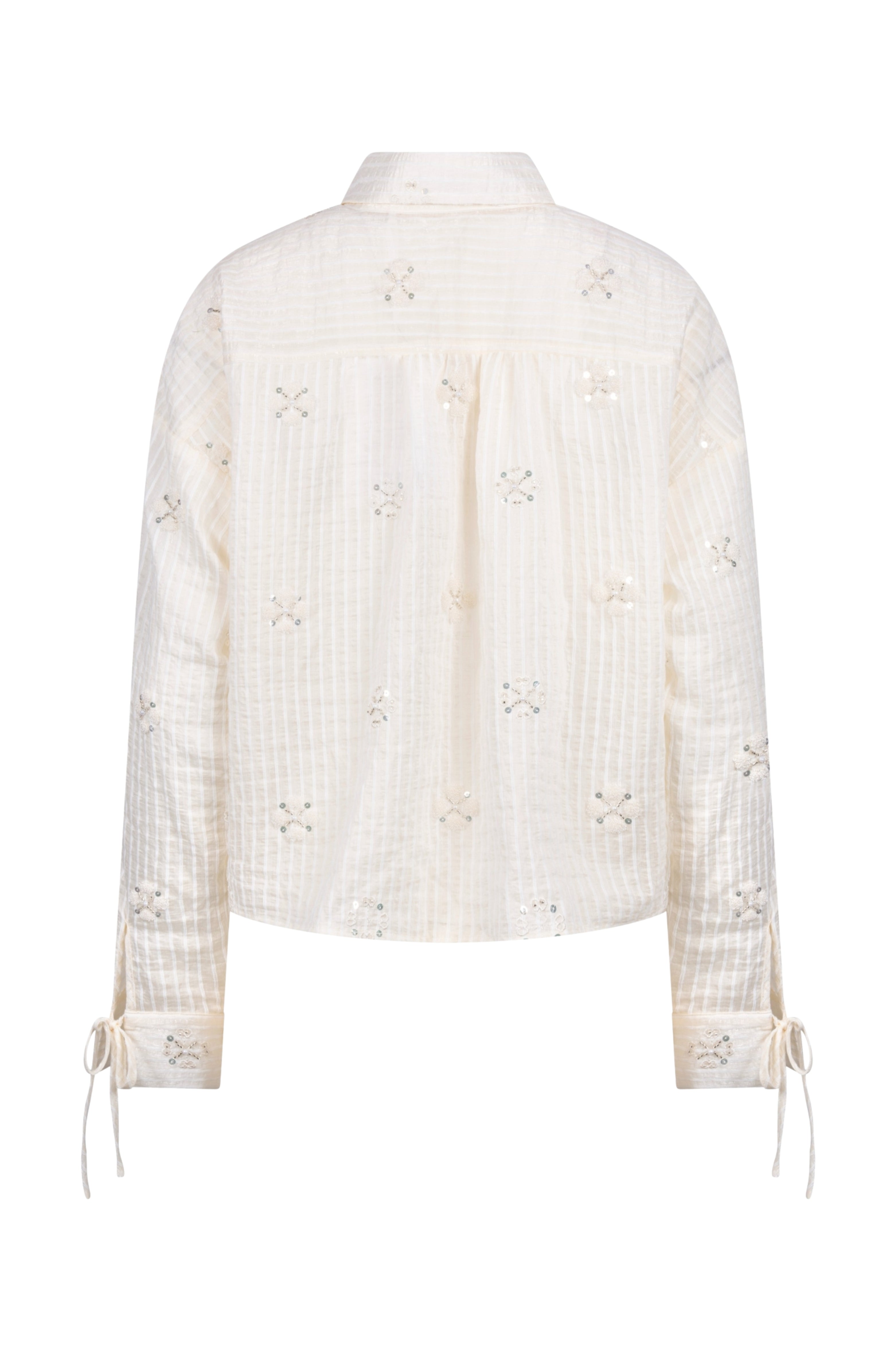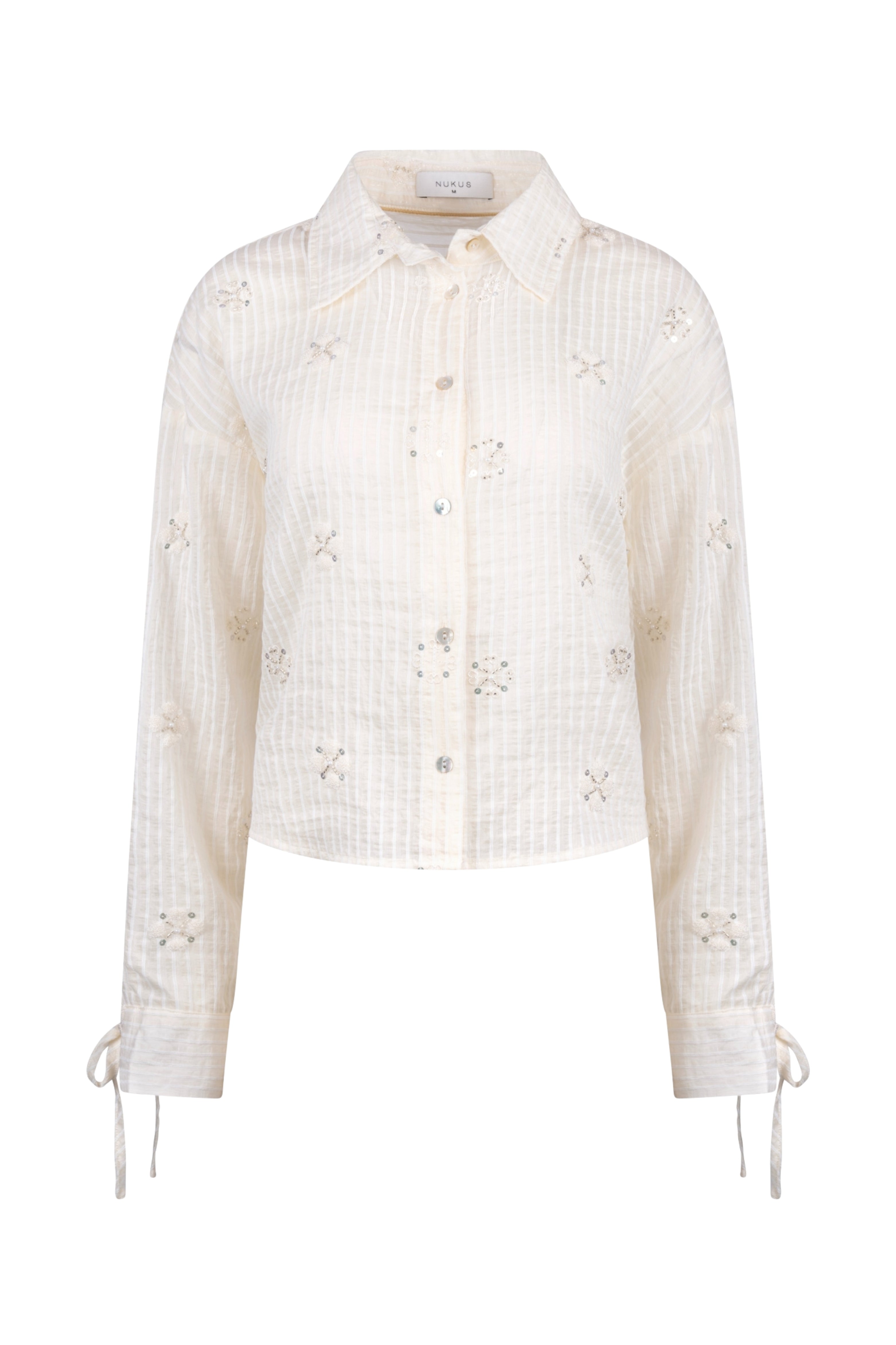 Blouse Bailey Beads Offwhite van Nukus is een stijlvolle blouse met subtiele kralen details en een transparante streepstructuur. De luchtige stof en vrouwelijke afwerking geven dit item een elegant en luxe uitstraling.