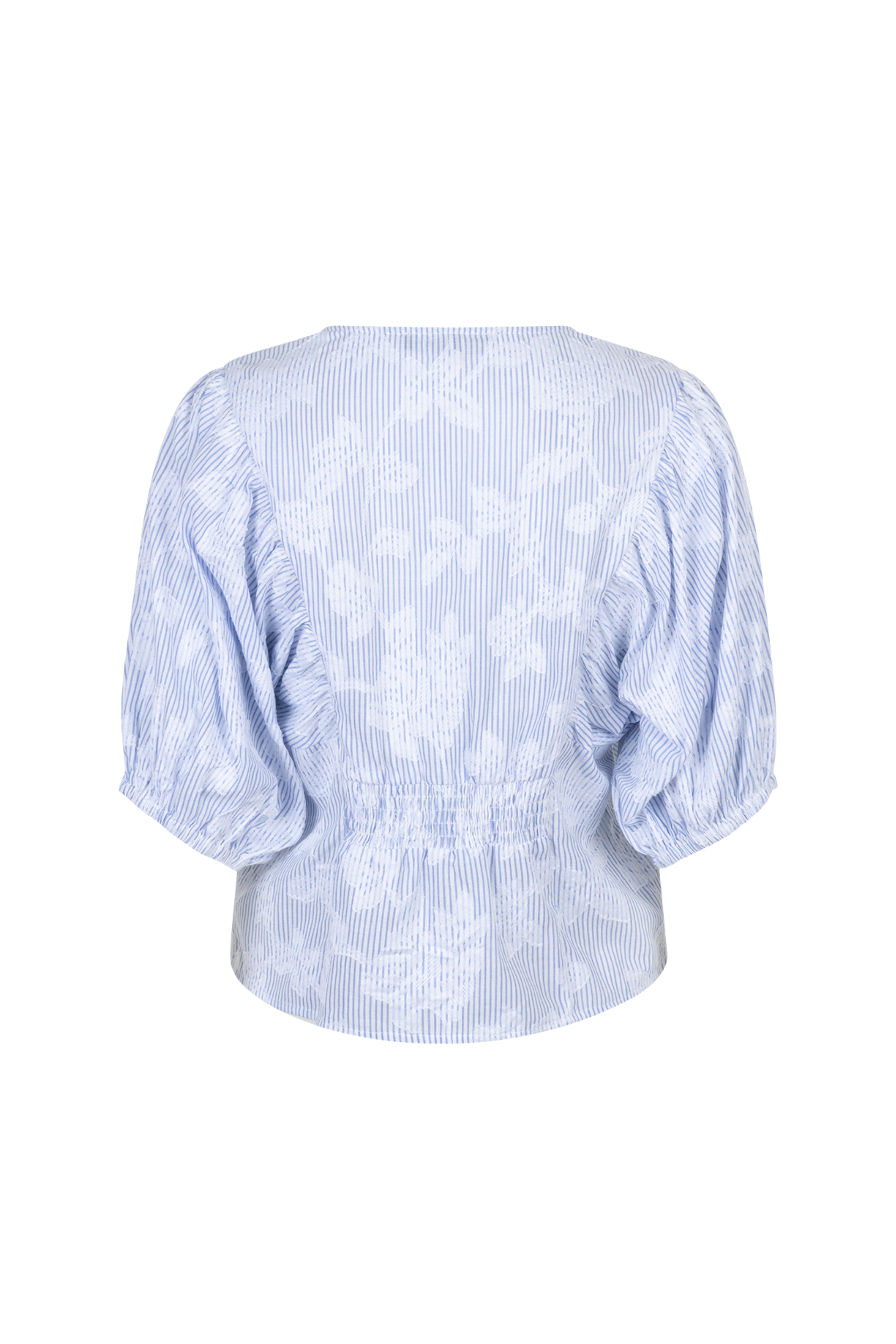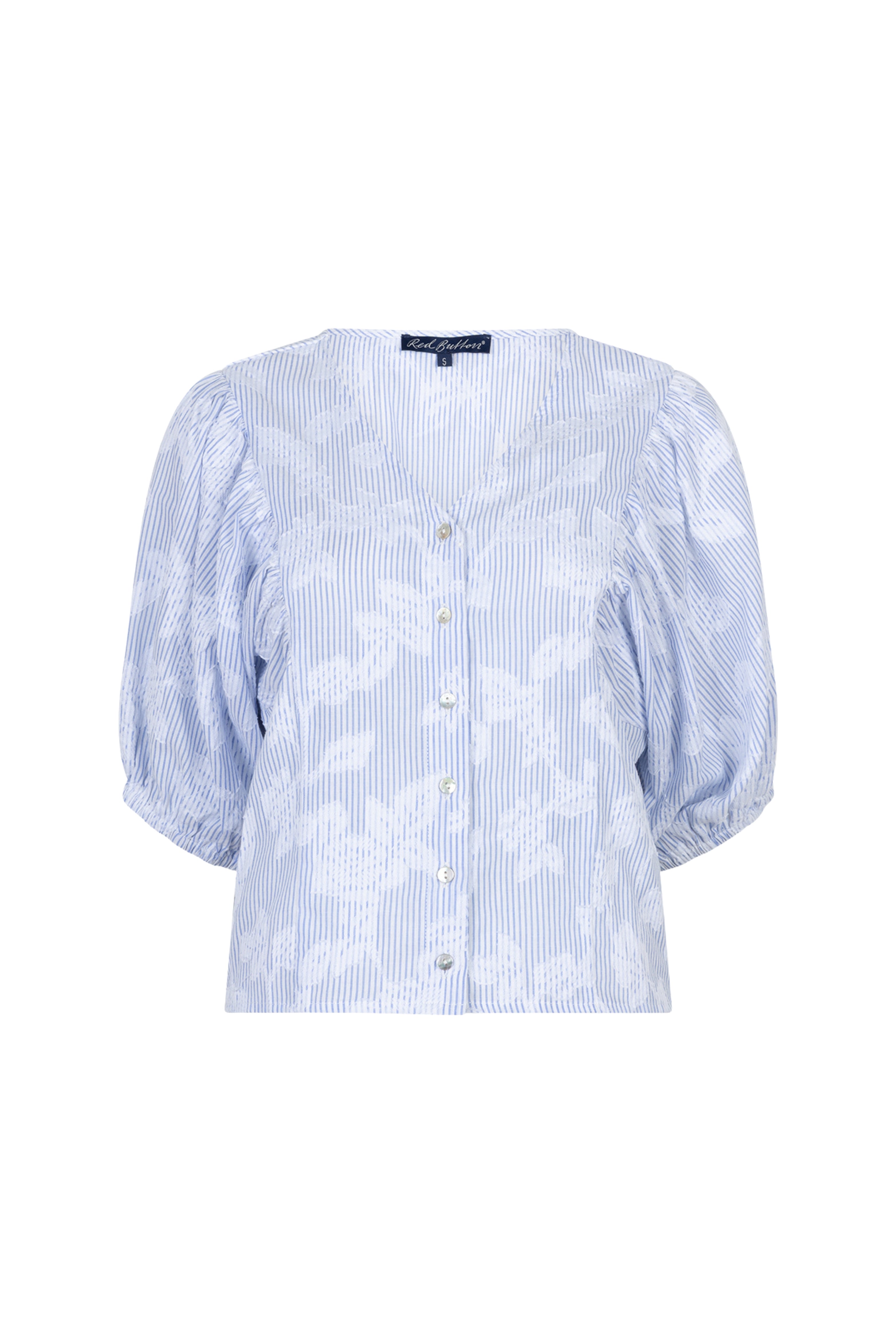 De Blouse Balloonsleeve Stripe & Flower Blue van Red Button combineert fijne blauwe strepen met een subtiele bloemenprint. De ballonmouwen en luchtige stof geven deze blouse een vrouwelijke, zomerse uitstraling die moeiteloos chic en casual te stylen is.