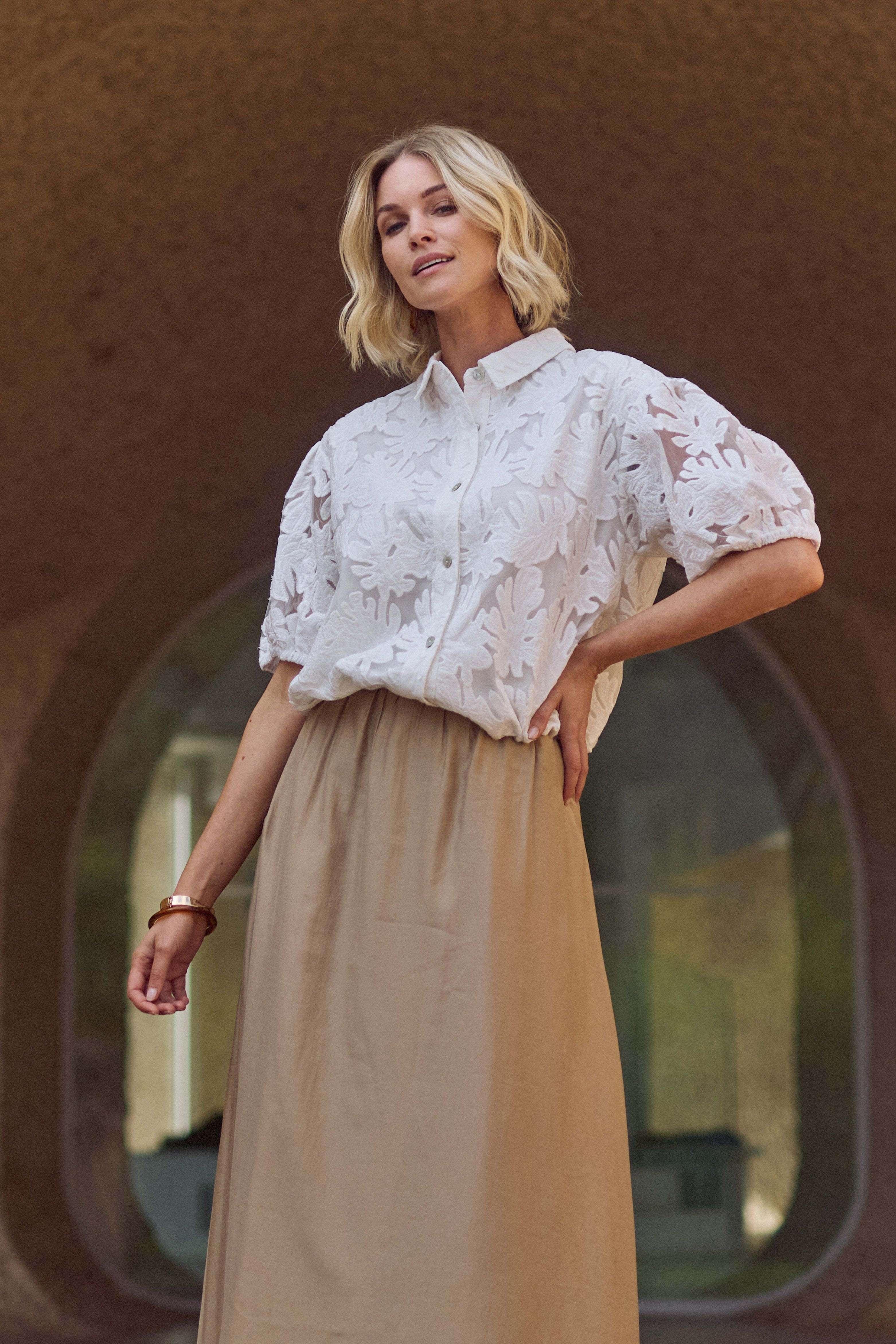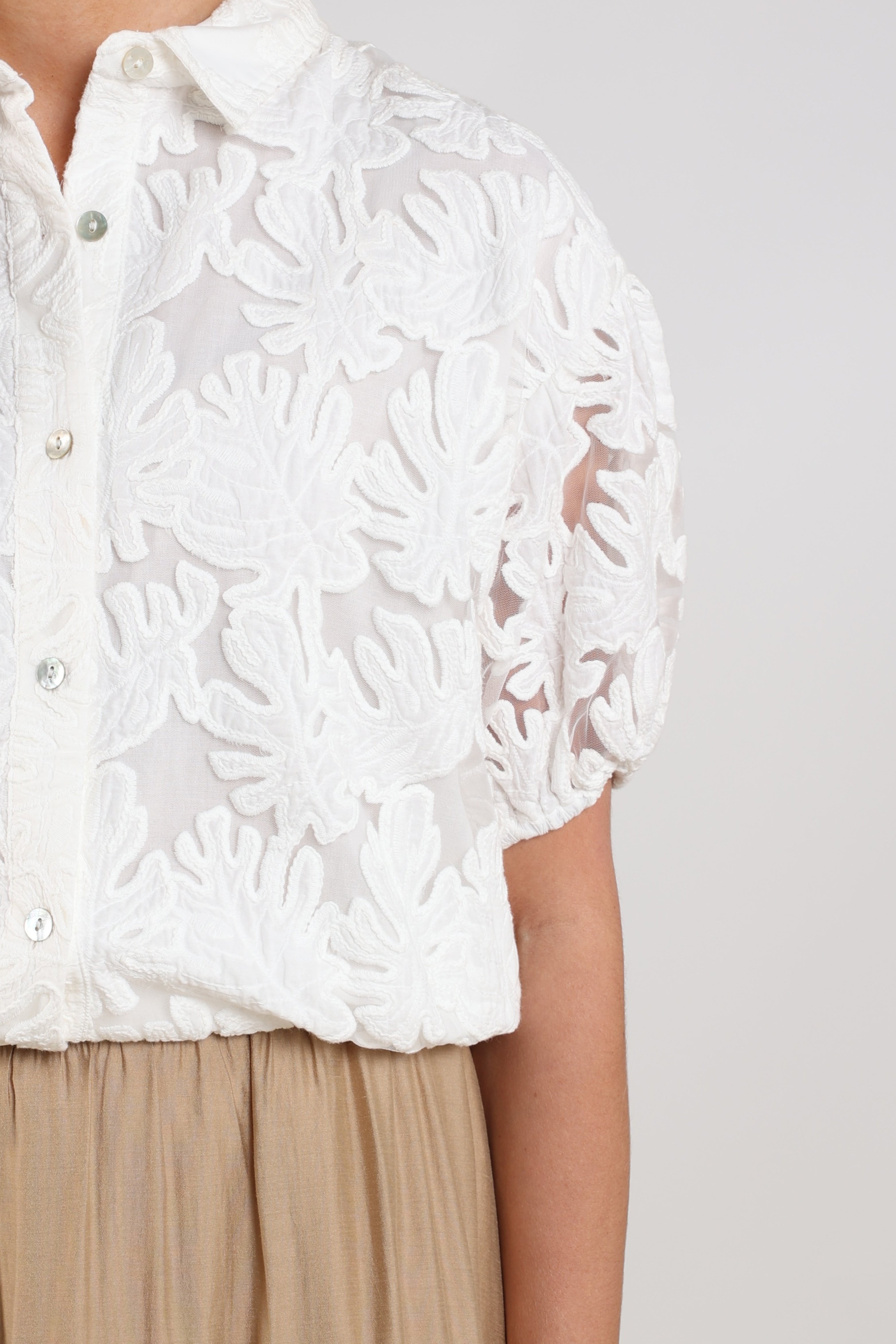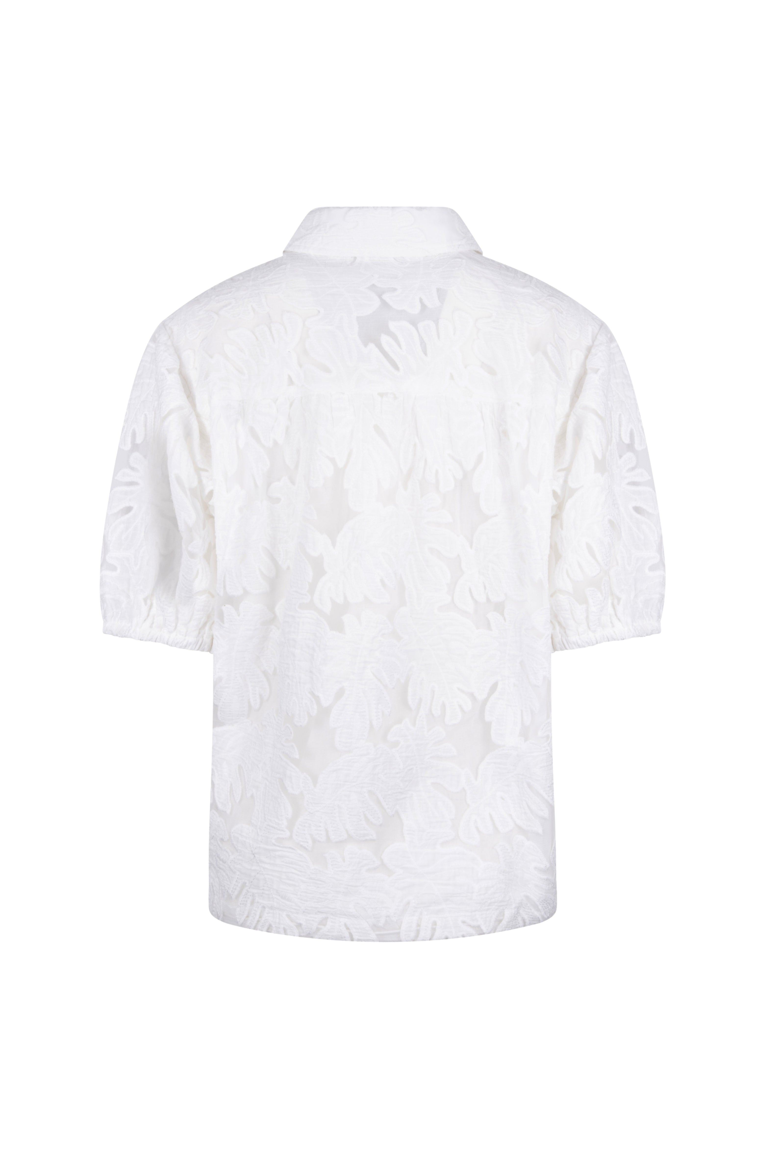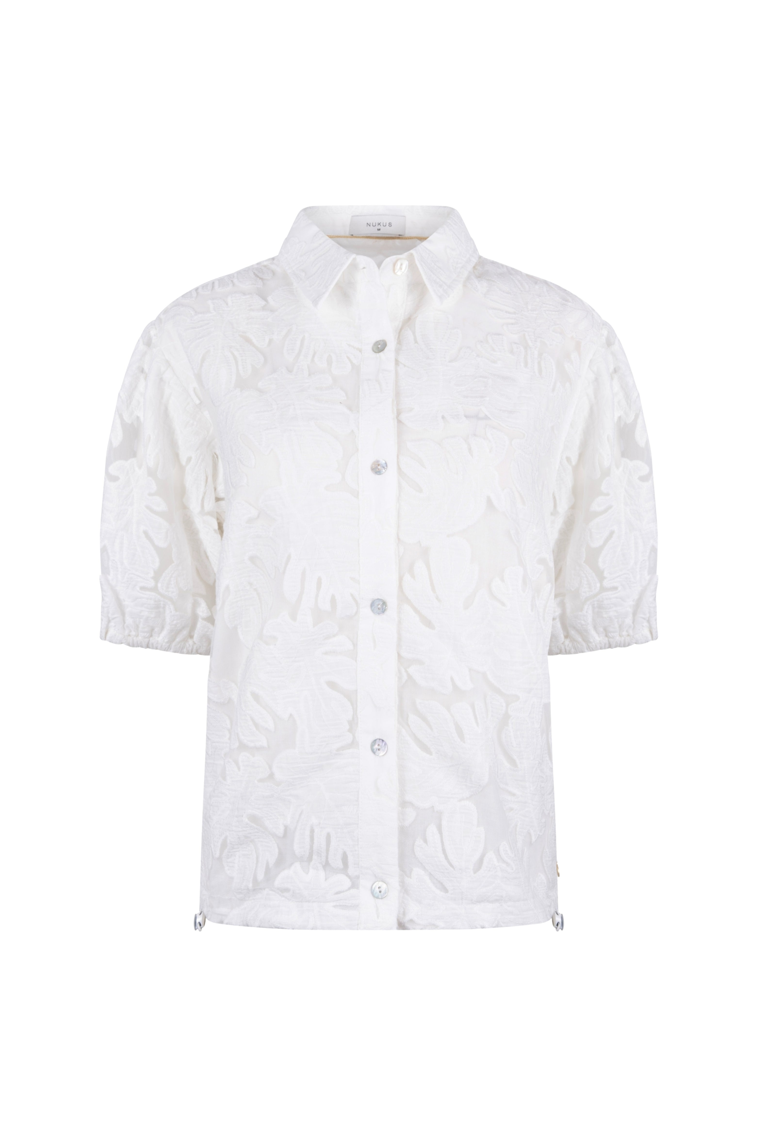 De Blouse Berit Embroidery Offwhite van Nukus is een elegante blouse met verfijnd borduurwerk en een romantische uitstraling. De transparante embroidery stof geeft dit item een luxe touch, terwijl de korte mouwen en klassieke kraag zorgen voor een stijlvolle balans tussen vrouwelijk en modern.