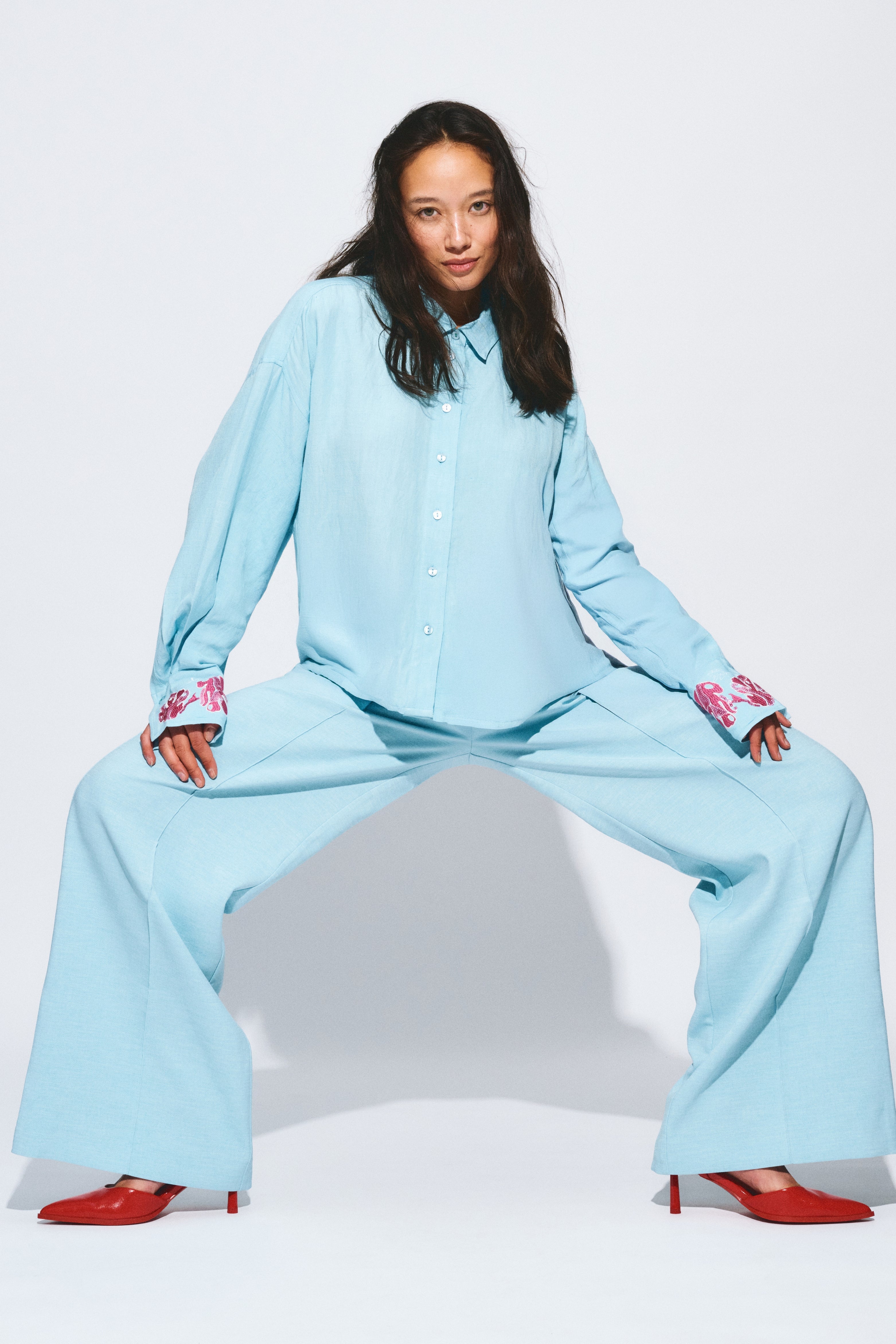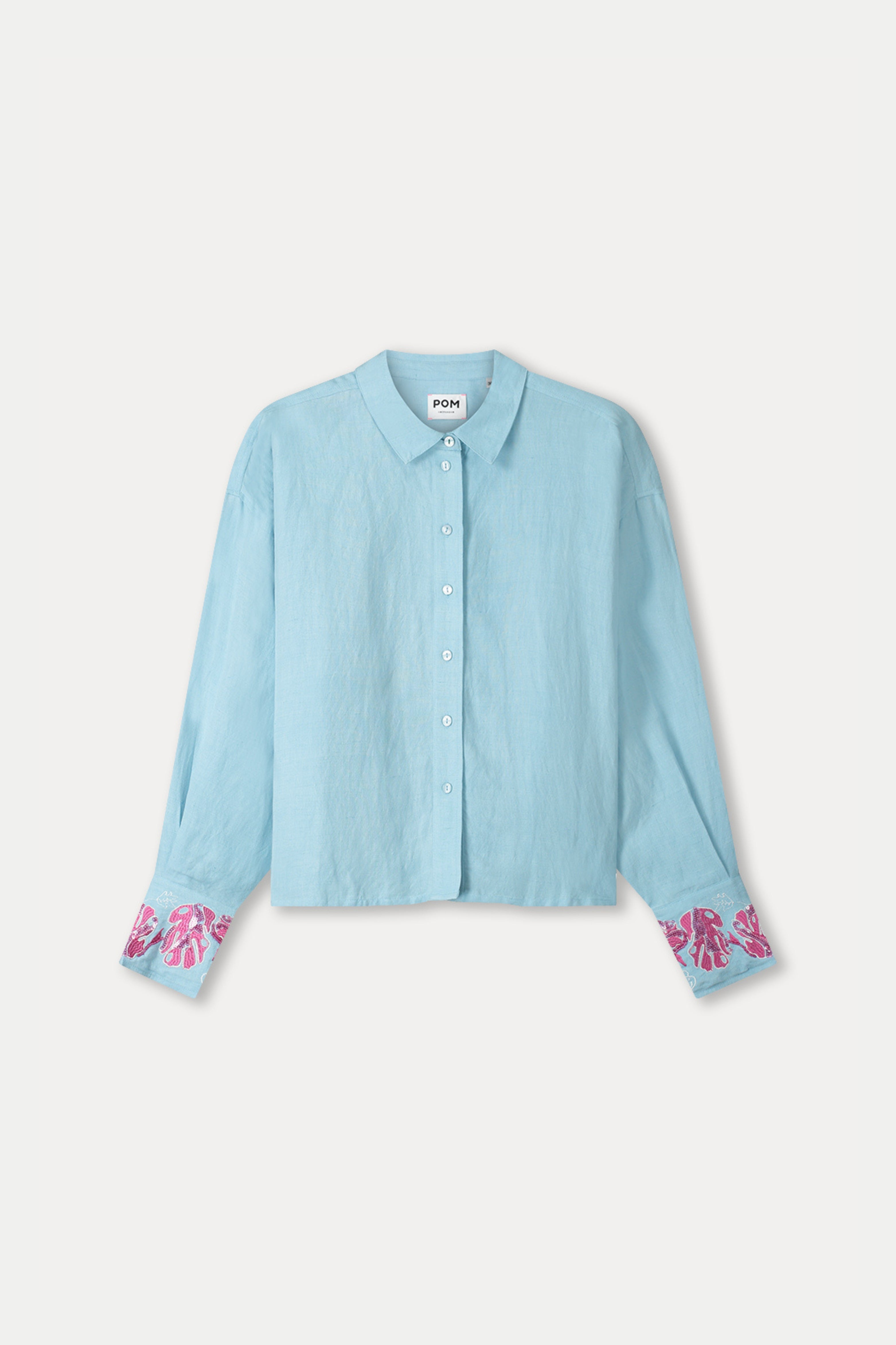 De Blouse Blue Sequins Urban Flora Blue van POM Amsterdam is een lichtblauwe blouse met subtiele knopen en opvallende roze geborduurde manchetten met pailletten. Een fris, elegant model met een speelse twist.