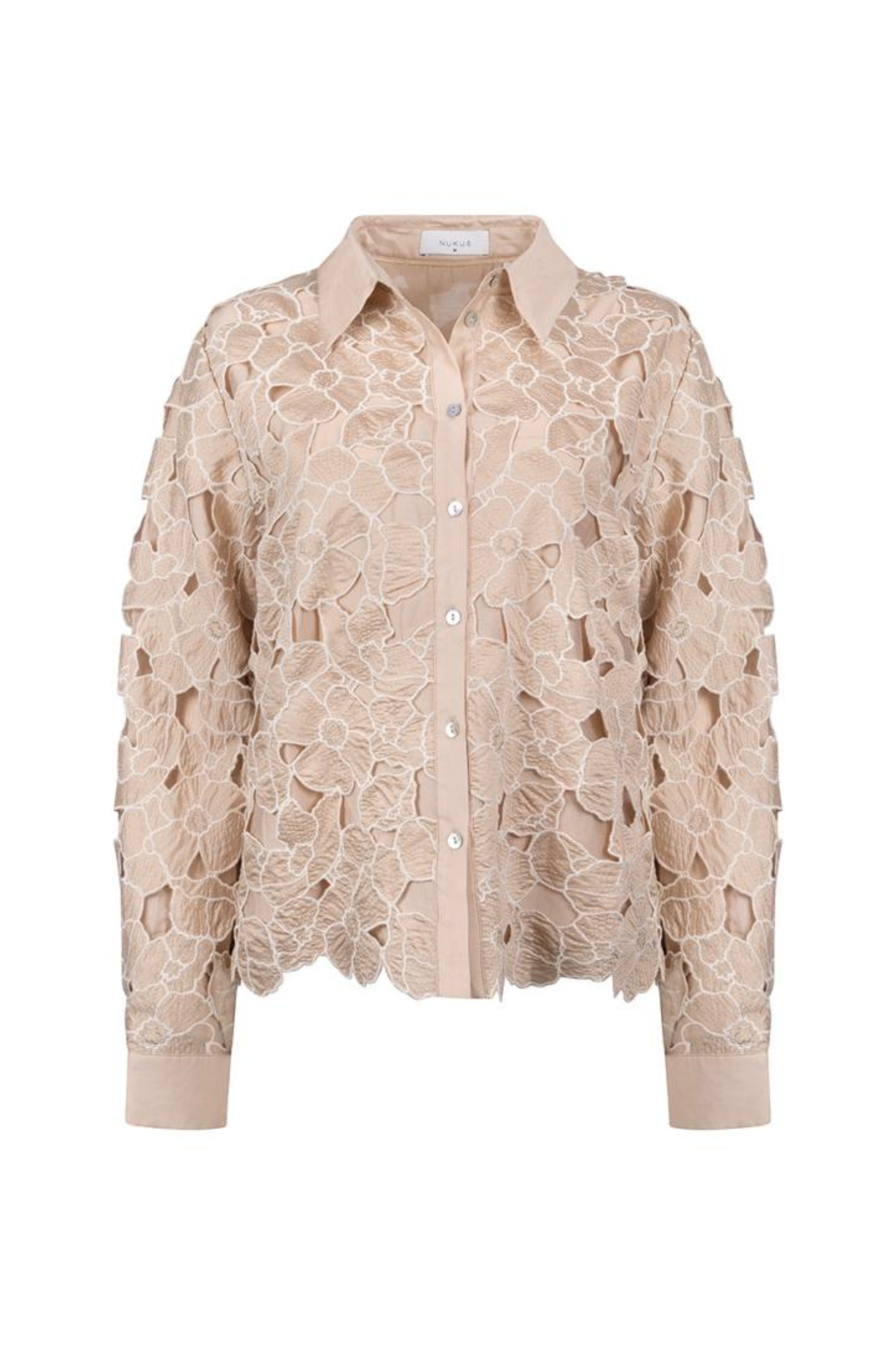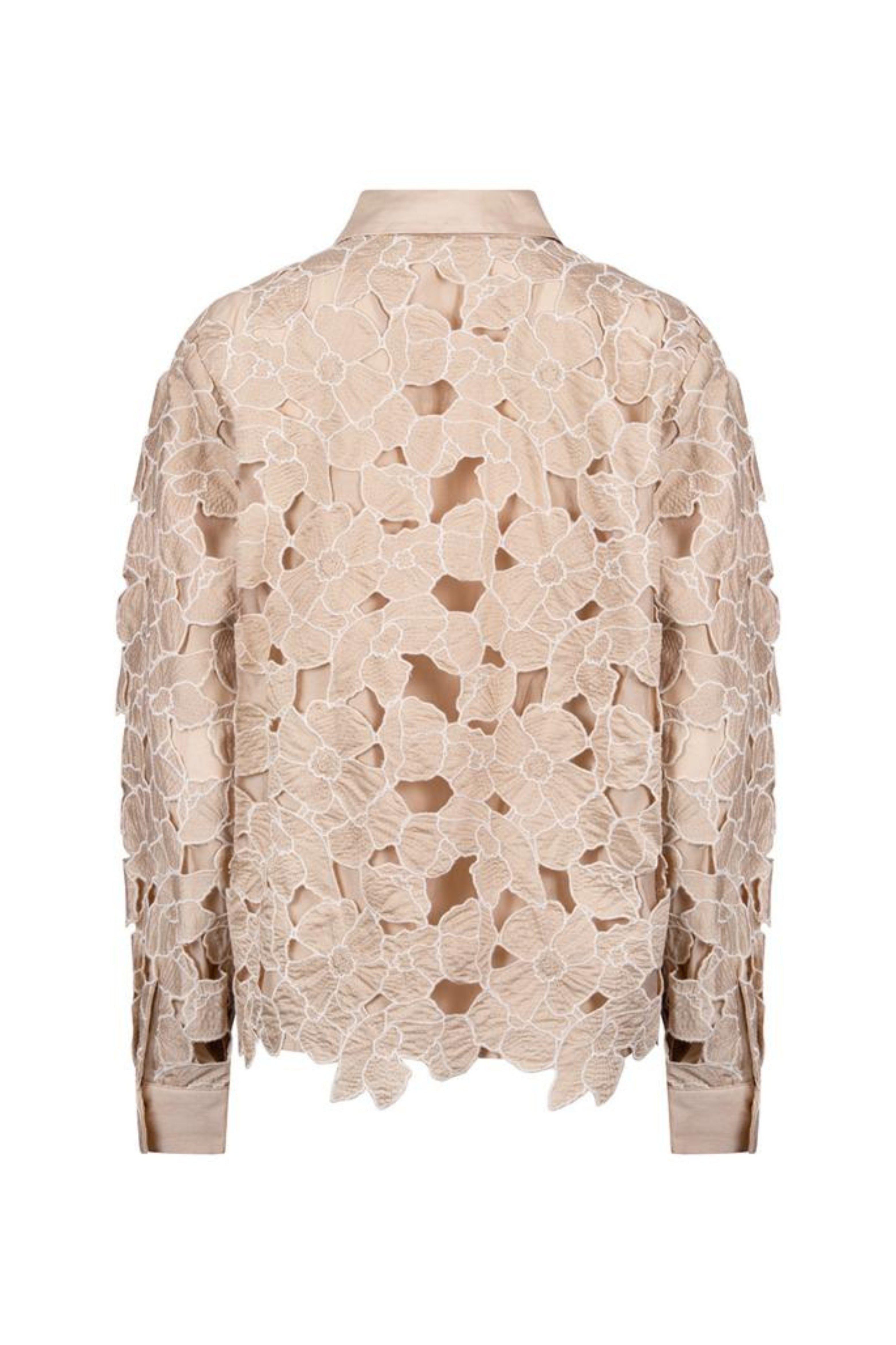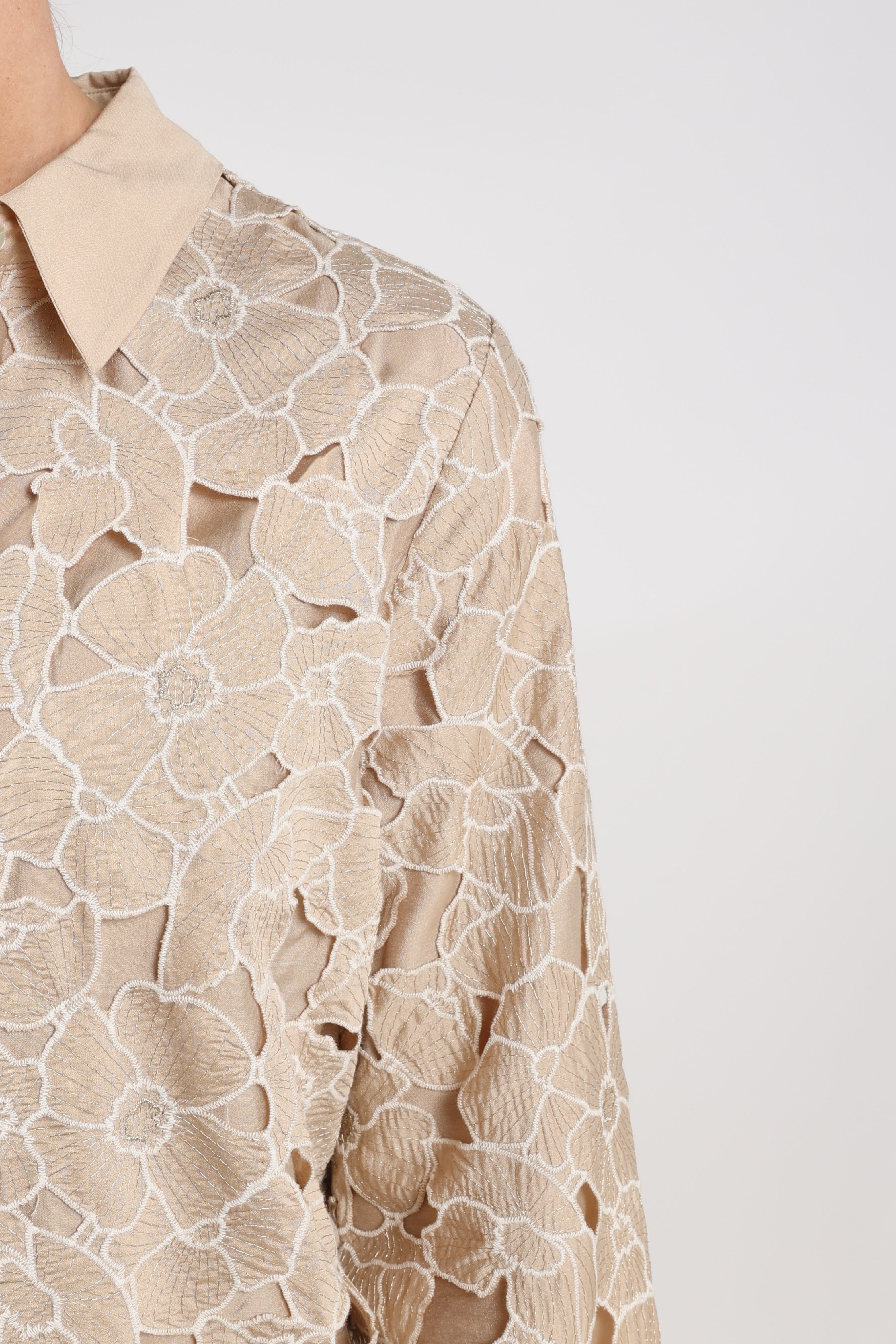 De Blouse Chloe Flower Sand Gold is een elegante blouse met verfijnde bloemenkant in zand- en goudtinten. De klassieke kraag en lange mouwen geven een chique uitstraling, perfect voor zowel feestelijke als geklede looks.