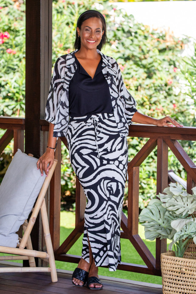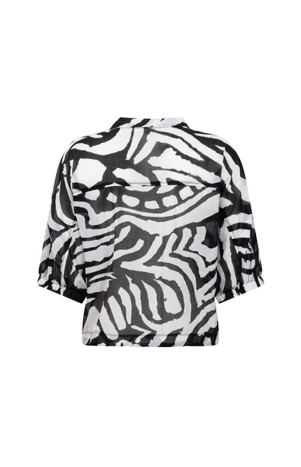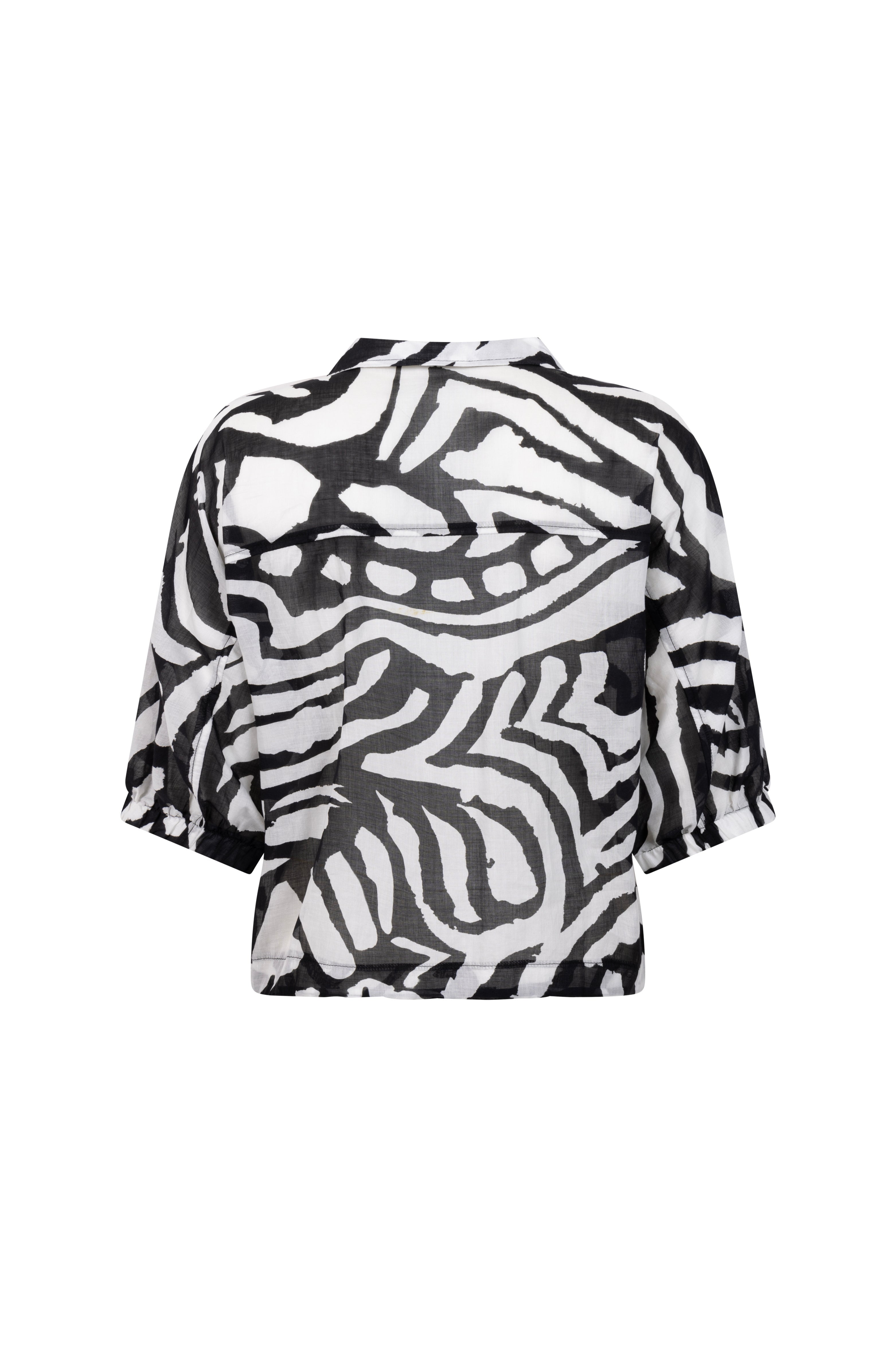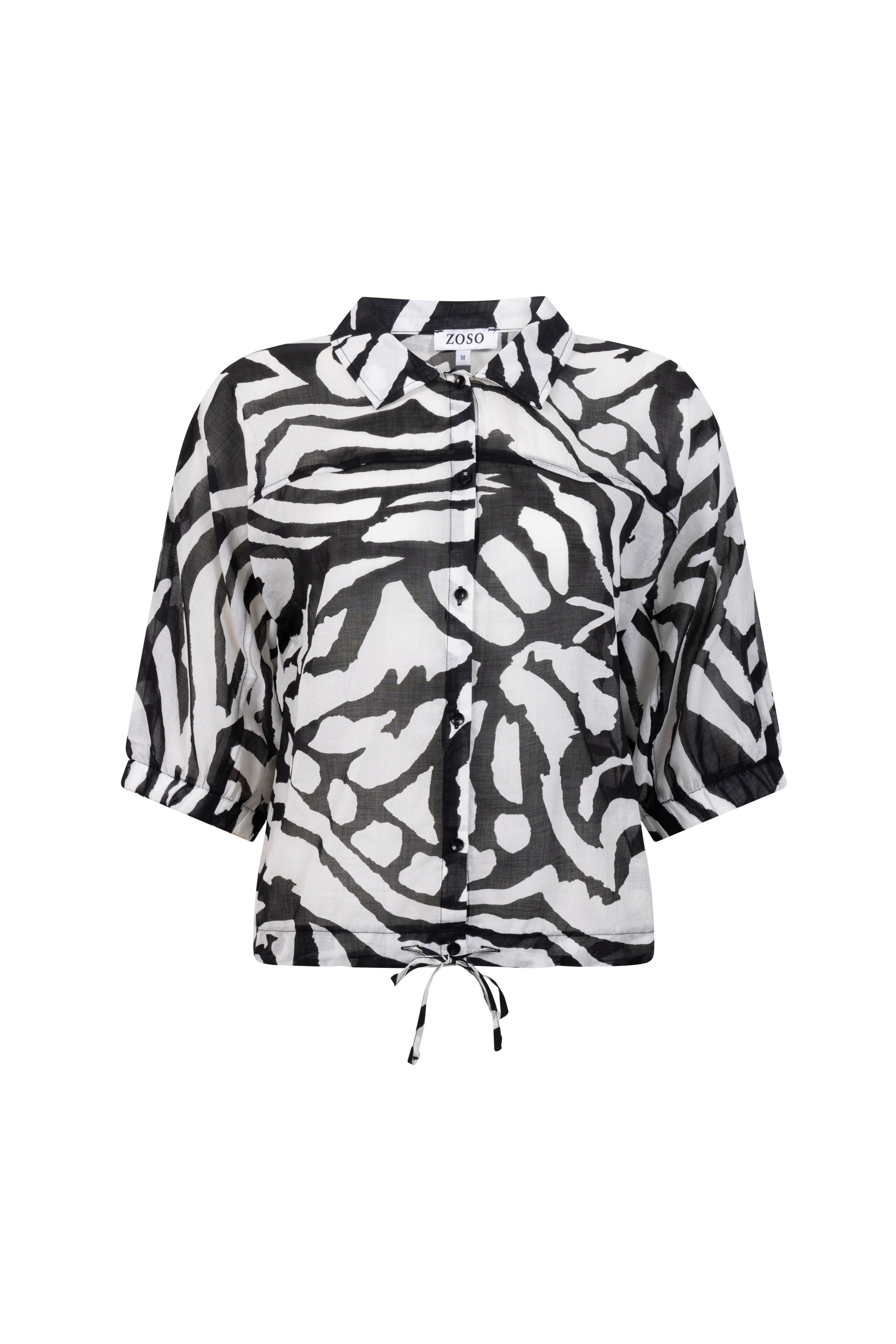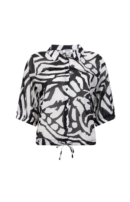 Blouse Ciska Black van Zoso is een luchtige blouse met grafische zwart-witte print, knoopsluiting en strikkoord onderaan. Een stijlvol item dat je moeiteloos op een broek of rok draagt.