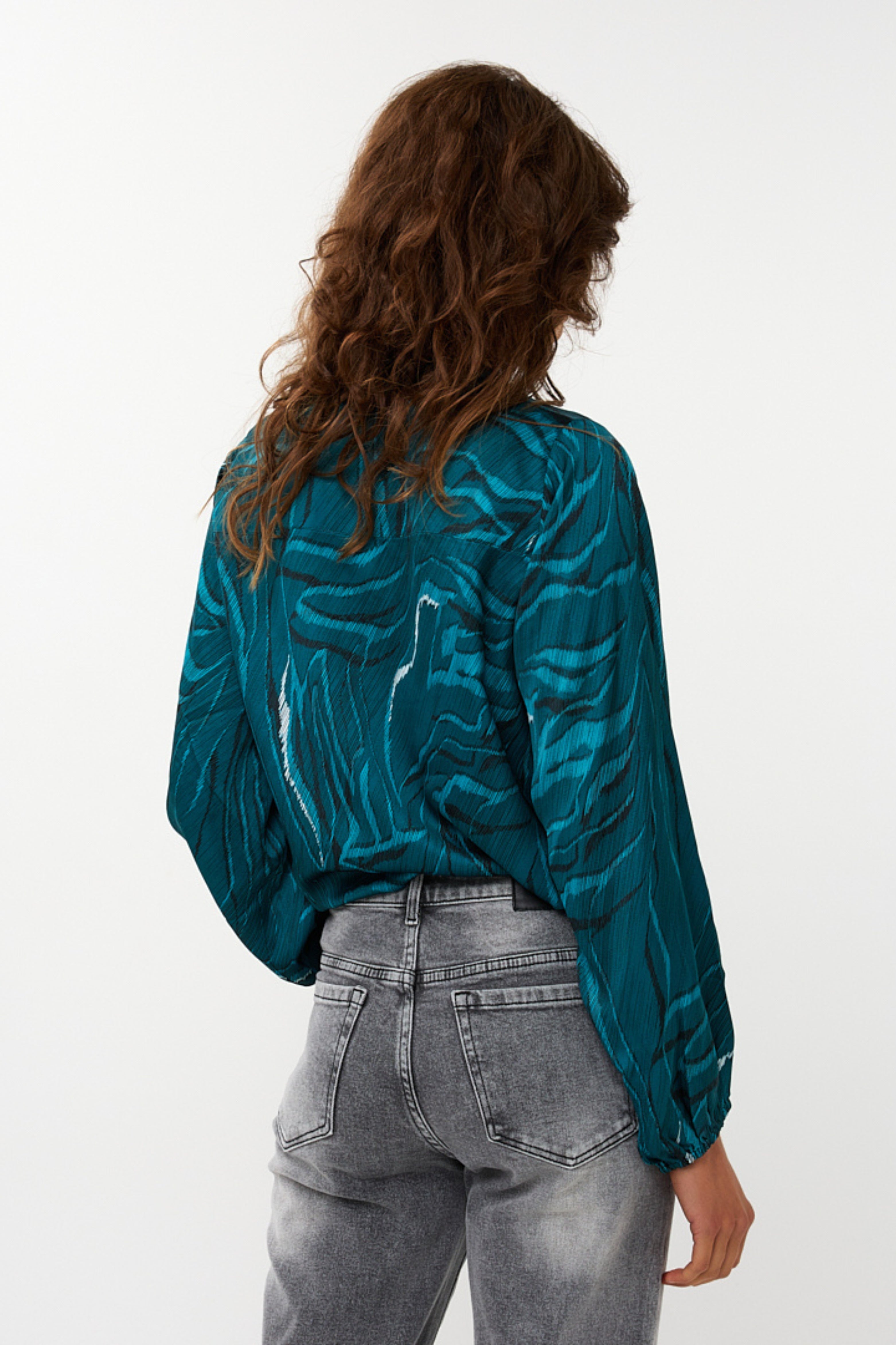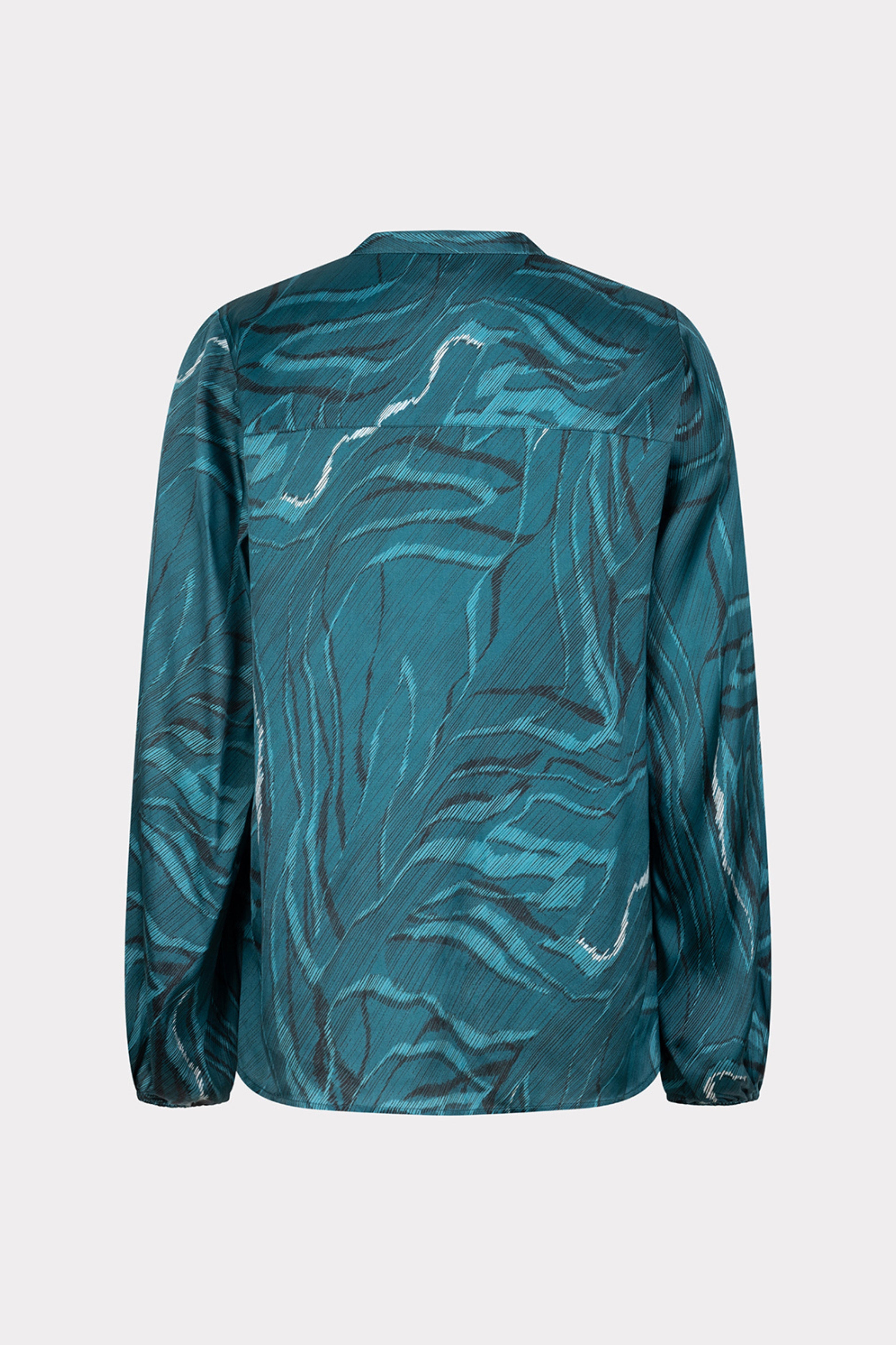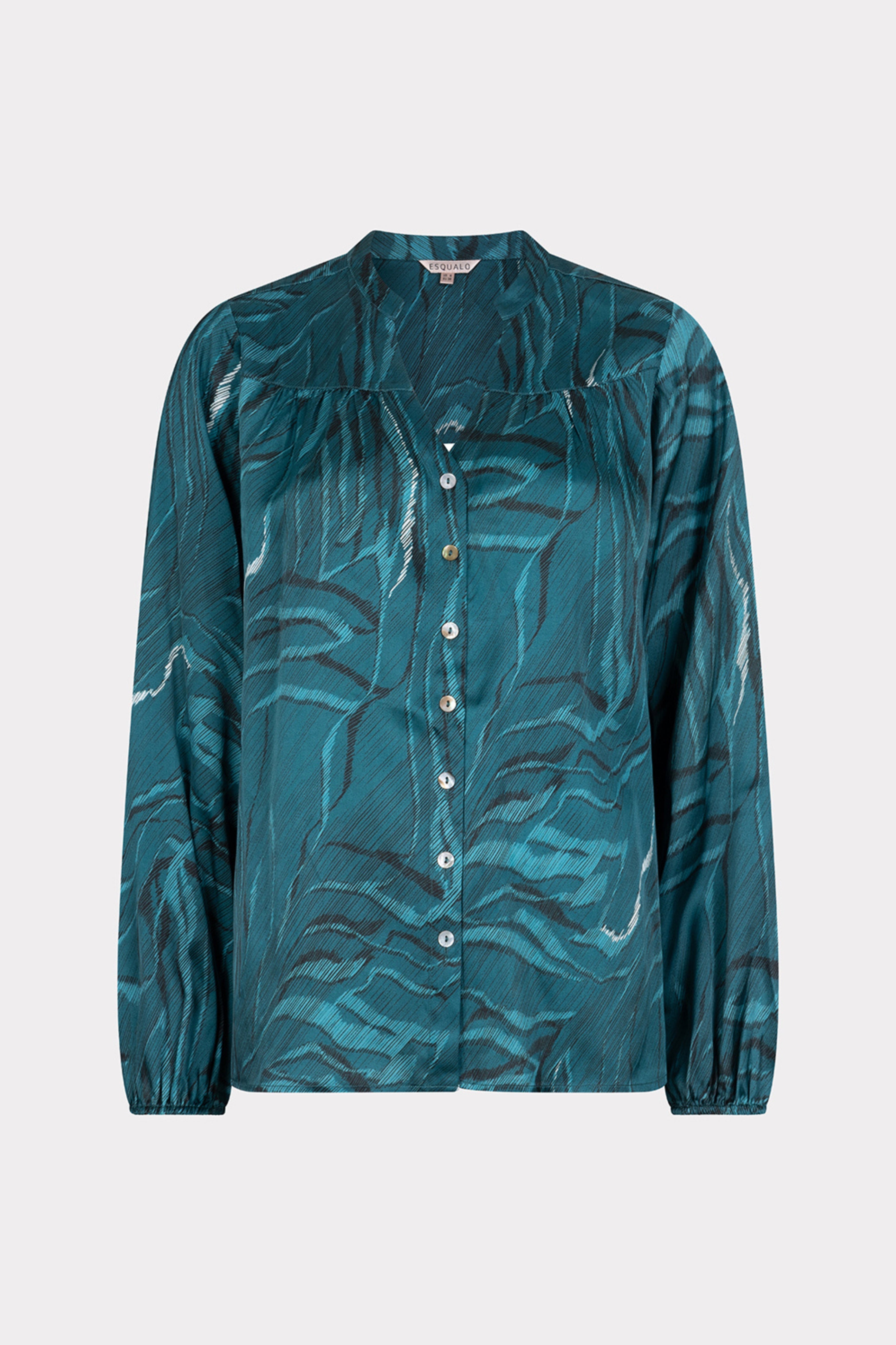De Blouse Crystal Waves Print van EsQualo is een luchtige blouse met V-hals en knoopsluiting. De elegante print in blauw- en groentinten en de soepelvallende pasvorm maken dit item een stijlvolle keuze.
