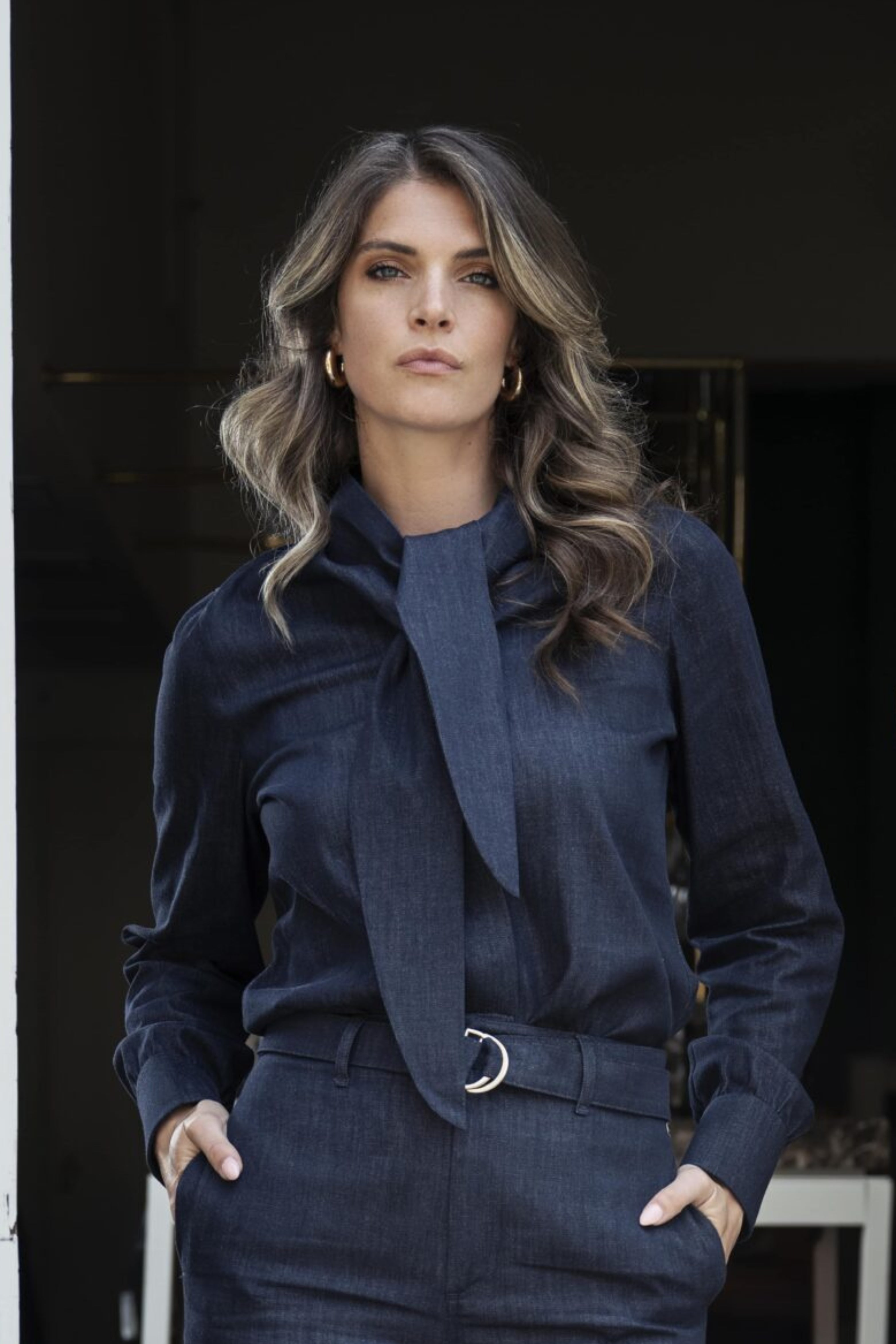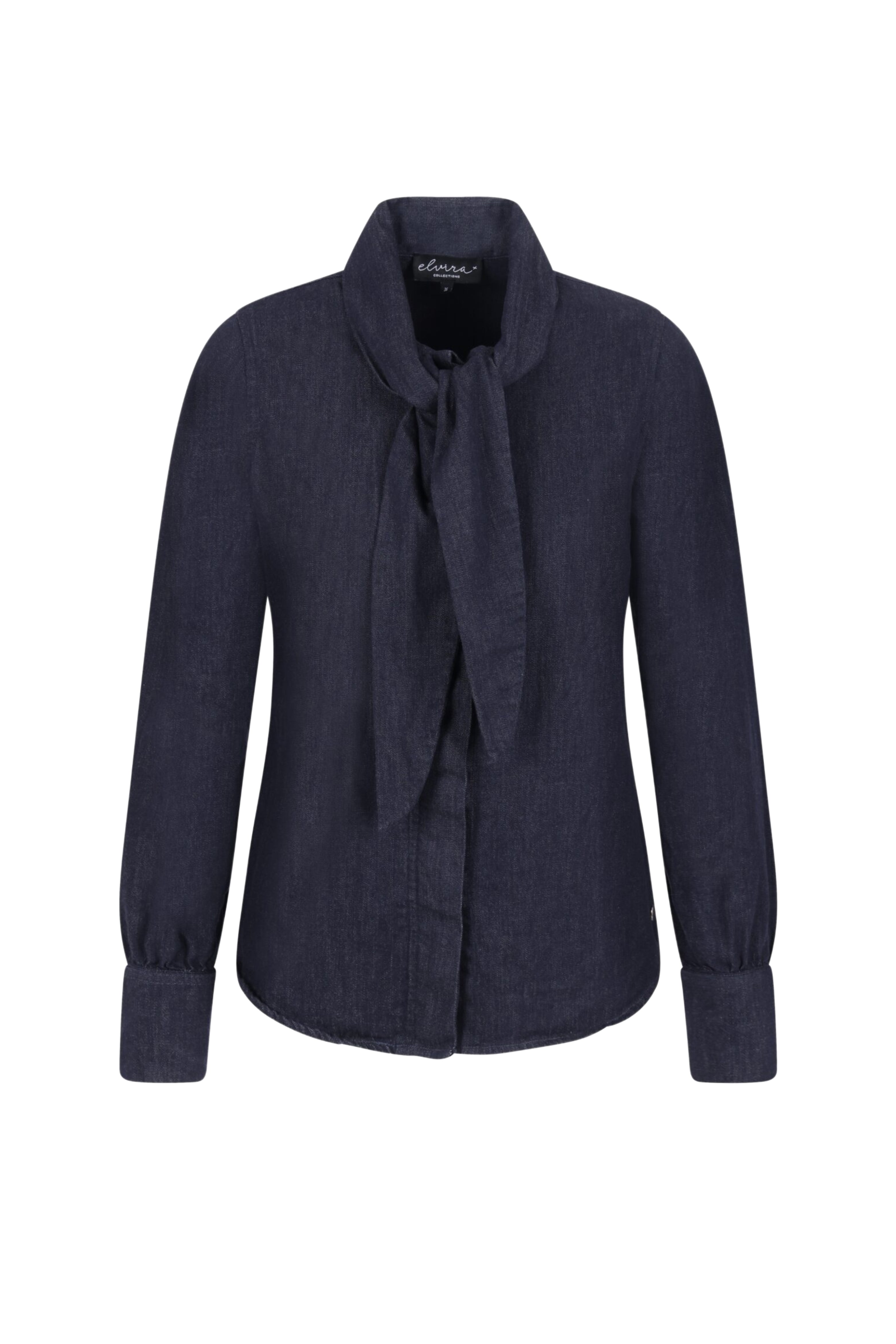 Blouse Danna Dark Blue Melange van Elvira is een chique blouse in een diepe blauw melange. Met strikdetail bij de hals, lange mouwen en een soepele stof is dit item ideaal voor zowel zakelijke als elegante gelegenheden.