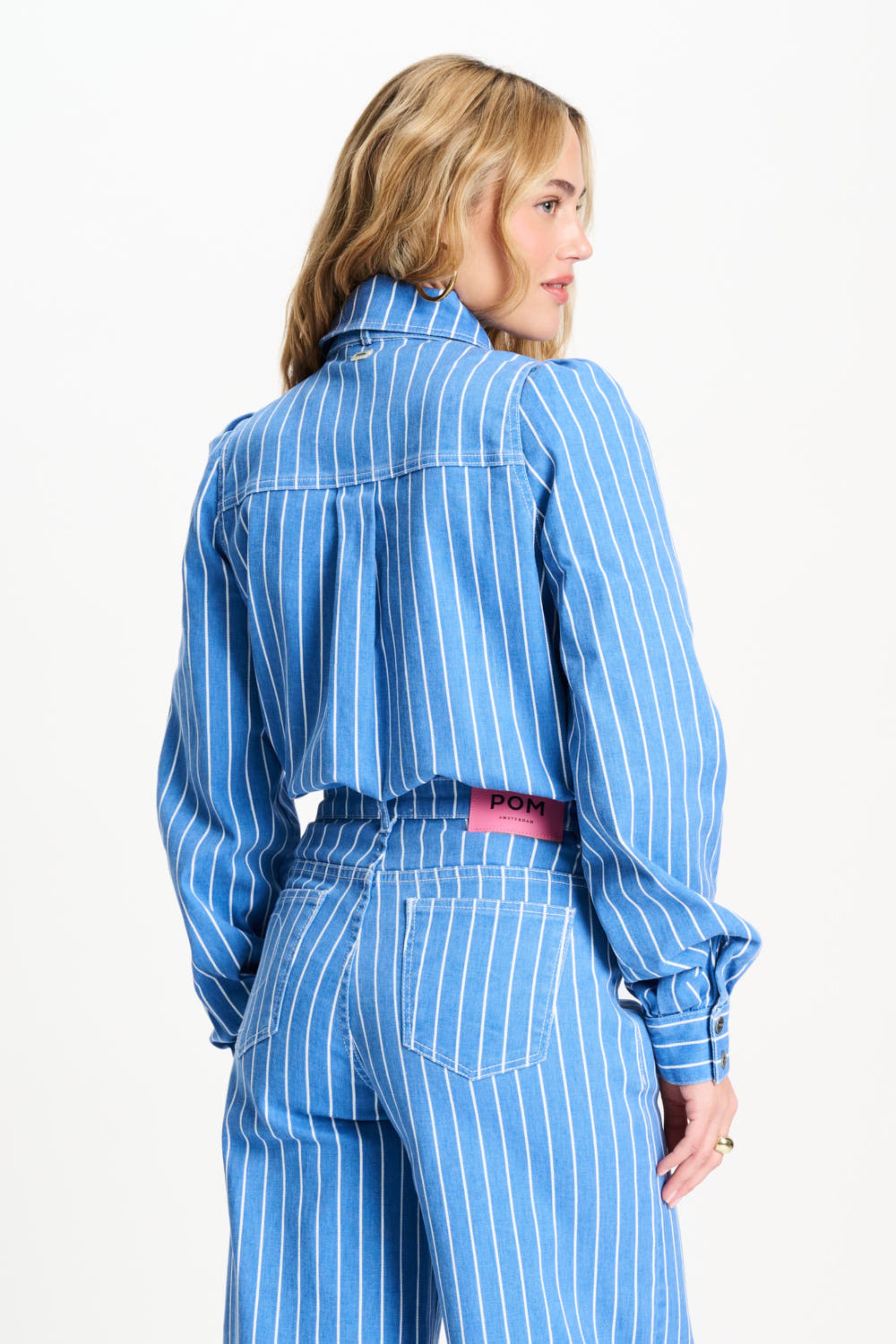 De Blouse Denim Stripes Blue van POM Amsterdam is een stijlvolle, blauw-wit gestreepte blouse met opvallend strikdetail. Een modern, tijdloos item dat elke outfit een frisse touch geeft.