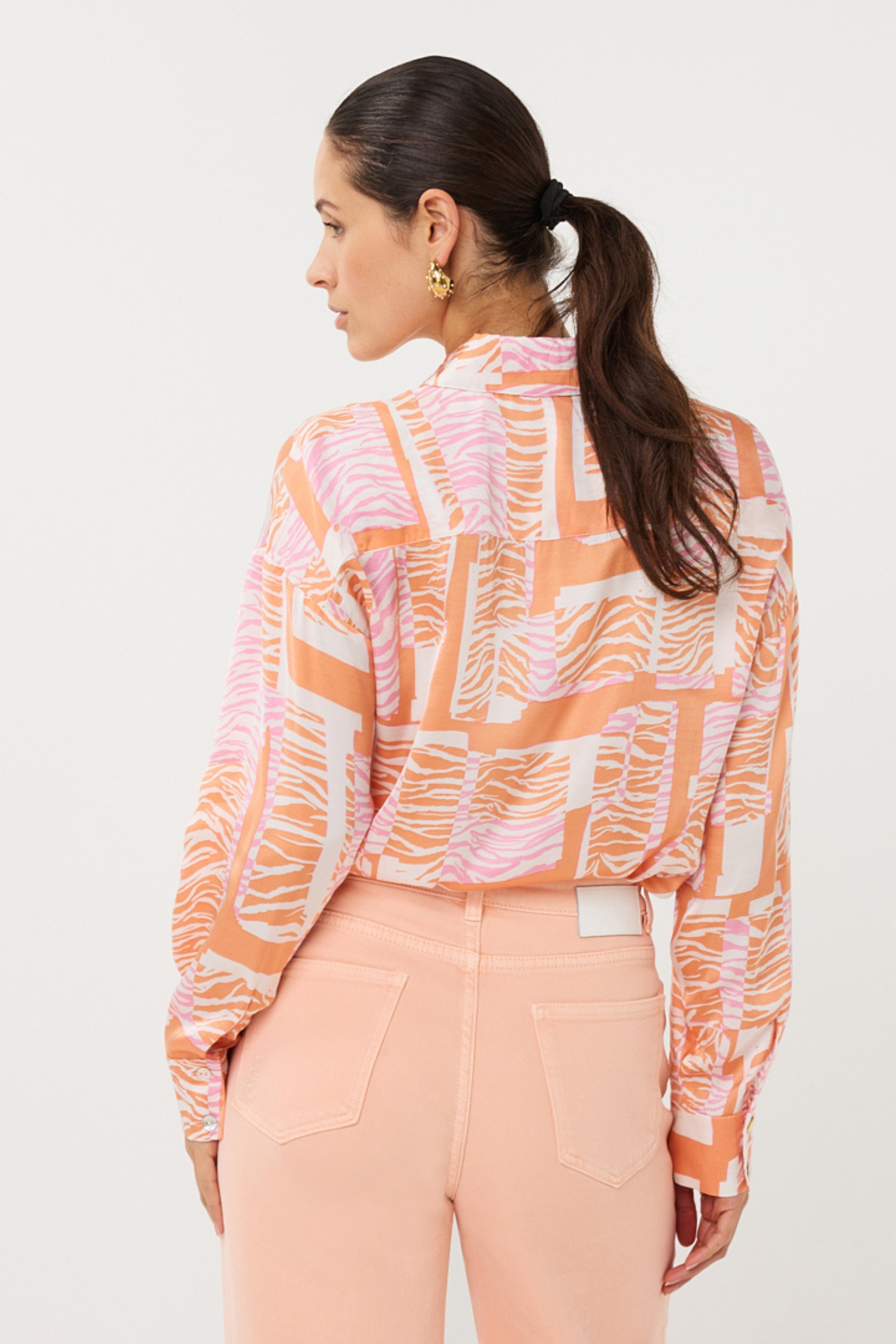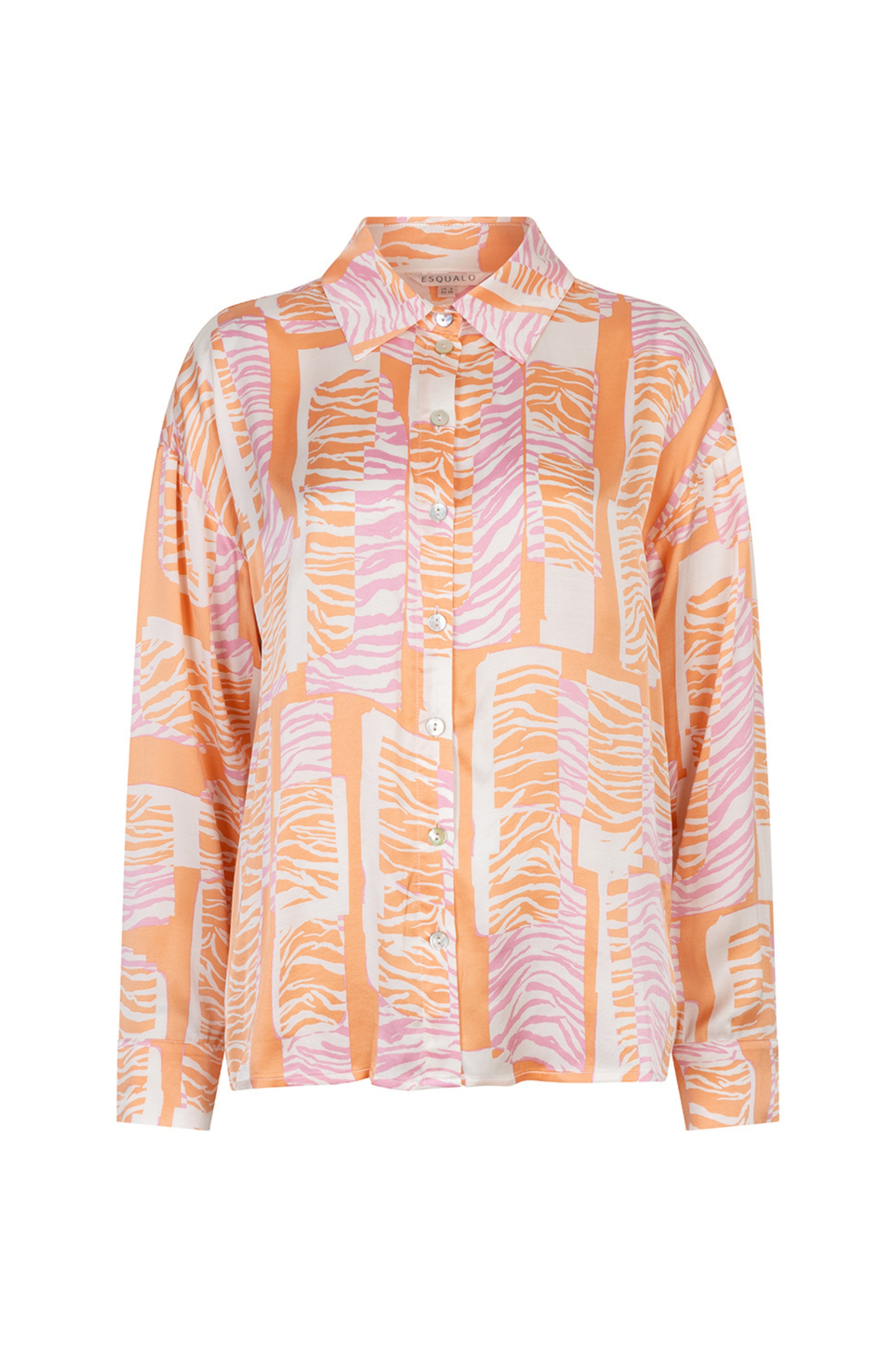 De Blouse Divine Blocks Print van Esqualo is een vrolijke blouse met klassieke kraag en lange mouwen. Doorknoopsluiting en strikkoord-zoom voor speelse styling; licht en soepelvallend. Perfect voor vrije tijd of zomerse citytrips.