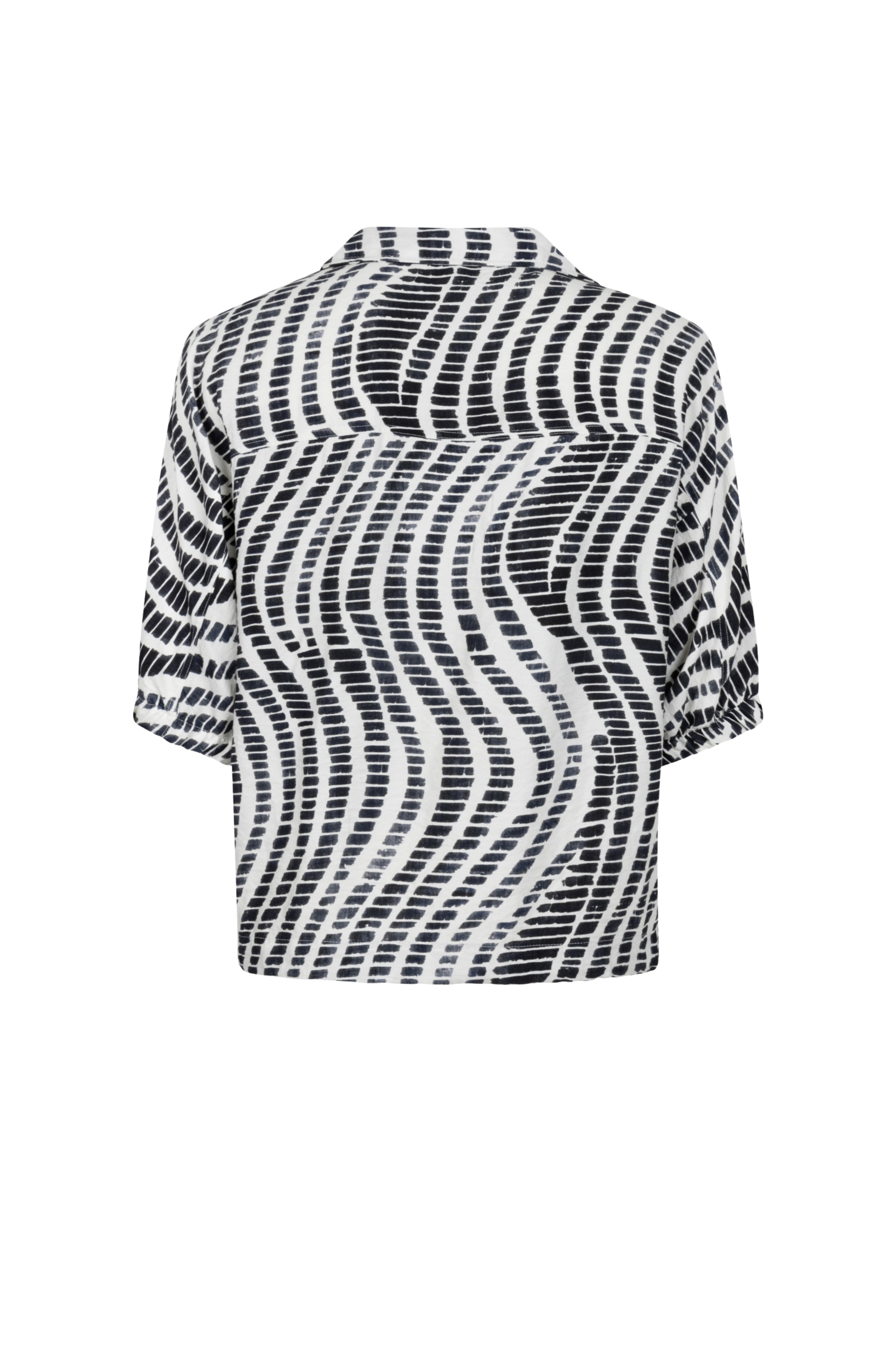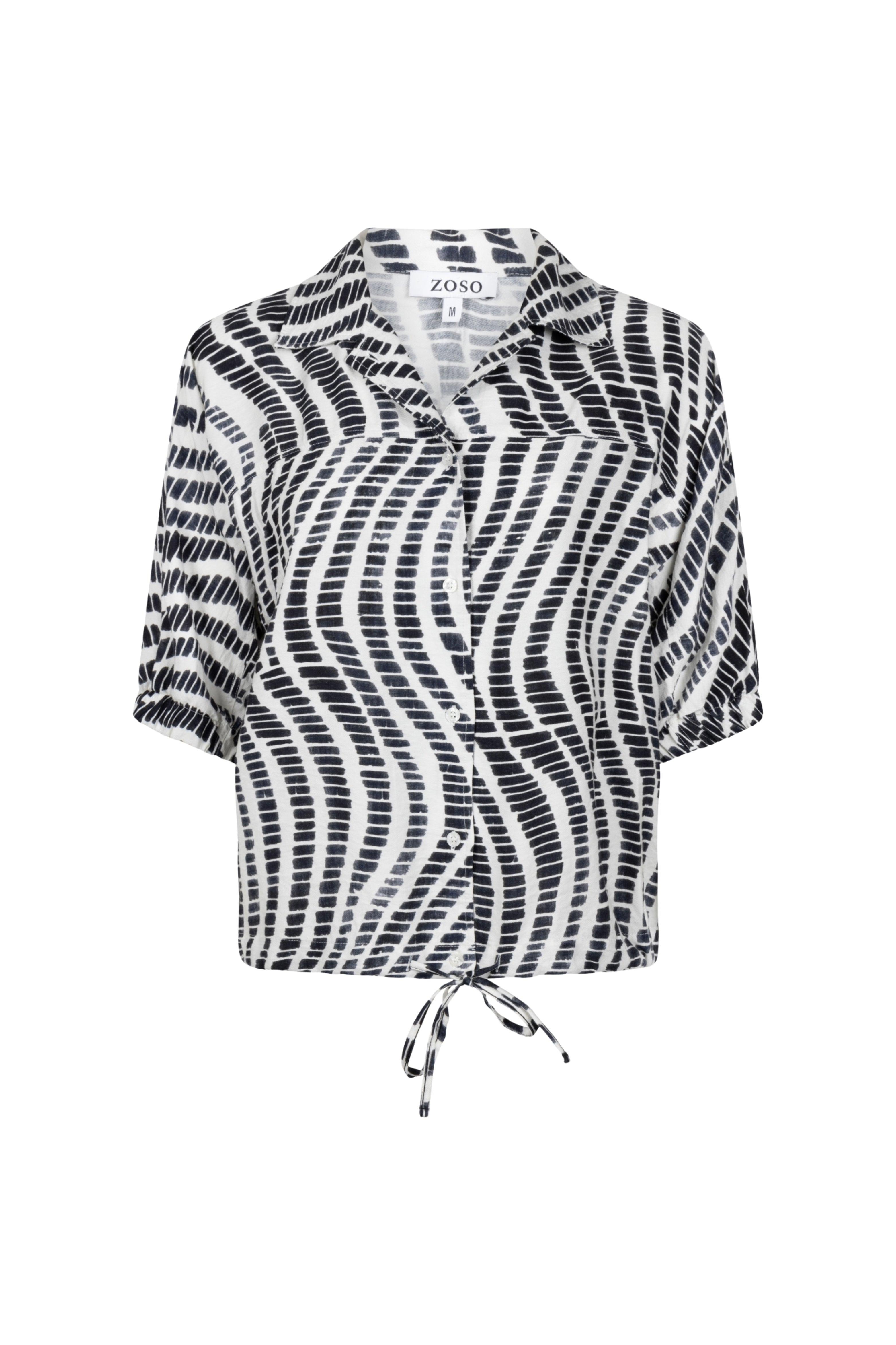 Blouse Edith Kit Night Blue van Zoso is een luchtige blouse met moderne all-over print en strikdetail aan de zoom. De soepele stof, relaxte fit en korte mouwen maken dit een veelzijdige top voor zowel casual als geklede looks.
