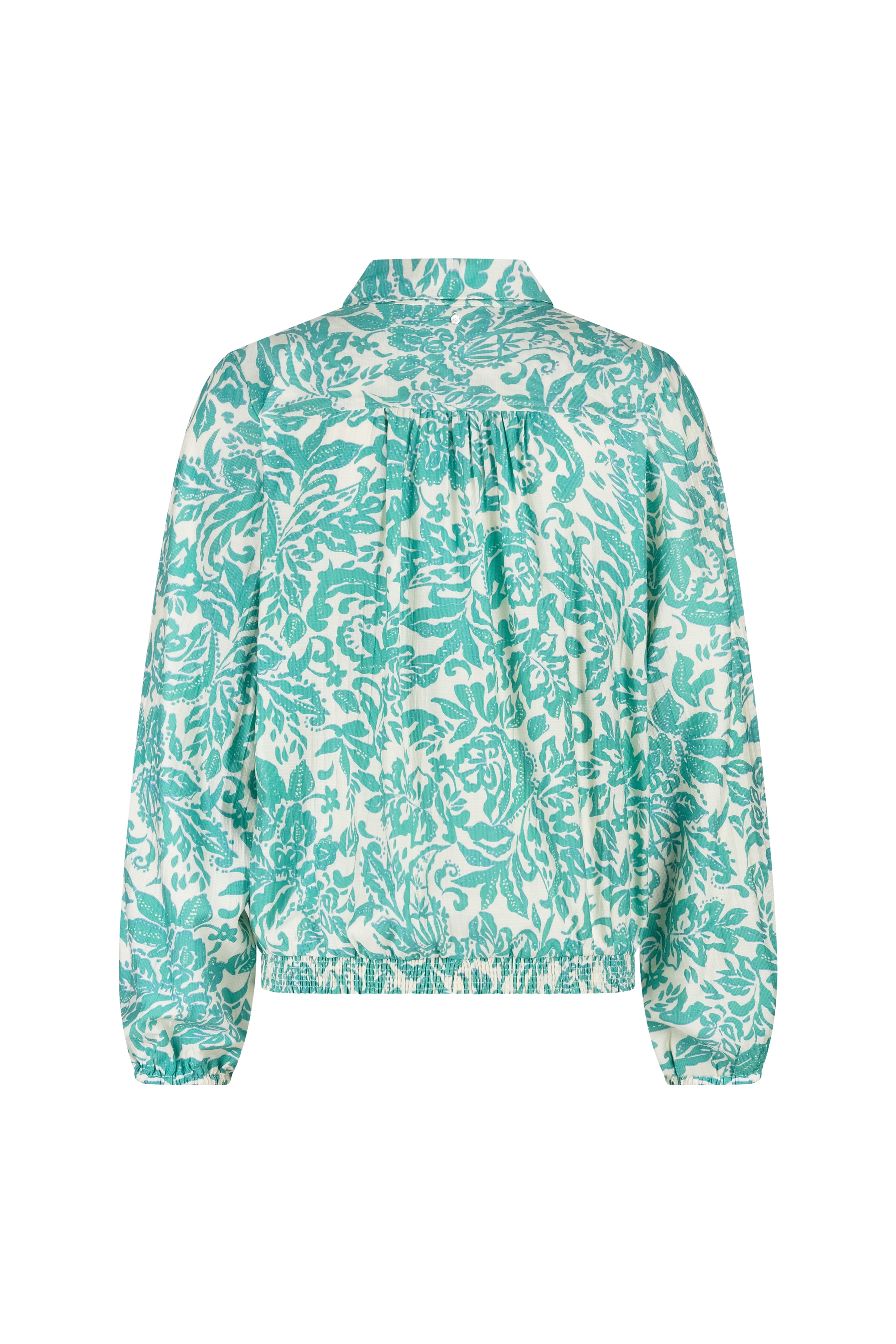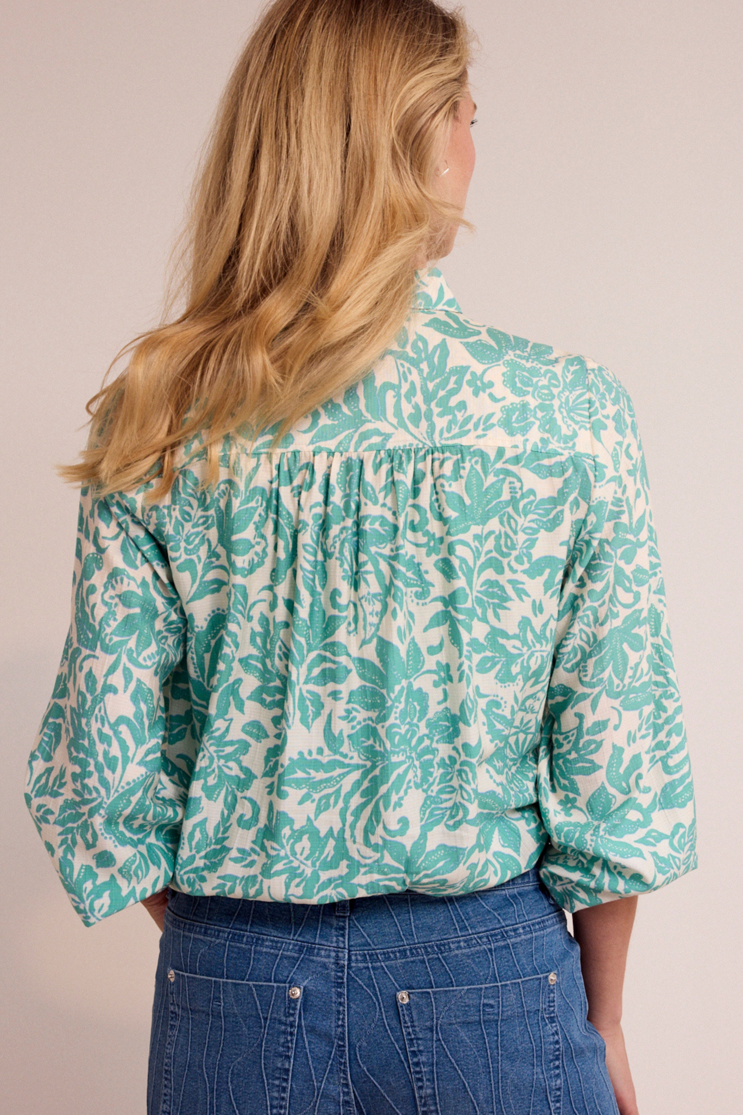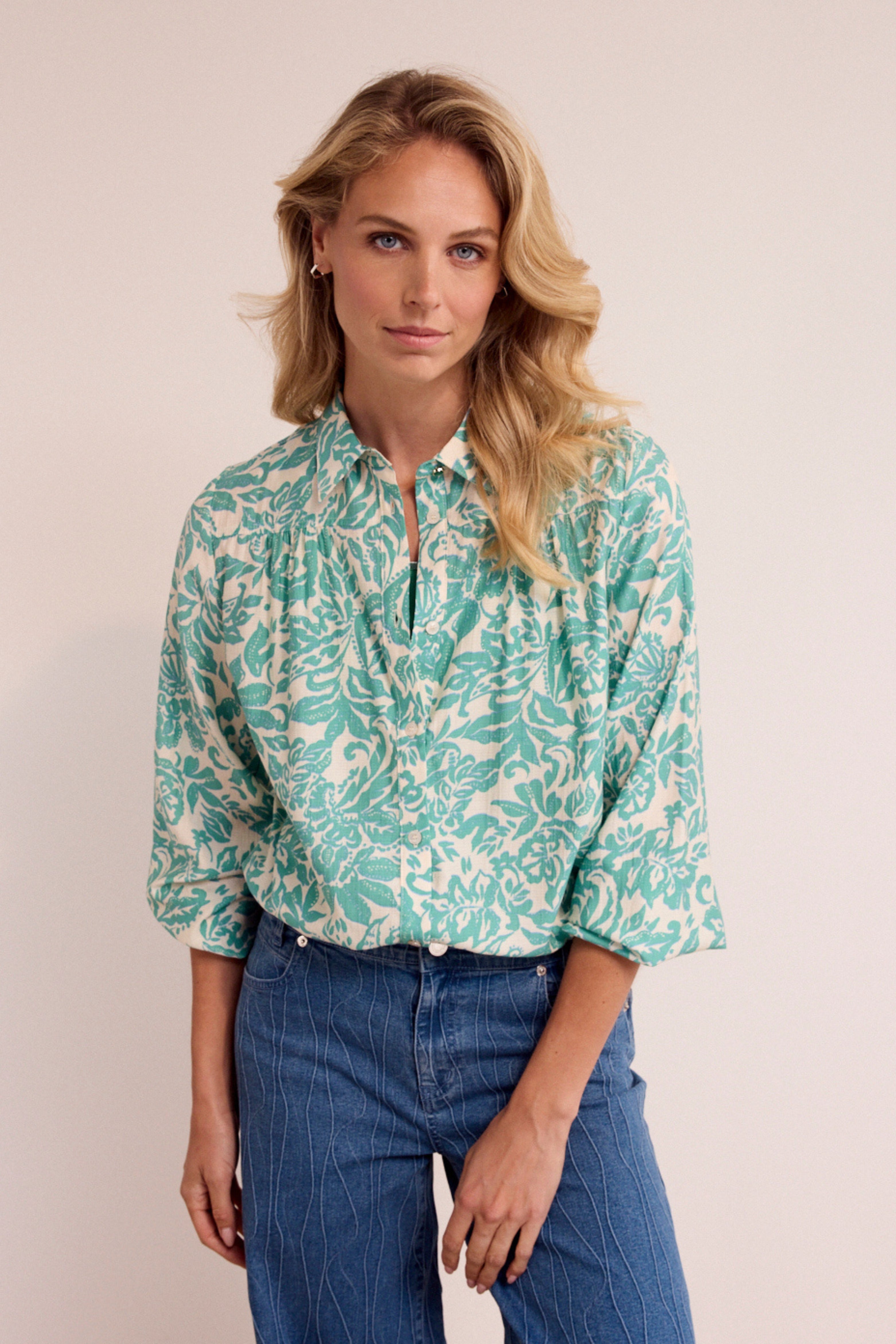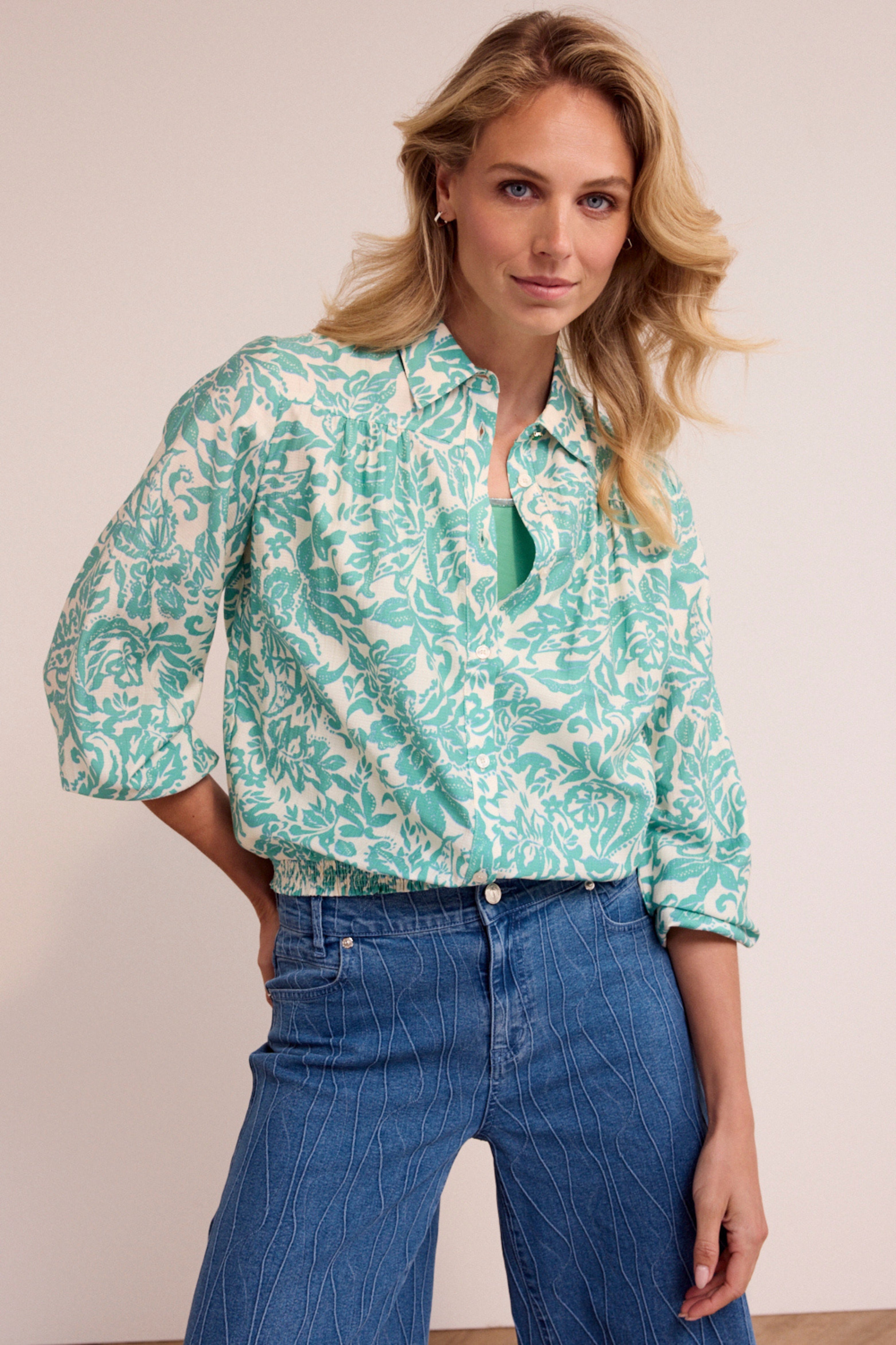 De Blouse Emerald Flourish van Tramontana is een elegante blouse met een verfijnde all-over print in frisse groentinten. De luchtige stof en vrouwelijke details maken dit item perfect voor een stijlvolle najaarslook met een moderne twist.