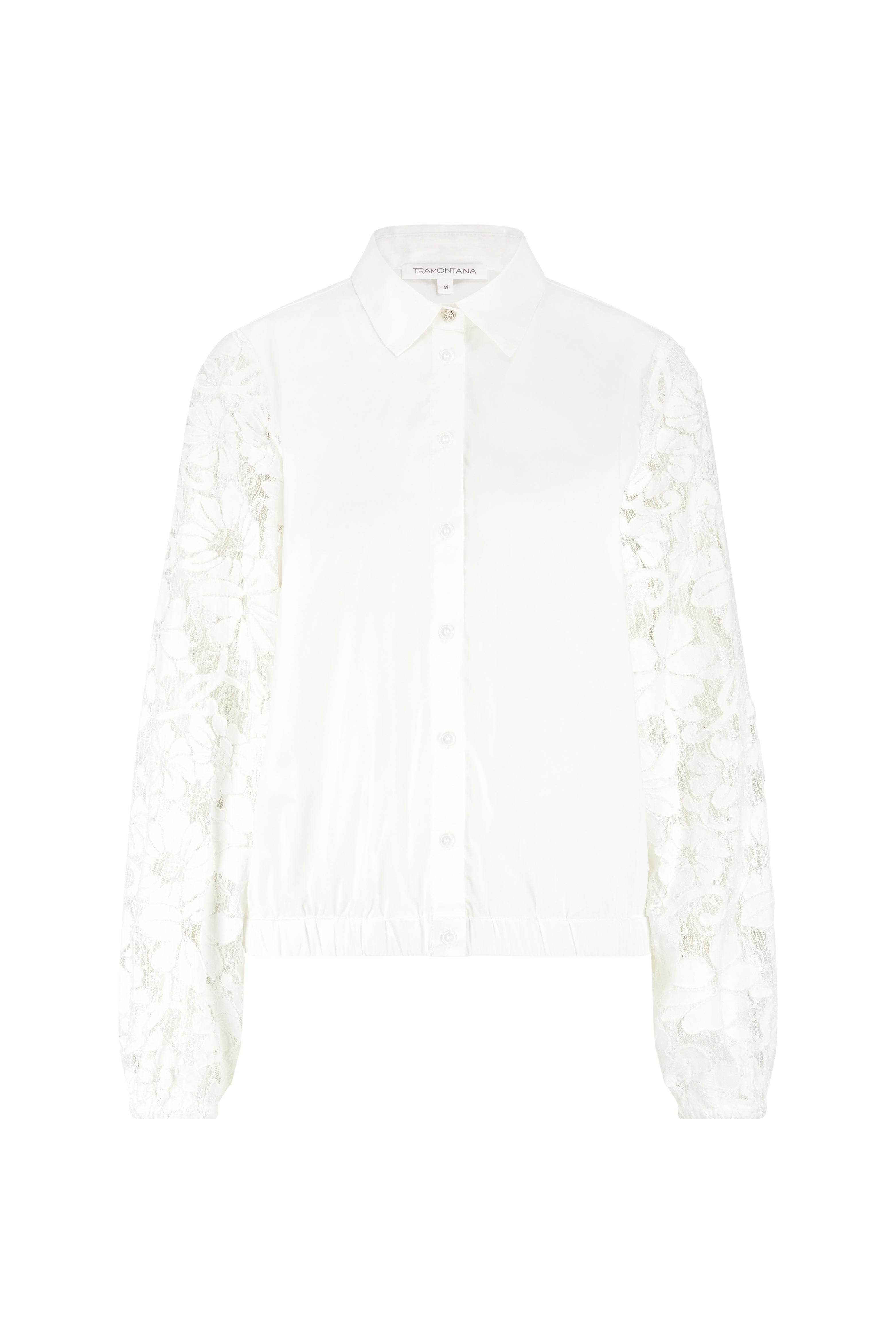 De Blouse Fancy Lace Sleeves Offwhite van Tramontana is een elegante blouse met verfijnde kanten mouwen. De combinatie van een clean silhouet en romantische details maakt dit item perfect voor stijlvolle, vrouwelijke najaarslooks.