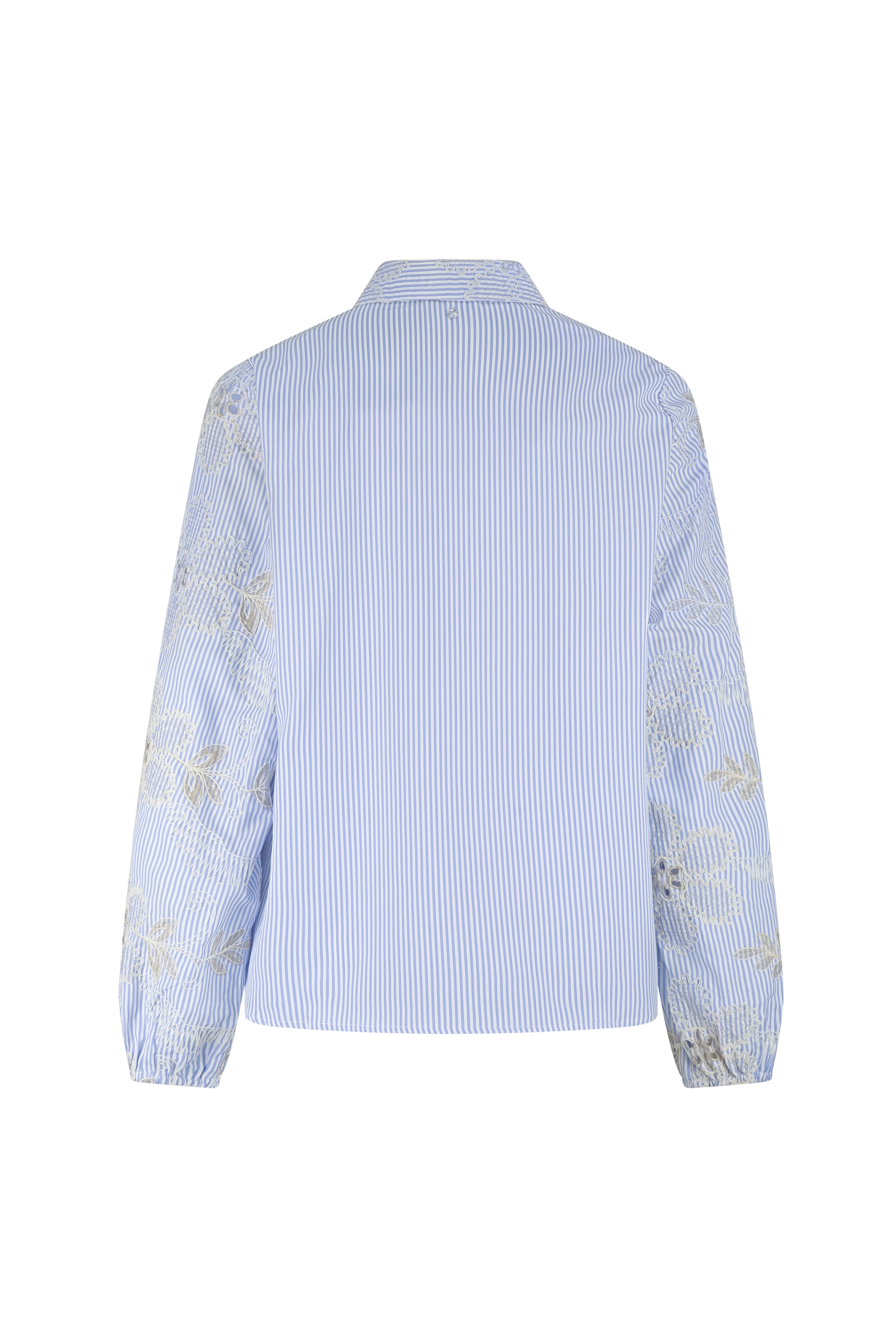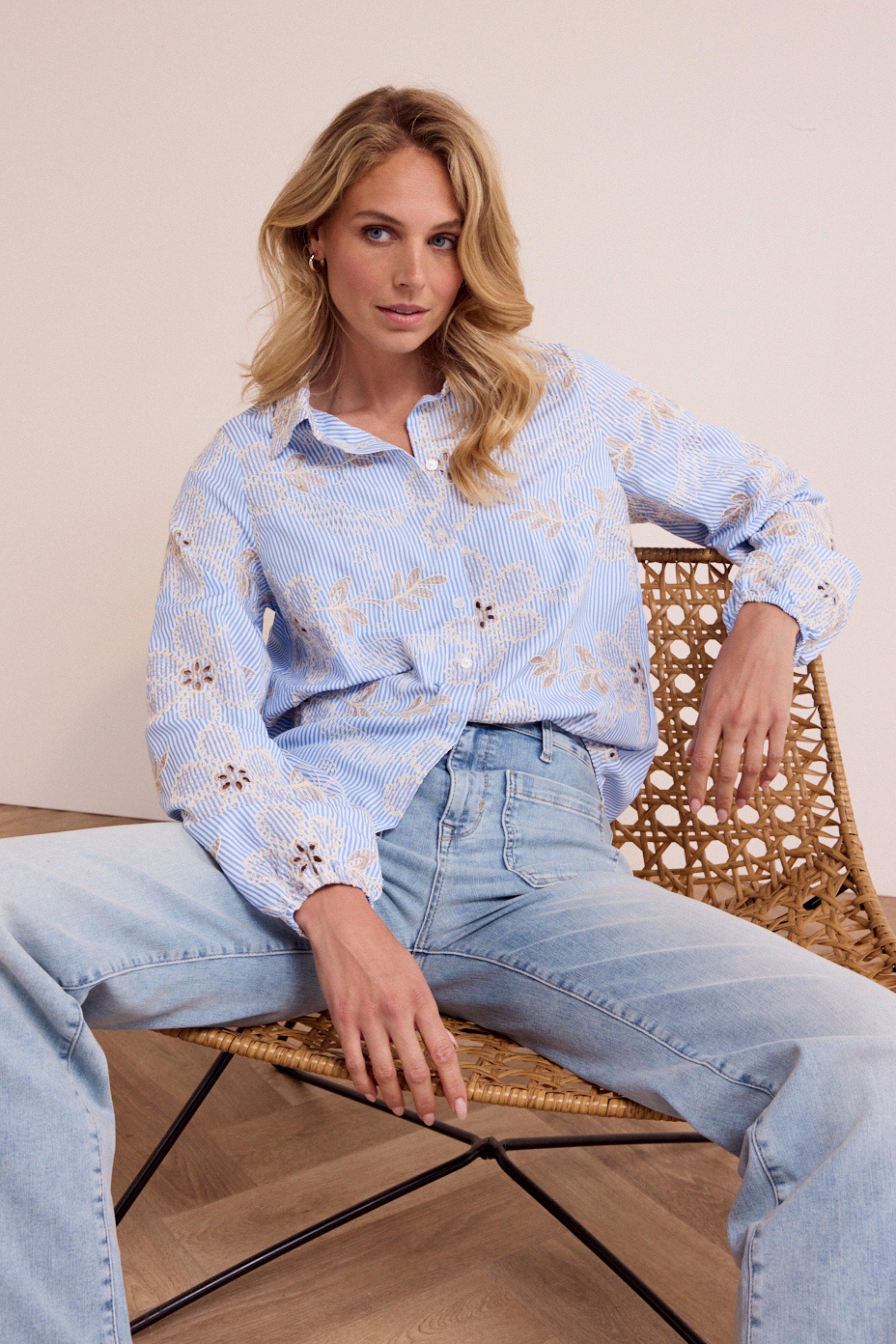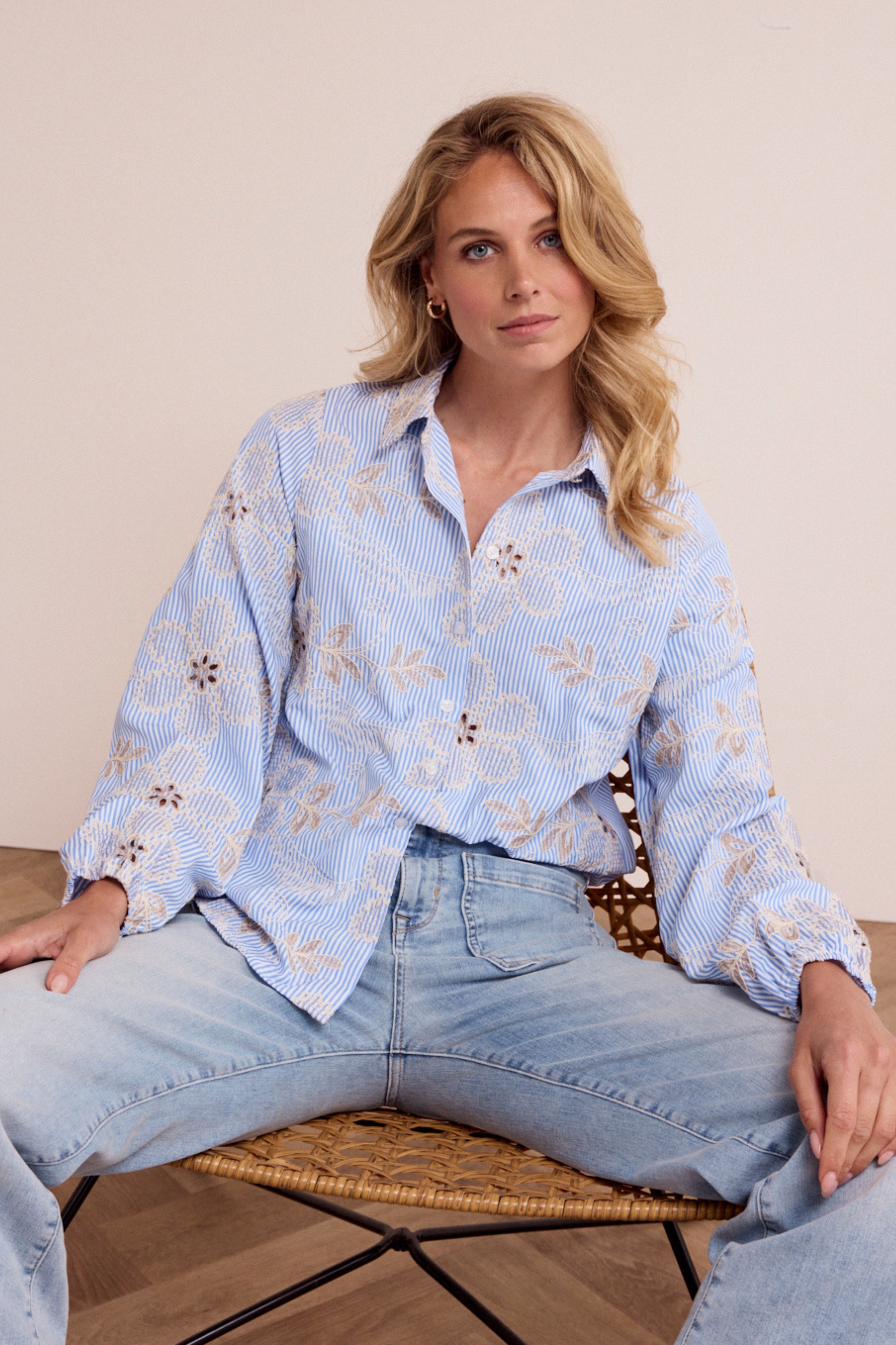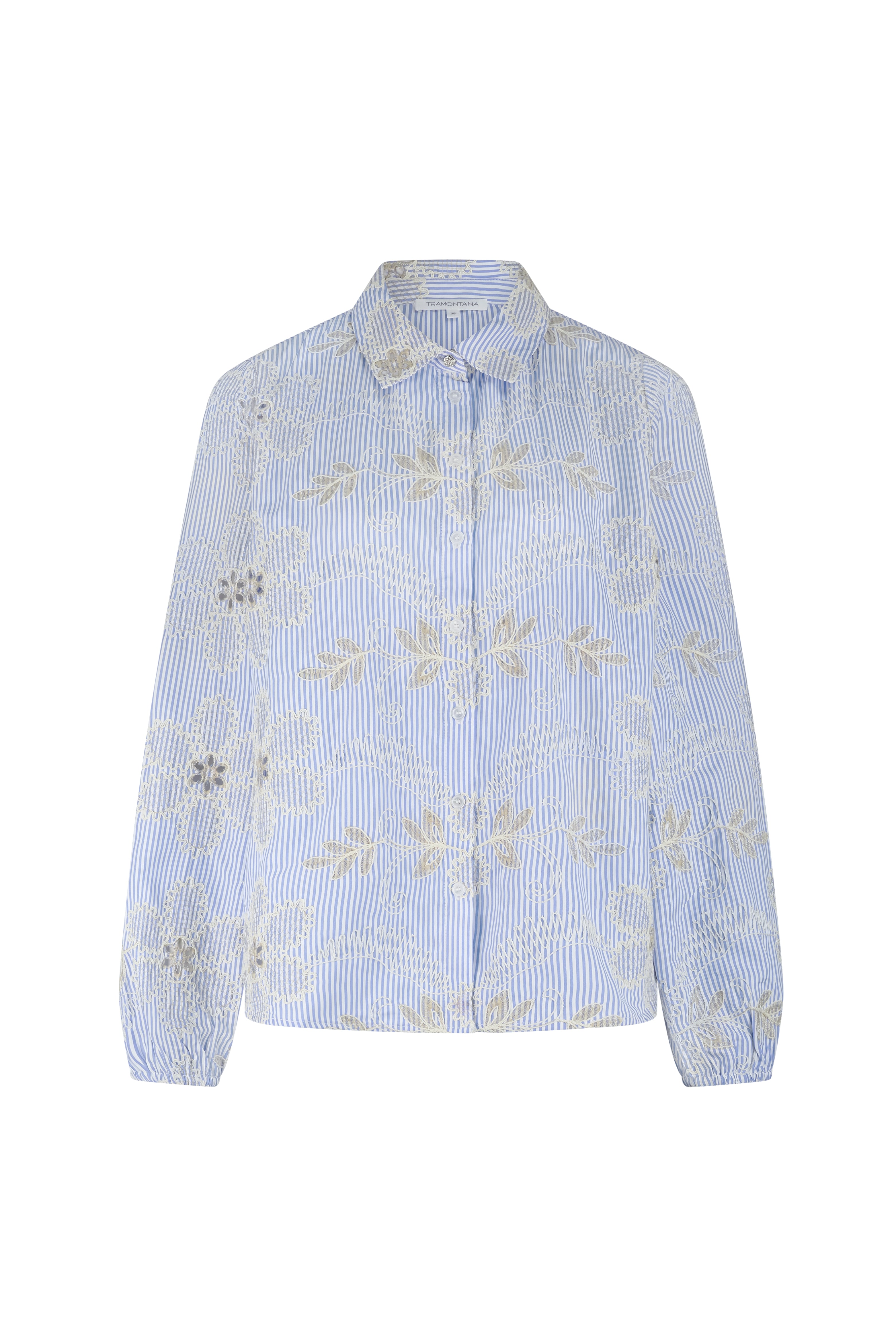 De Blouse Flower Embroidery Breezy Blue van Tramontana combineert frisse strepen met verfijnd bloemenborduurwerk. De lichte stof en vrouwelijke details maken deze blouse een elegante keuze voor een zachte, stijlvolle najaarslook.