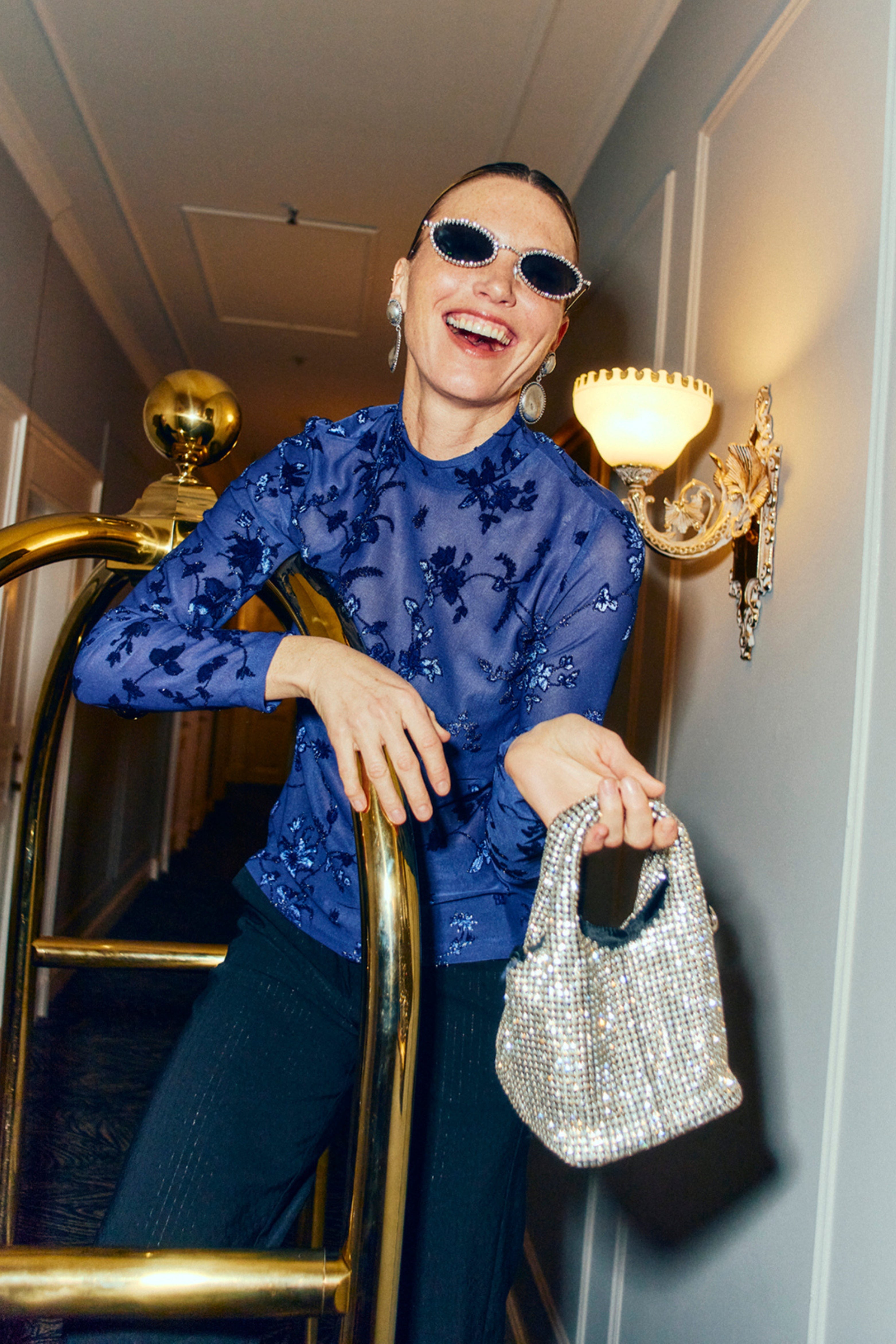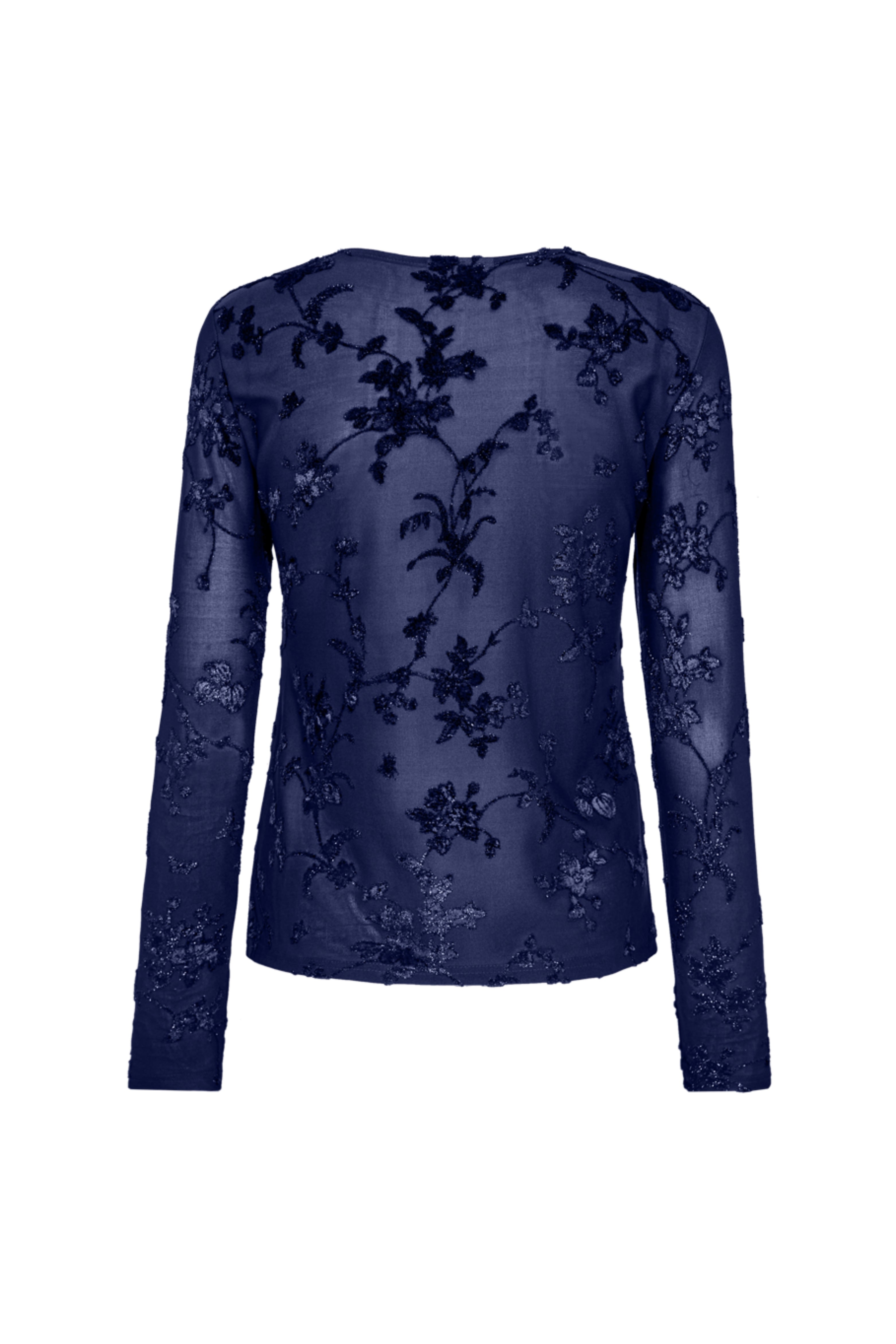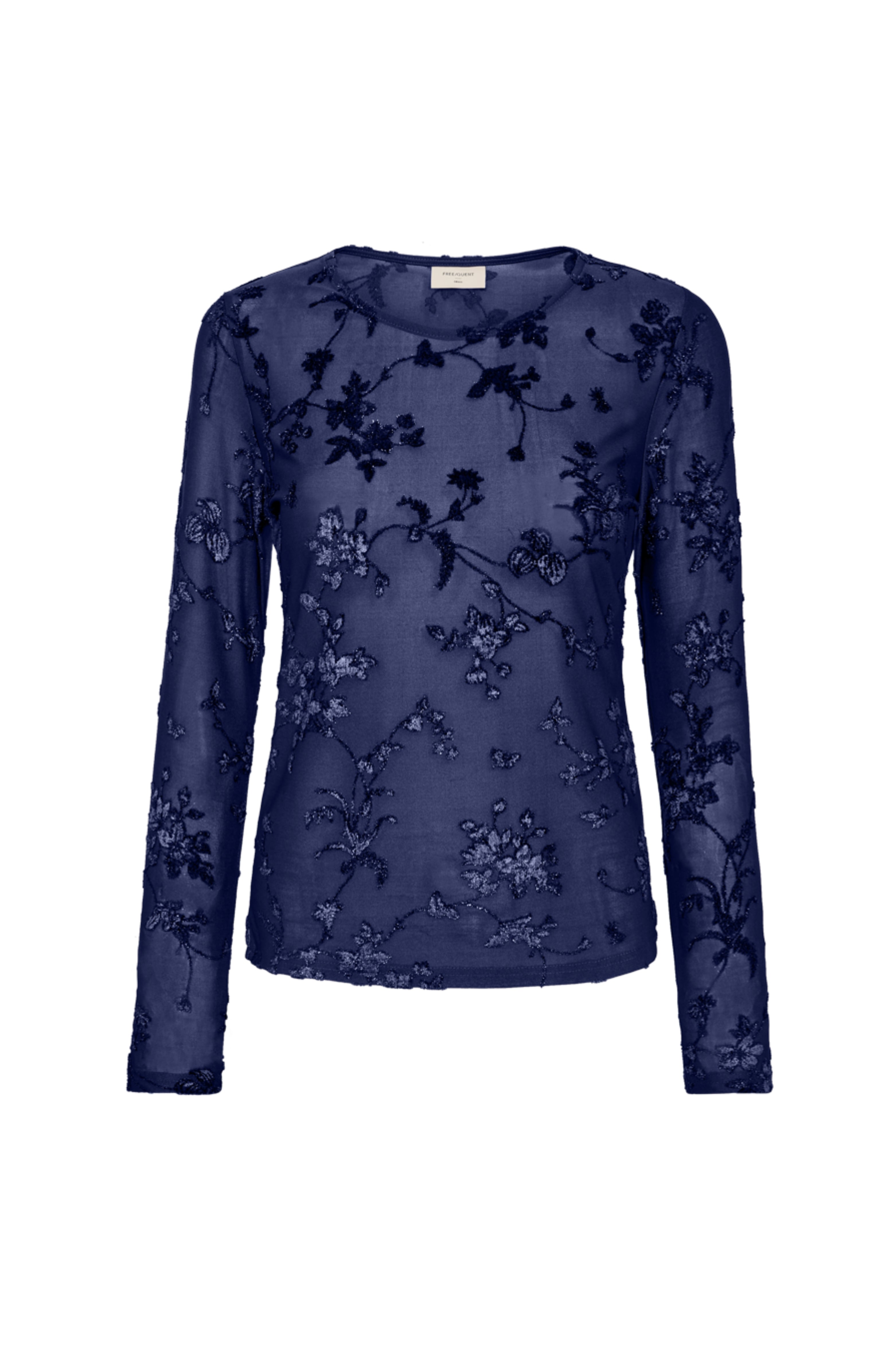 De Blouse Fqbiska Printed Mesh Blouse van Freequent in Patriot Blue is een elegante, transparante blouse met geborduurde bloemen. De lichte glans en verfijnde details maken dit item perfect voor feestelijke gelegenheden.