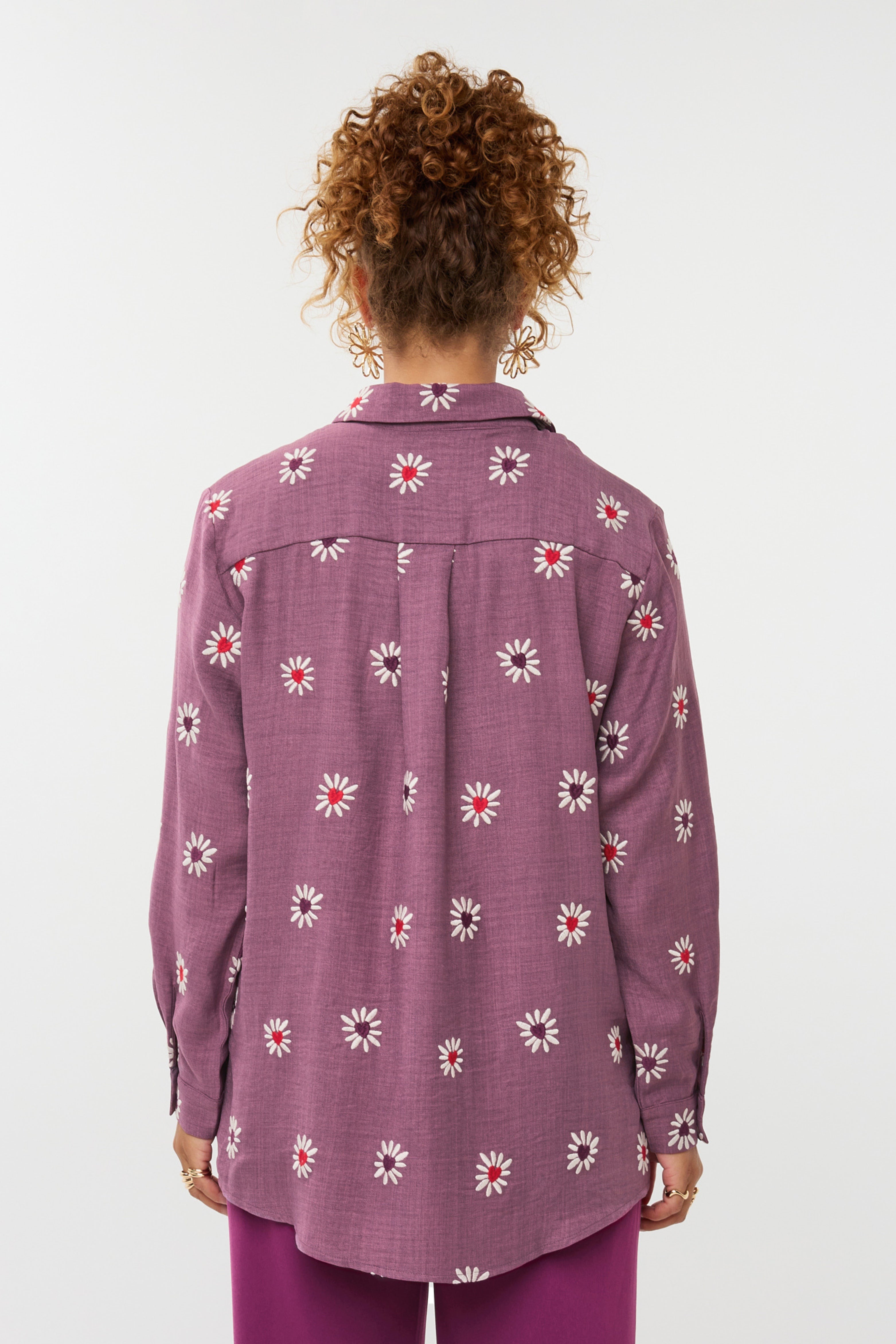 De Blouse Gabia Mauve van Ydence is een luchtige blouse in een zachte paarse tint, versierd met geborduurde bloemen. Uitgevoerd met een klassieke kraag, doorlopende knoopsluiting en lange mouwen met manchetten. De soepele stof en speelse borduursels maken dit een veelzijdig item.