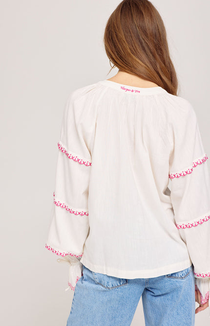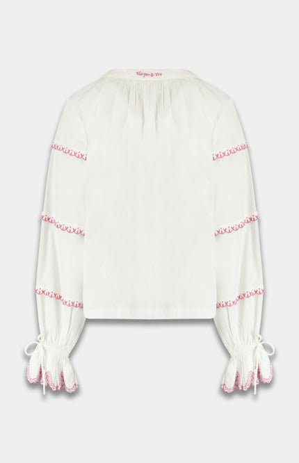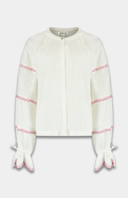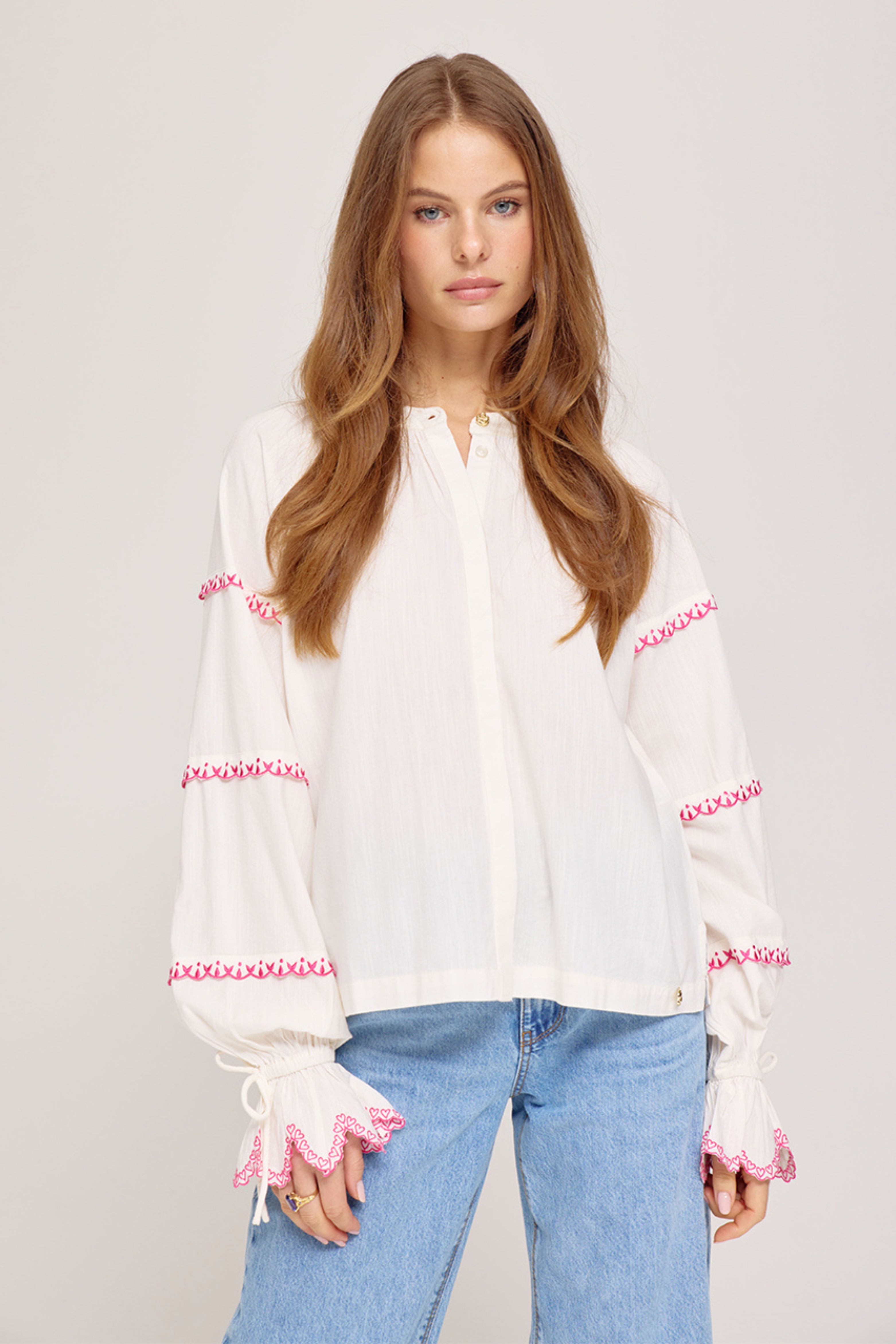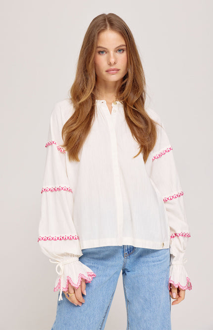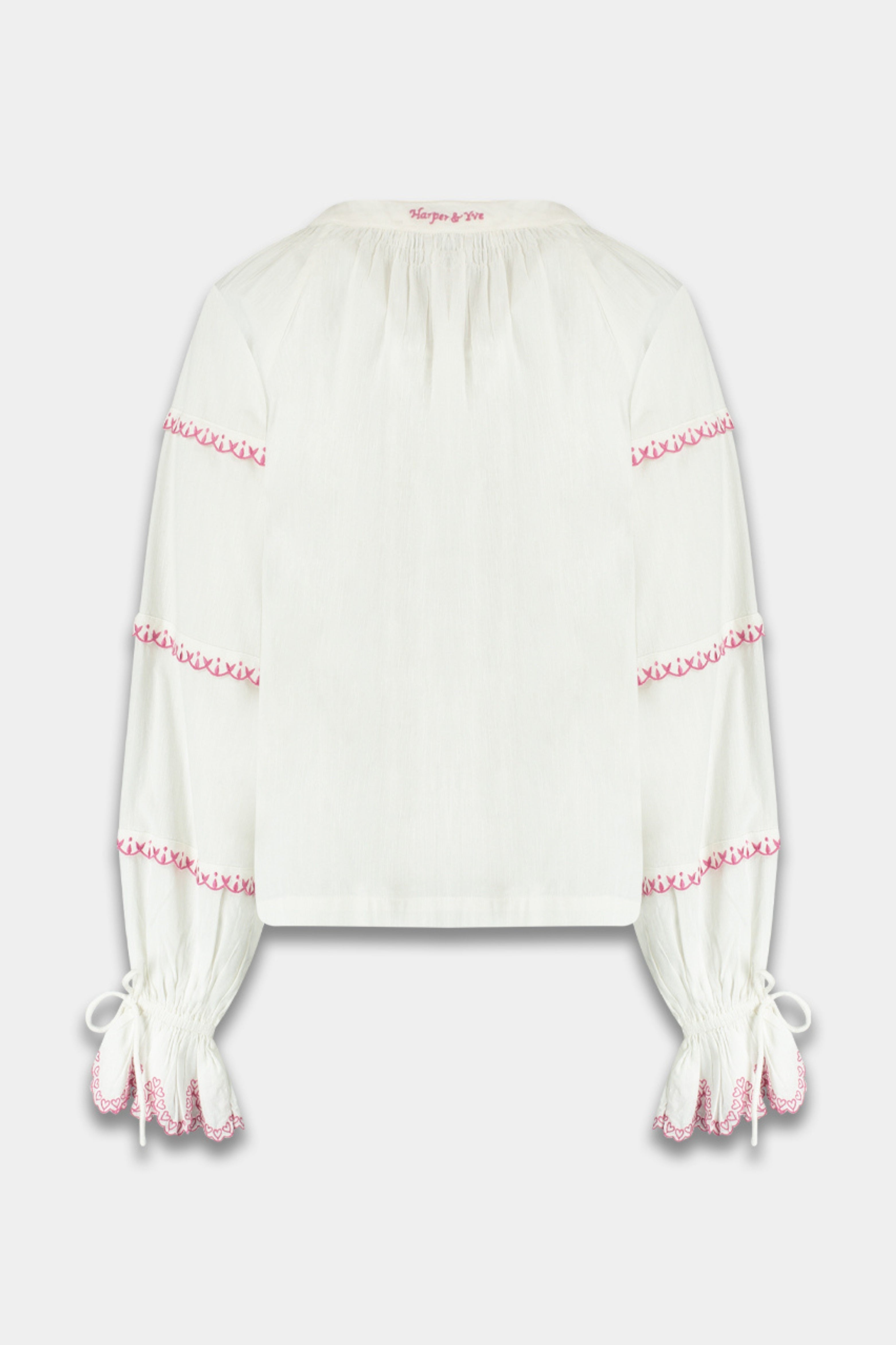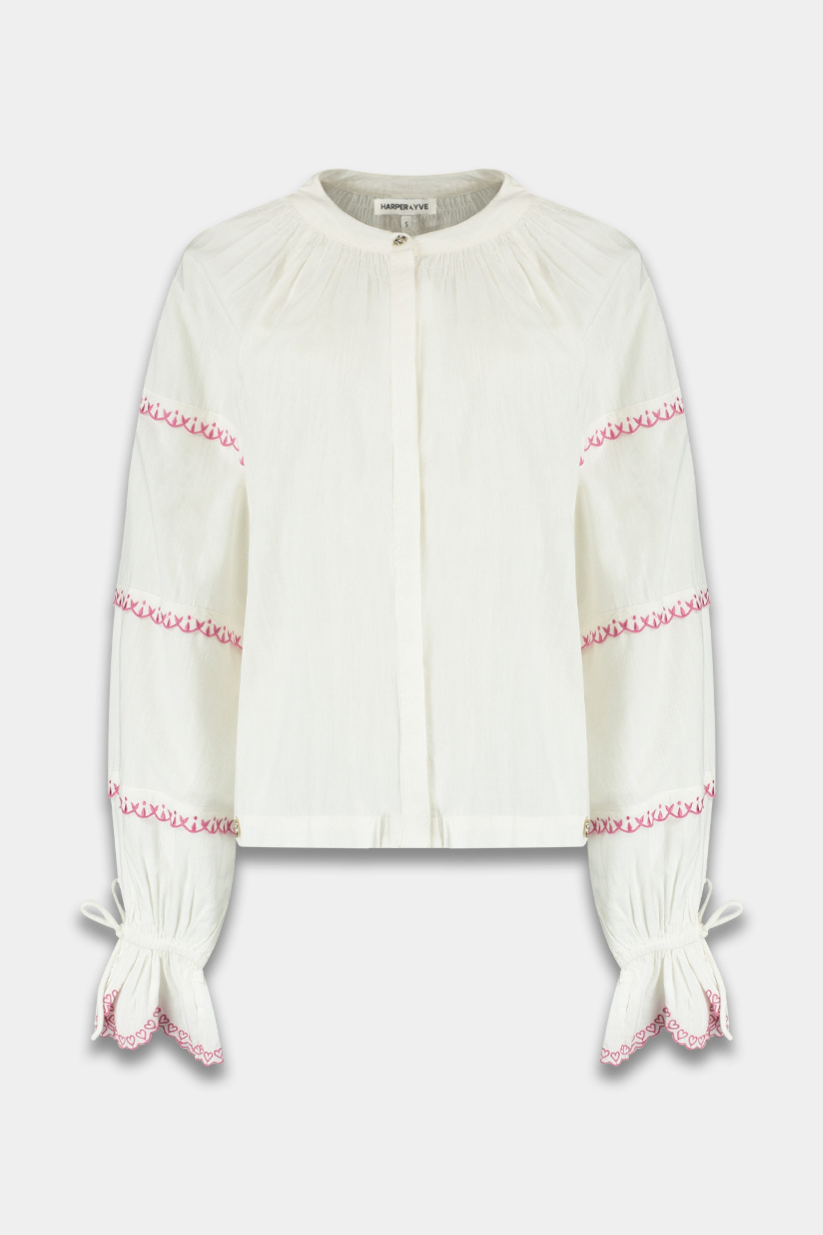 De Blouse Hady Ecru van Harper & Yve straalt bohemian elegantie uit. Met subtiele plooien en contrasterend roze borduurwerk op de mouwen, creëert deze blouse een luchtige en vrouwelijke look.