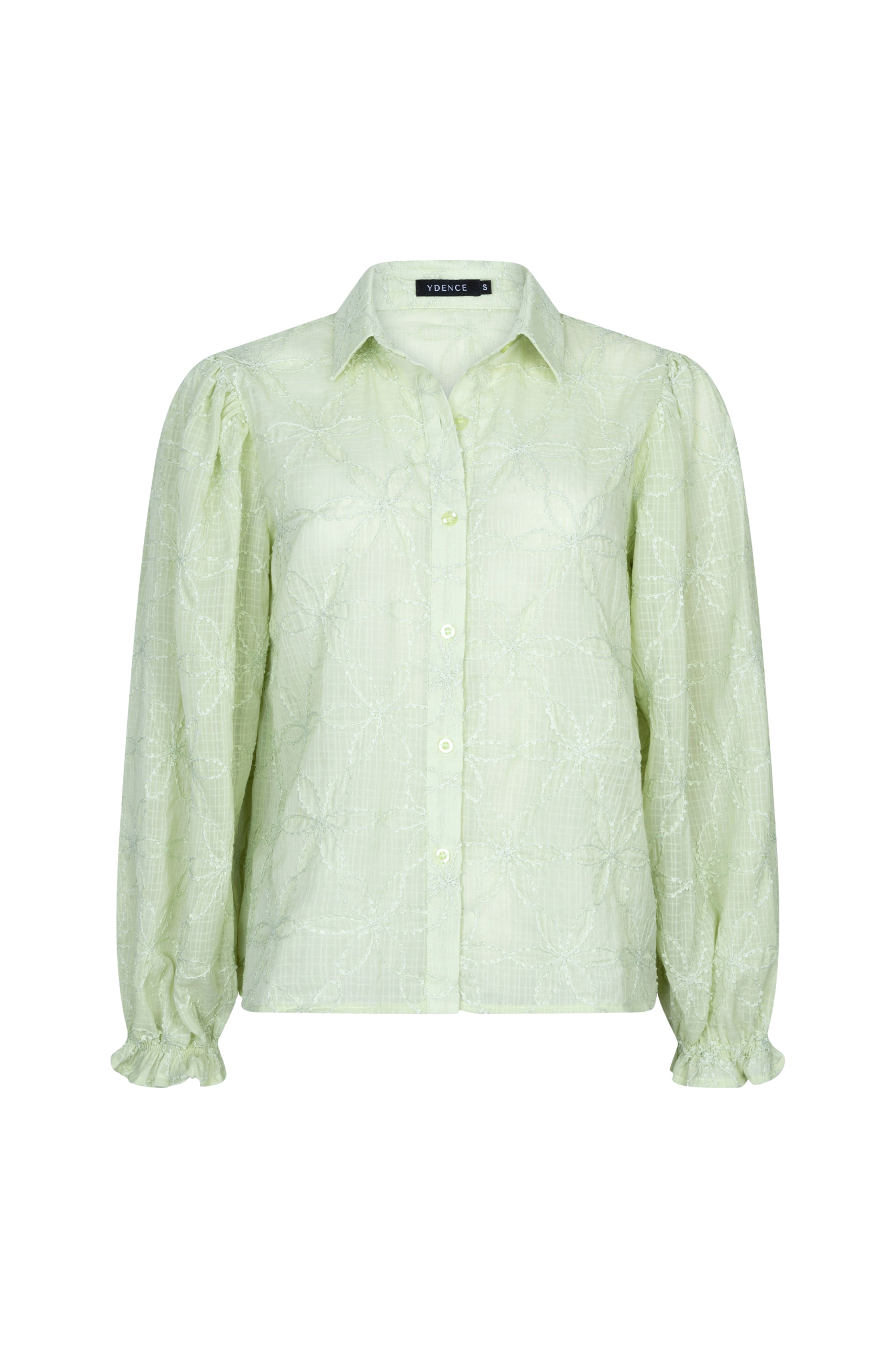 De Blouse Isamae Soft Green van Ydence straalt zachtheid en elegantie uit. De verfijnde jacquardstructuur en subtiele pofmouwen geven deze blouse een vrouwelijke touch, perfect voor een frisse en stijlvolle look.