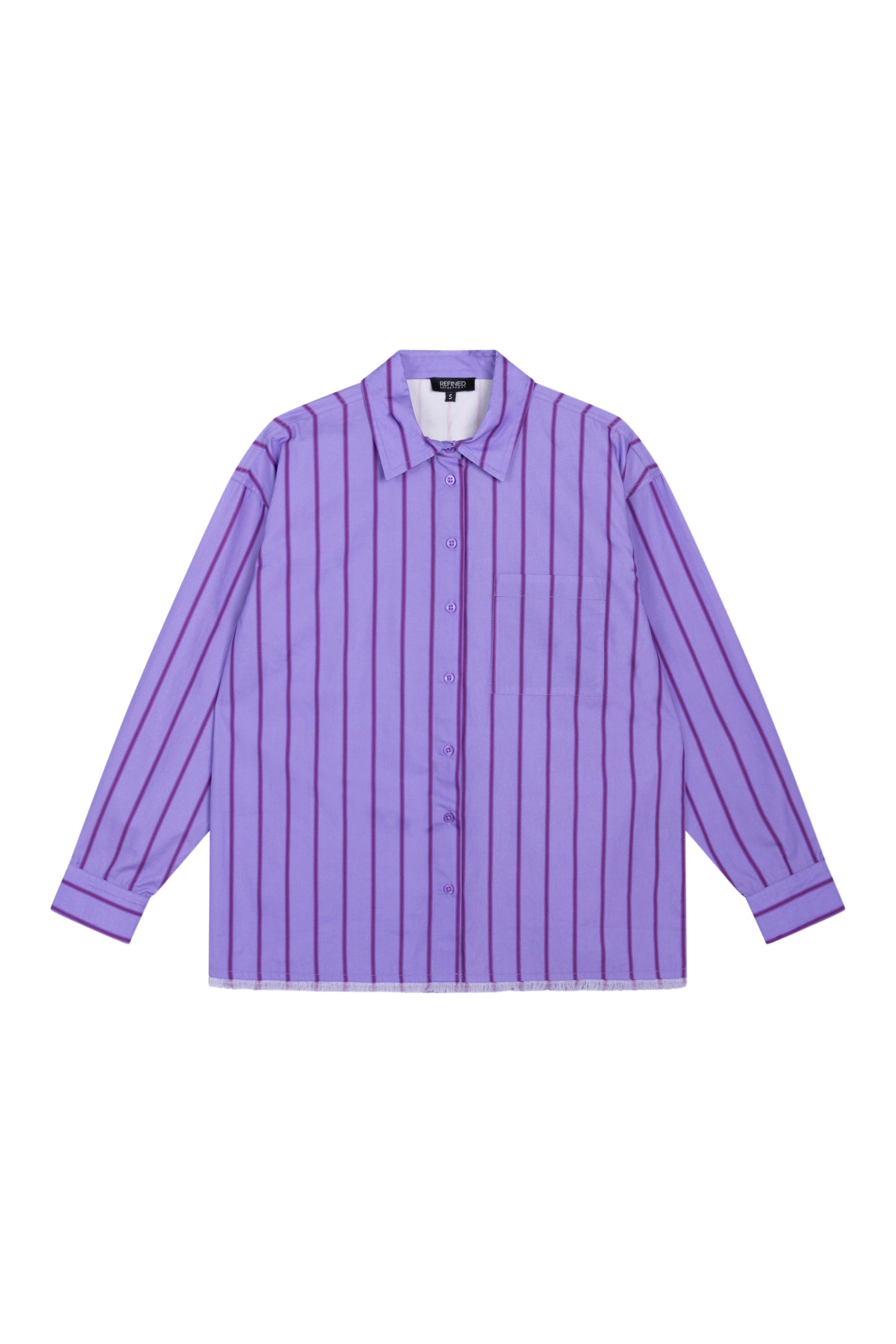 De Blouse Jazzy Lilac van Refined Department is een frisse, vrouwelijke blouse met een zachte lila tint en een donker paarse streep over de gehele blouse. De rechte pasvorm en klassieke details maken dit item tijdloos en stijlvol.