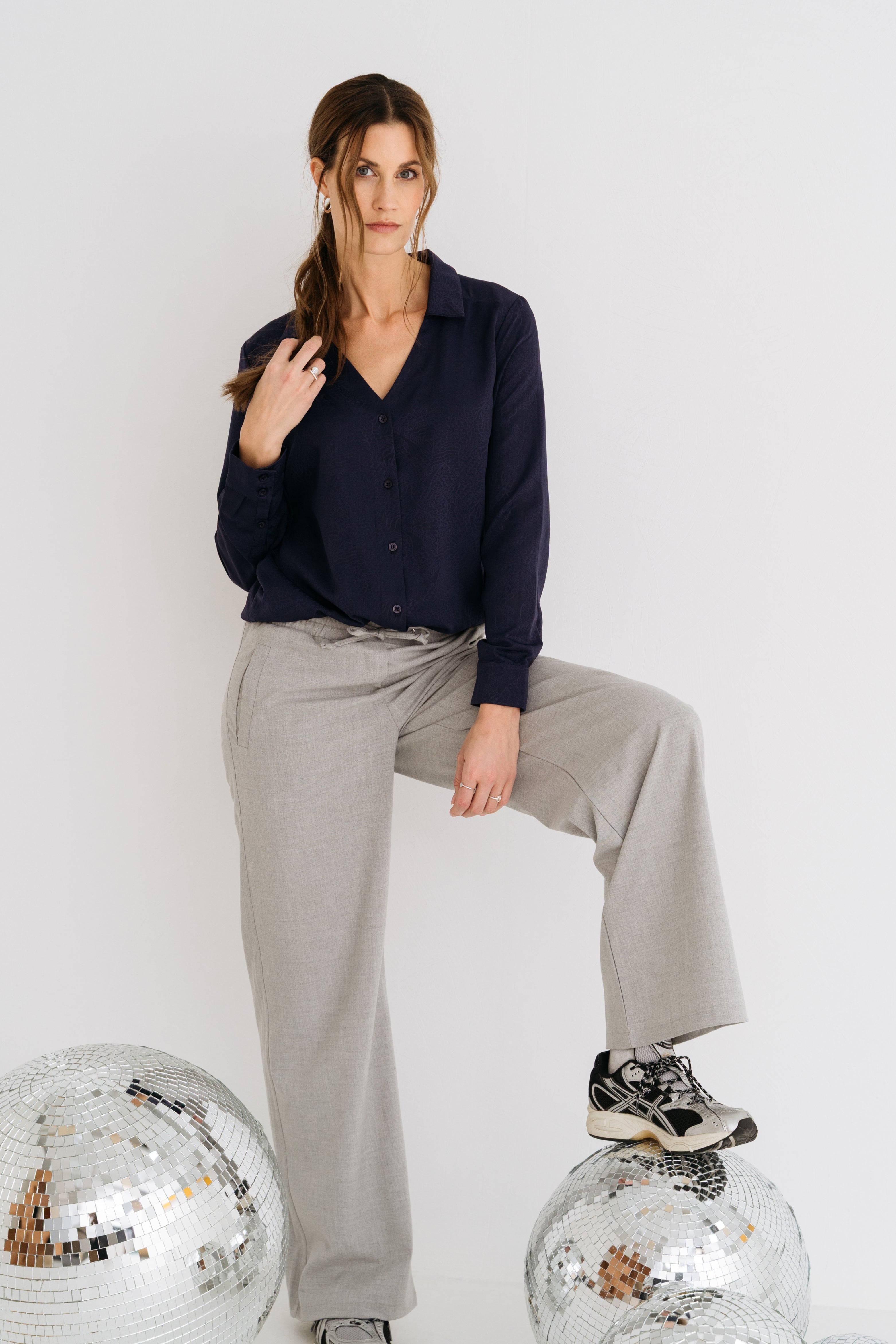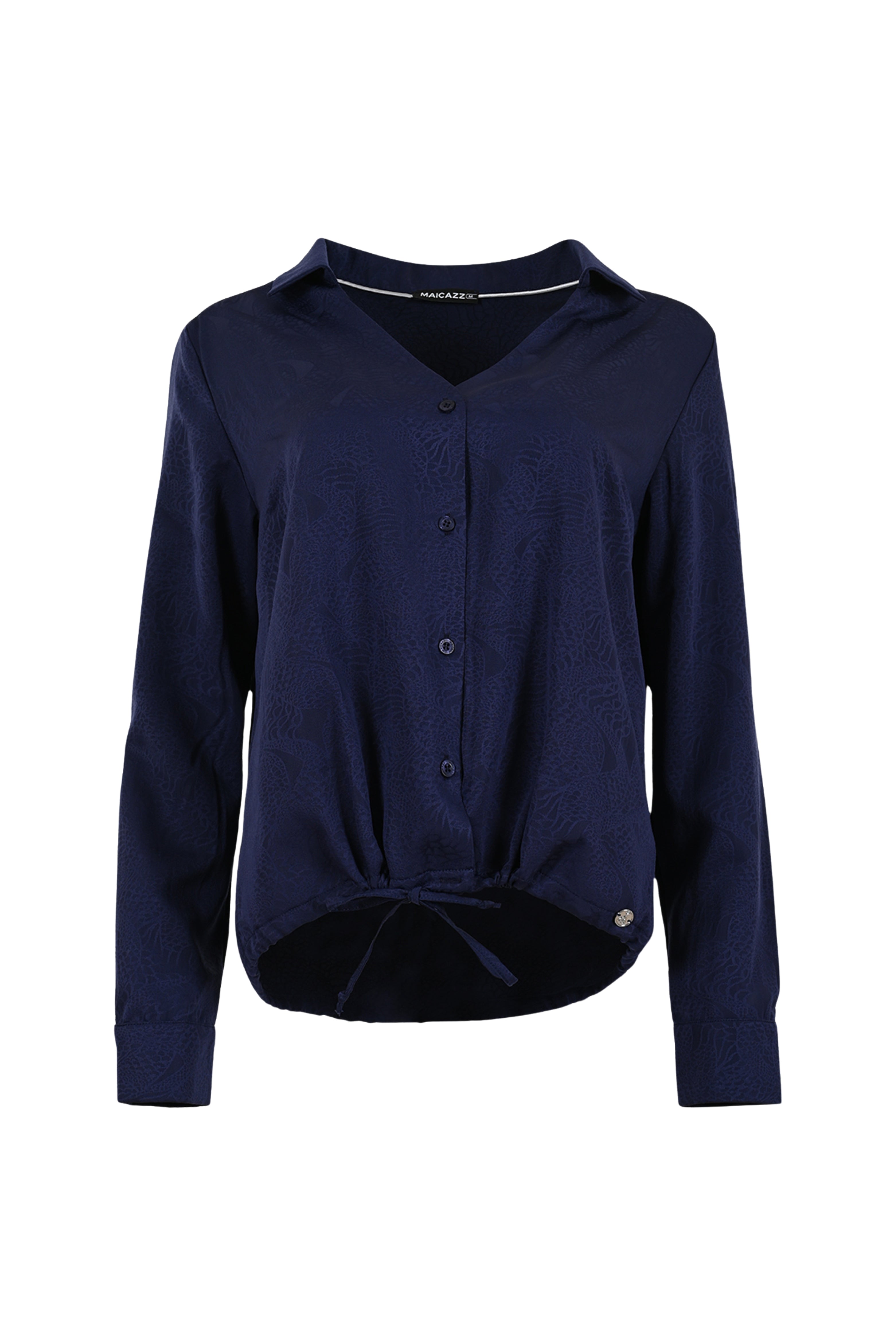 De Blouse Jolene Future Dusk van Maicazz is een elegante blouse met subtiele glans en structuur. De V-hals en het strikkoord aan de onderzijde zorgen voor een flatterend silhouet, terwijl de donkerblauwe tint een stijlvolle, tijdloze look geeft.