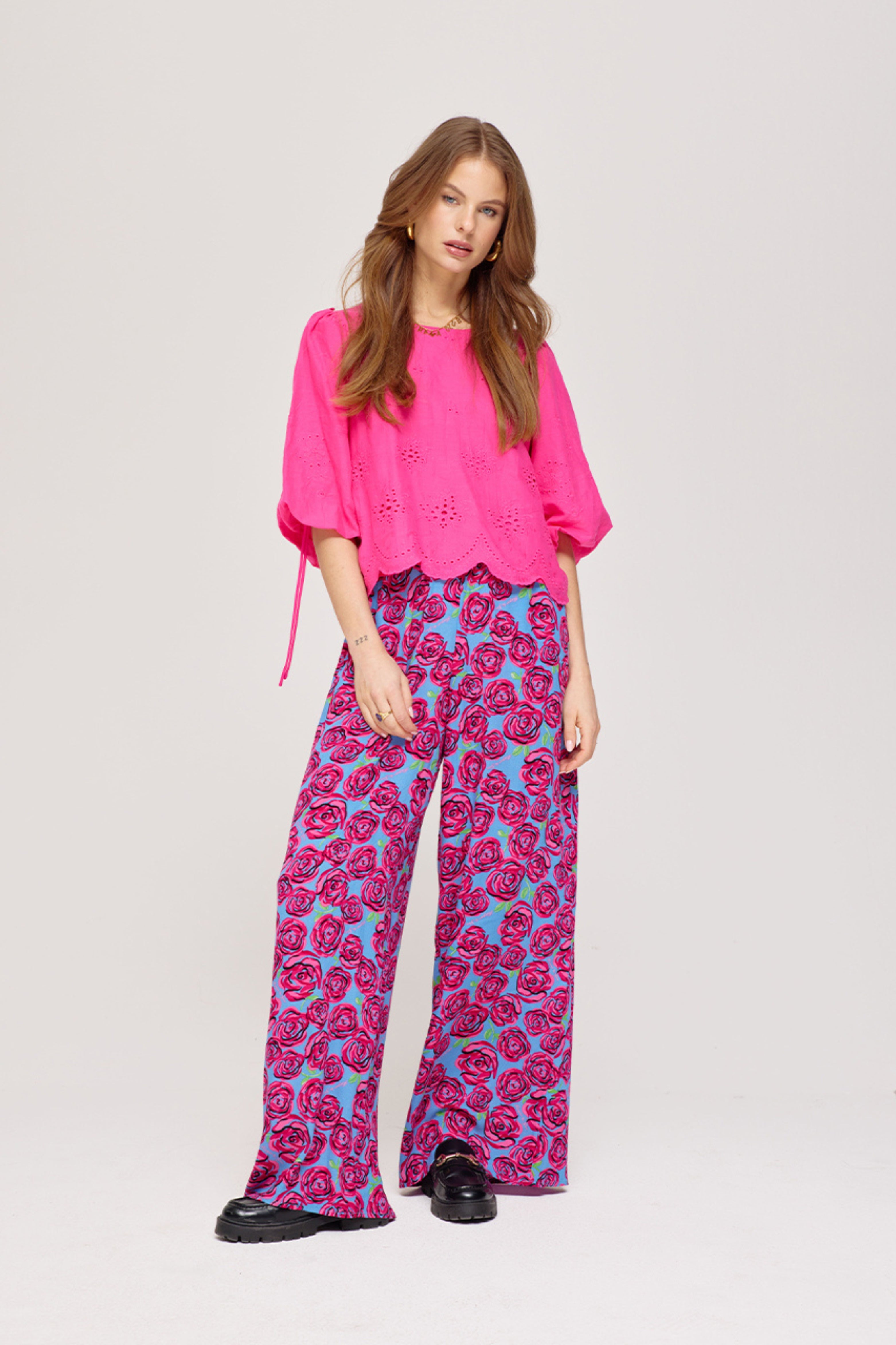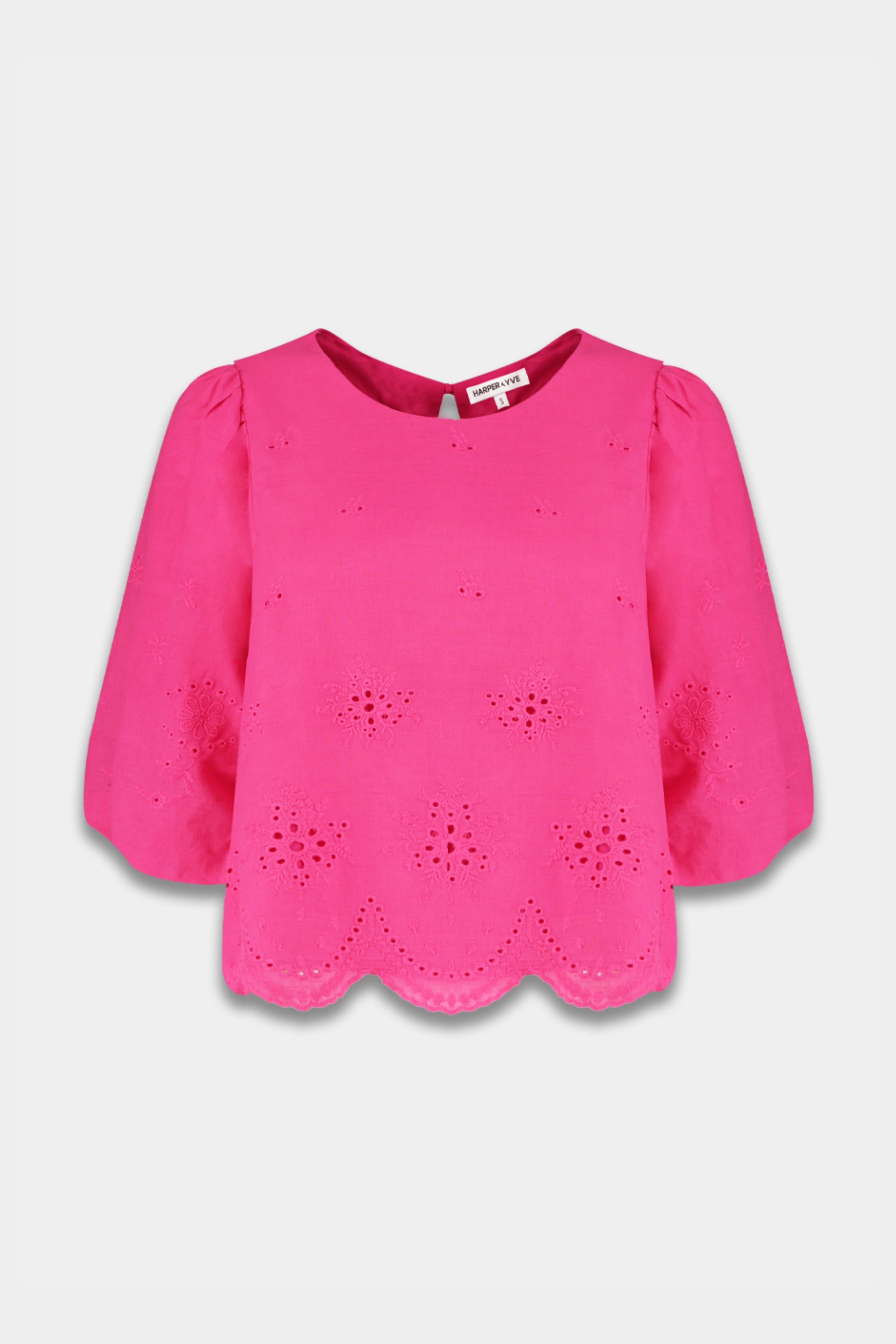 De Blouse Levy Hot Pink van Harper & Yve straalt elegantie en speelsheid uit met broderie details en een golvende zoom. De luchtige stof en pofmouwen maken het een perfecte keuze voor een frisse en modieuze look.