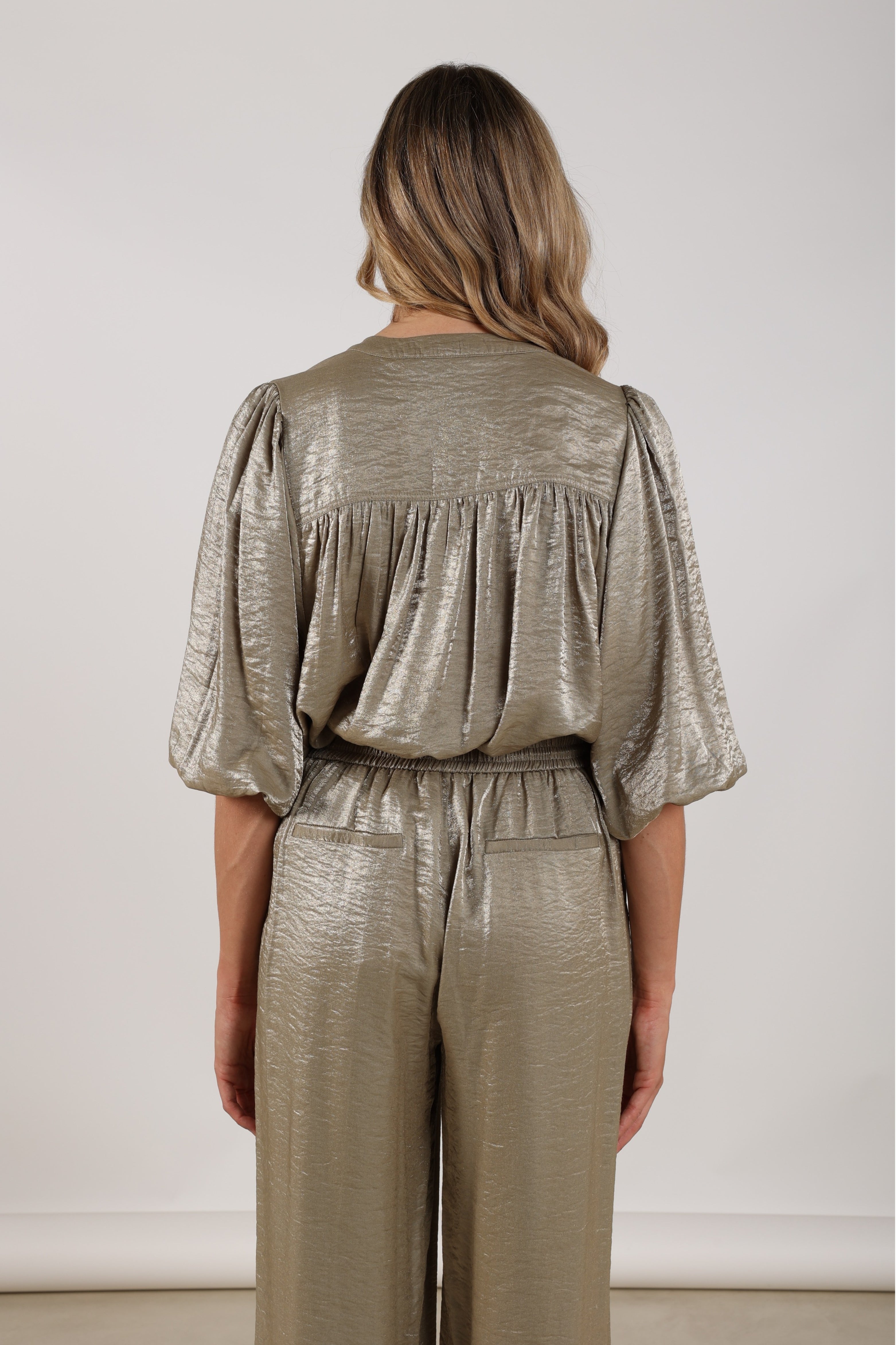 De Blouse Rosie Shiny Sand van Nukus is een chique blouse met opstaande V-hals. De glanzende crinkle-stof, sierbies langs de knoopsluiting en luchtige 3/4-mouwen geven een vrouwelijke look. Perfect voor feestelijke of zakelijke outfits.