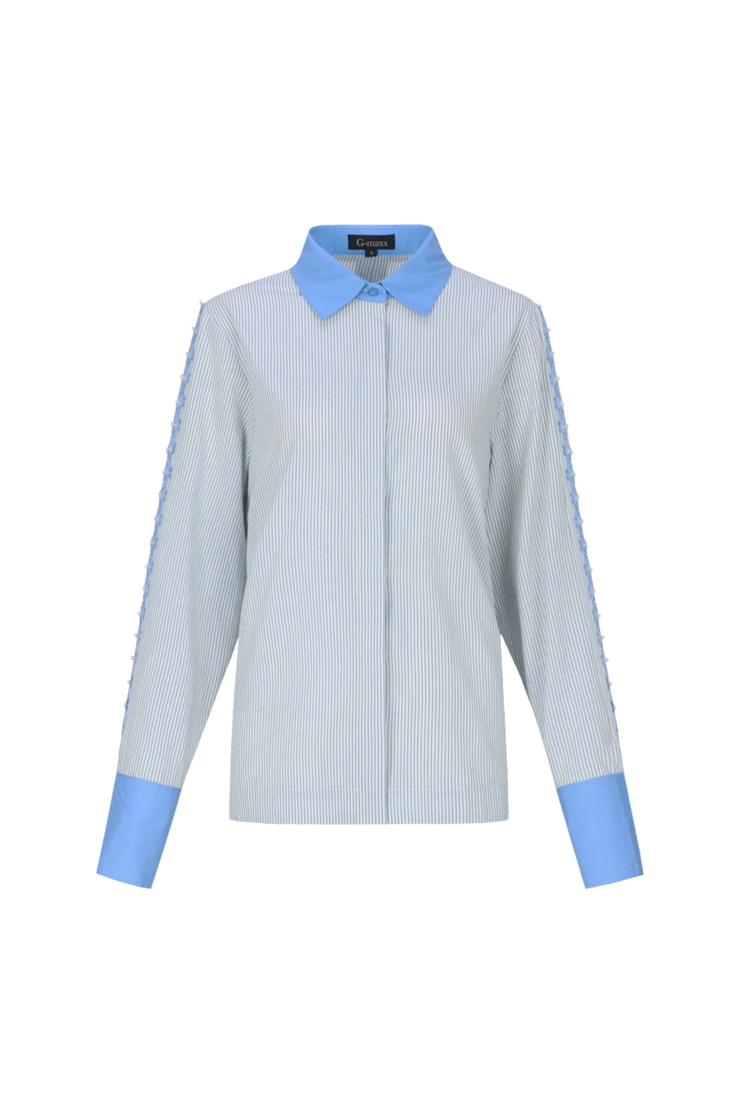 De Blouse Lucille Offwhite Celestial Blue van G-Maxx is een romantische blouse met klassieke kraag. Fijne streep met contrasterende blauwe kraag/manchetten en bloemkant langs de mouwen. Perfect voor kantoor of een casual chic dag.
