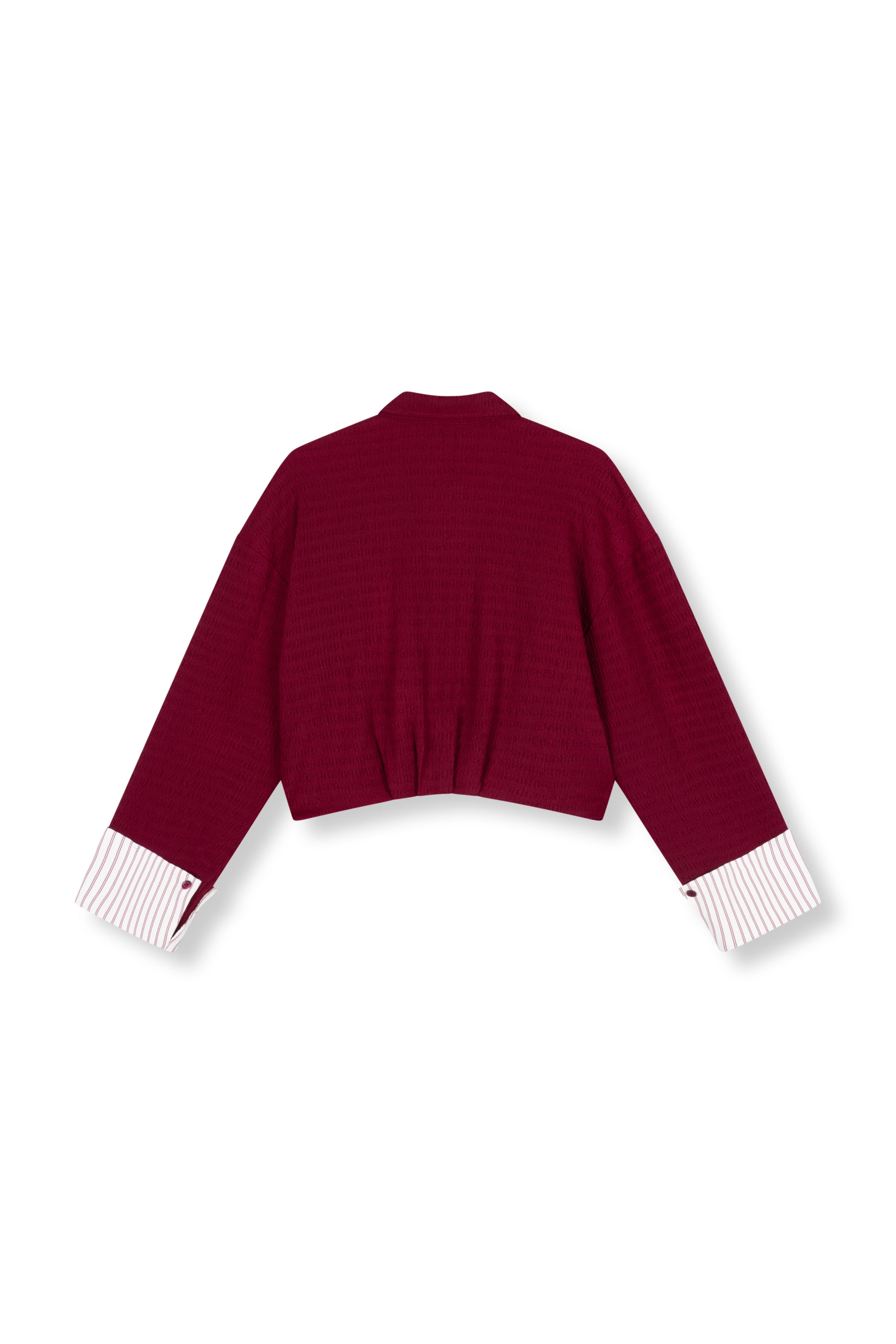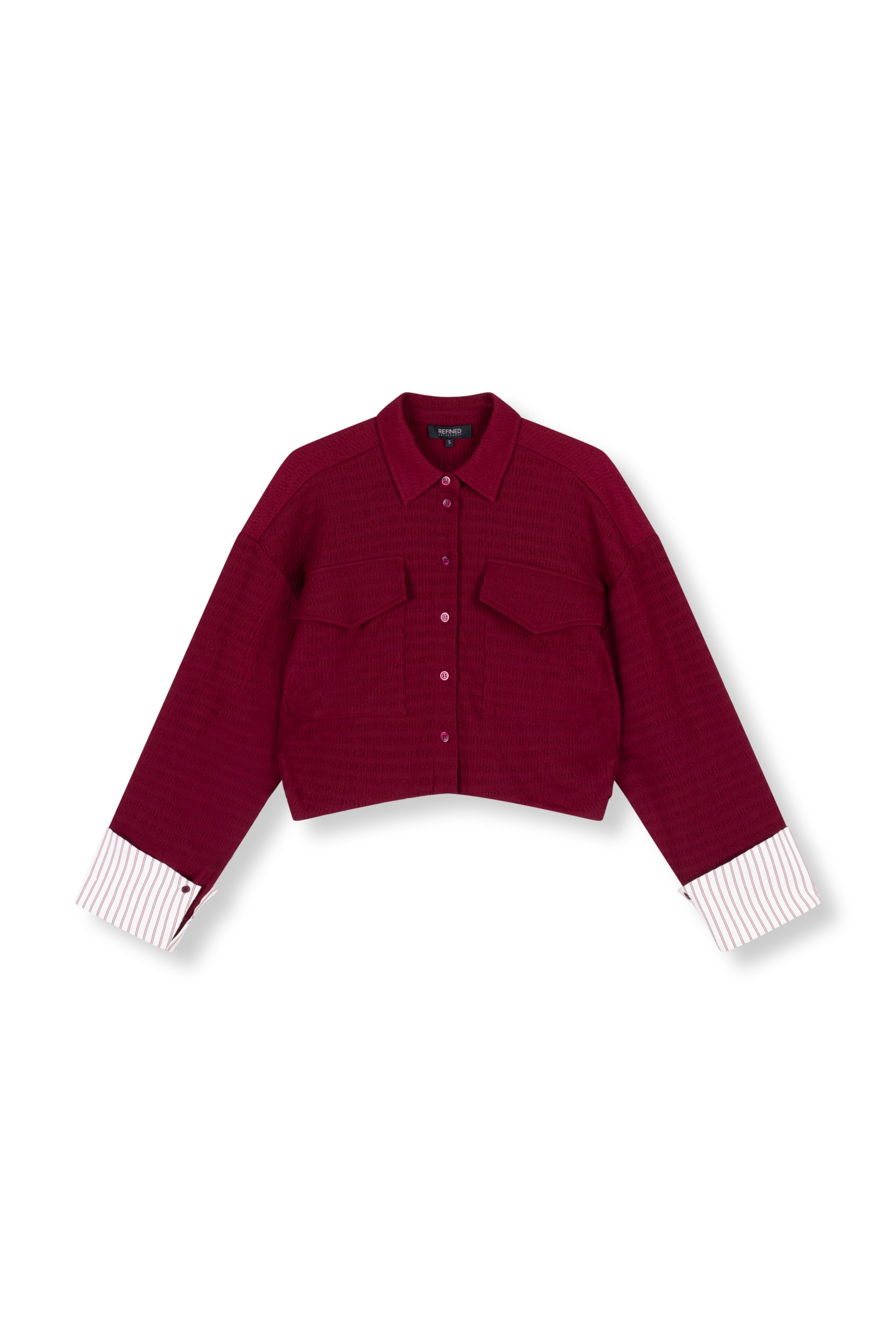 De Blouse Lyloe Bordeaux van Refined Department is een trendy cropped blouse met een stoere uitstraling. De opvallende borstzakken en contrasterende gestreepte manchetten maken dit item een echte eyecatcher in diepe bordeaux.