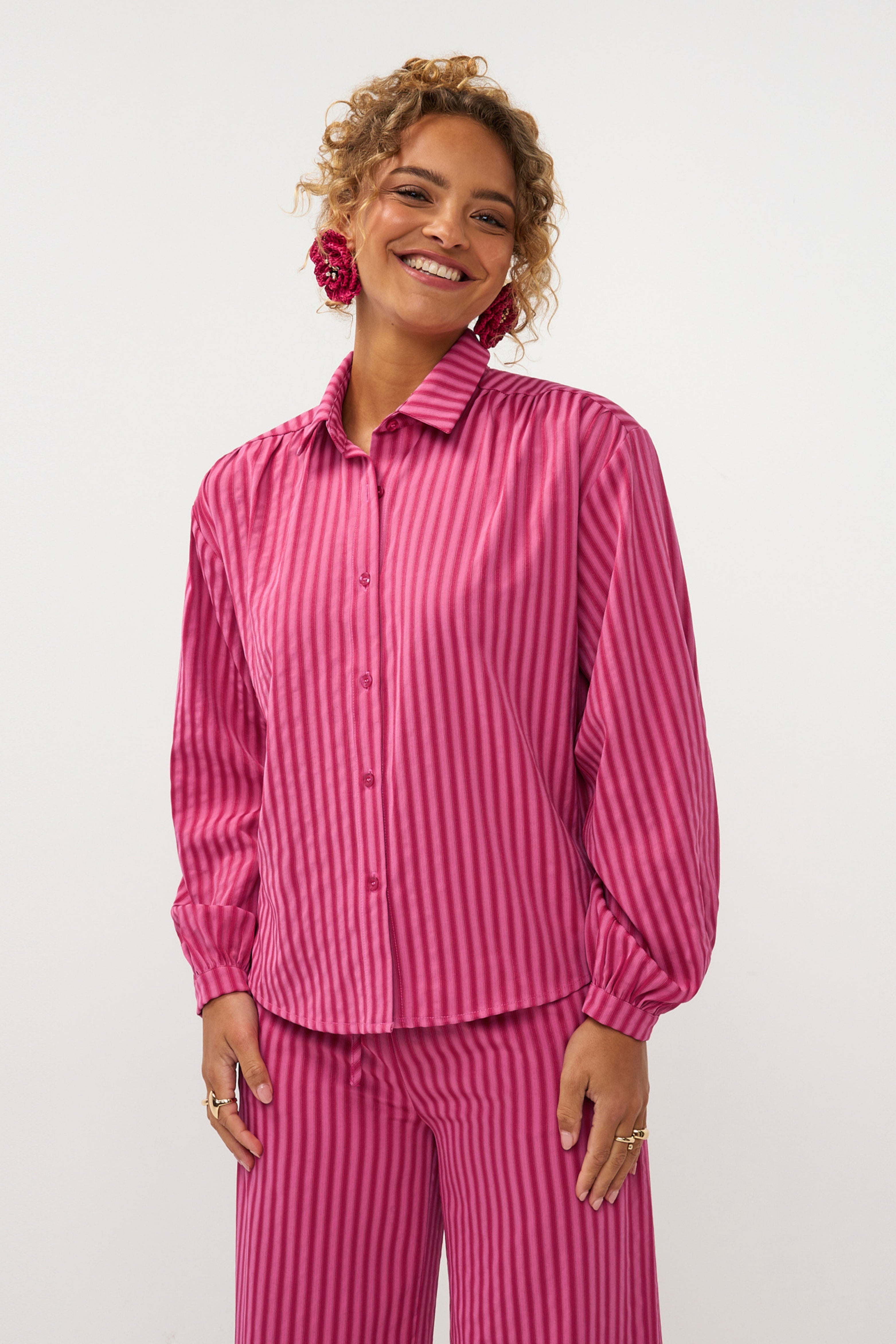 De Blouse Madelena Berry Pink van Ydence is een echte blikvanger dankzij de rijke berrykleur en verfijnde streepjacquard. De lichte pofmouwen en soepele stof geven de blouse een elegante, vrouwelijke uitstraling.
