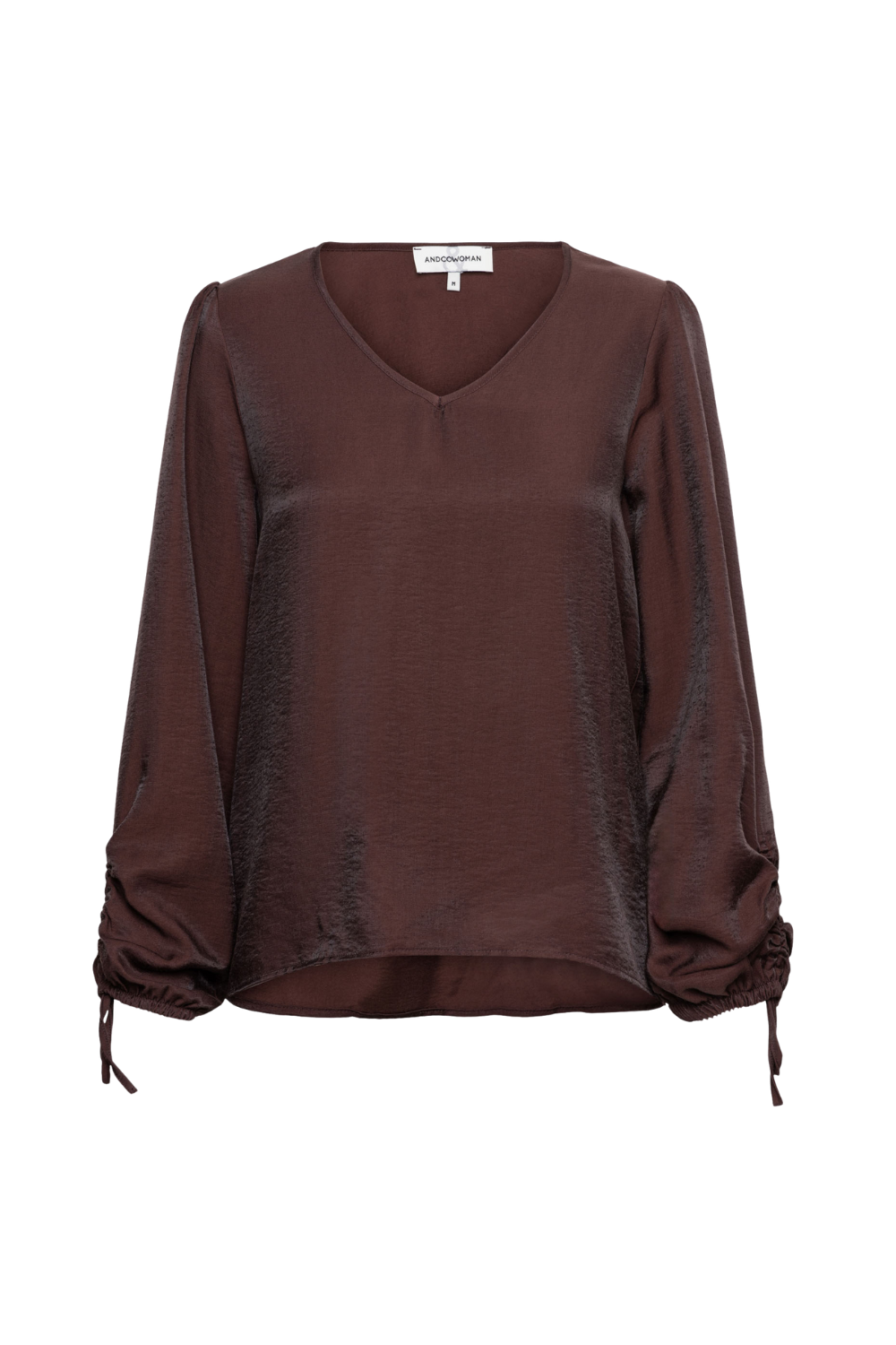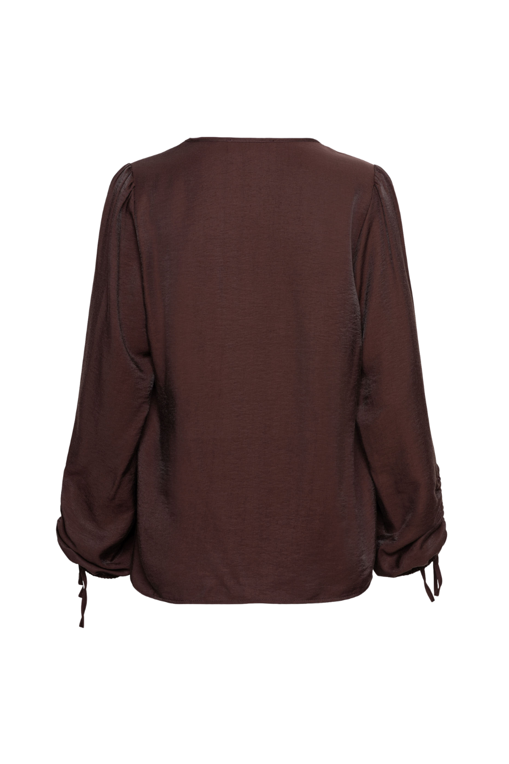 Blouse Marbelle Chocolate van &Co Woman is een elegante blouse in een rijke chocoladetint. De vrouwelijke V-hals, luxe licht glanzende stof en geplooide mouwen met strikkoord geven dit item een stijlvolle uitstraling. Perfect om zowel overdag als ’s avonds te dragen.