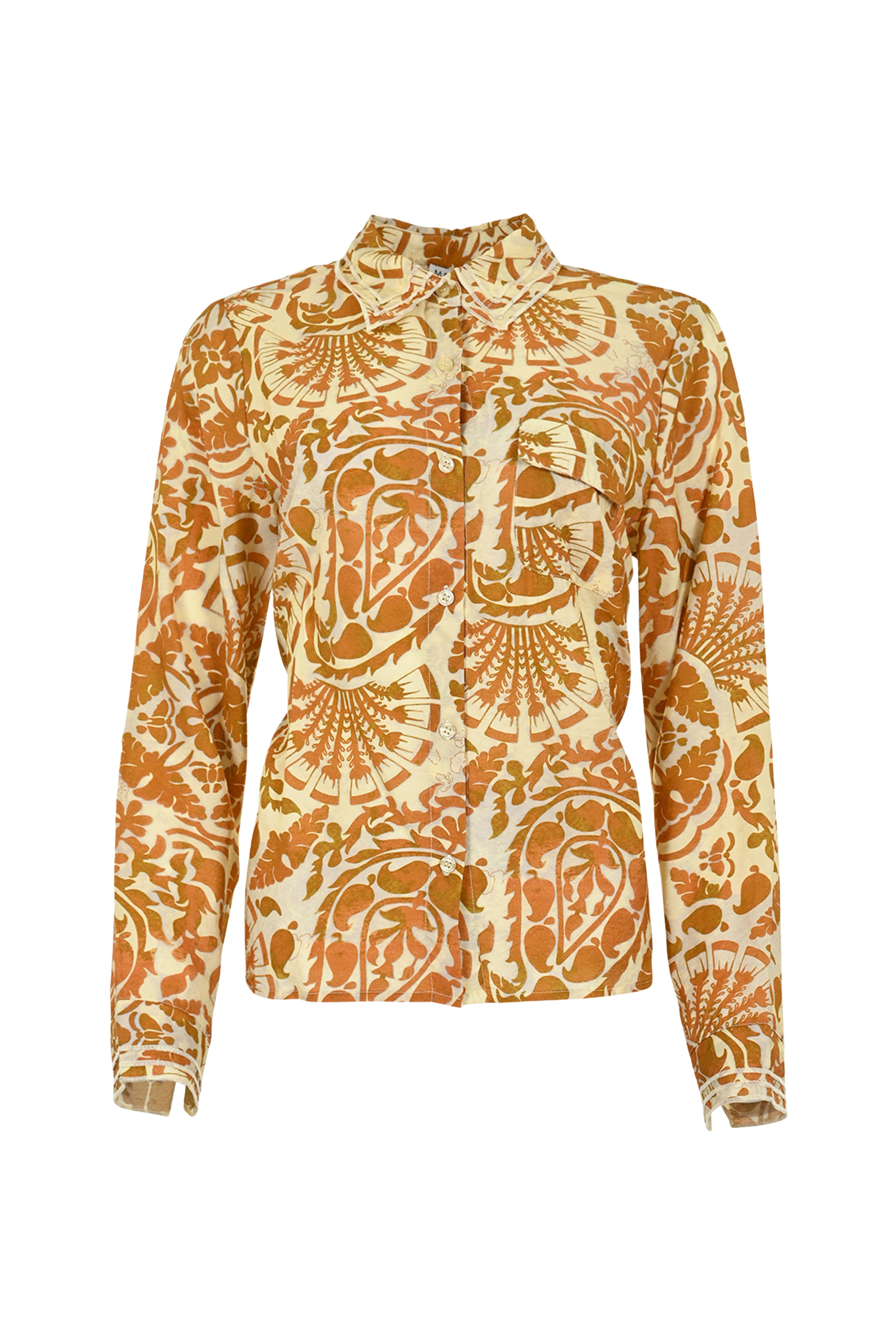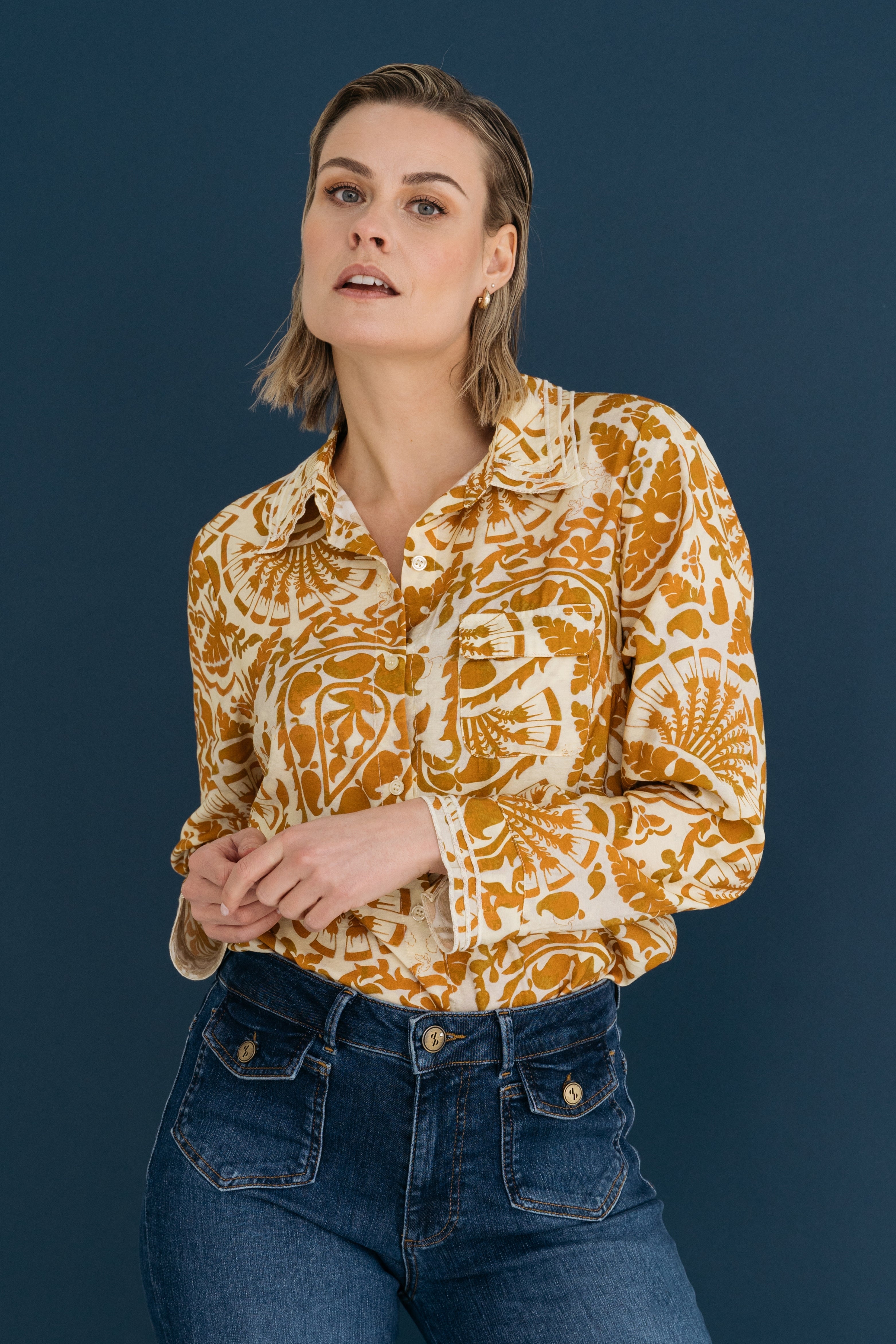 Blouse Parin Flower van Maicazz is een stijlvolle blouse met een warme bloemenprint in oranje- en aardetinten. De soepele stof, klassieke kraag en lange mouwen maken dit item perfect voor een elegante en moderne look.