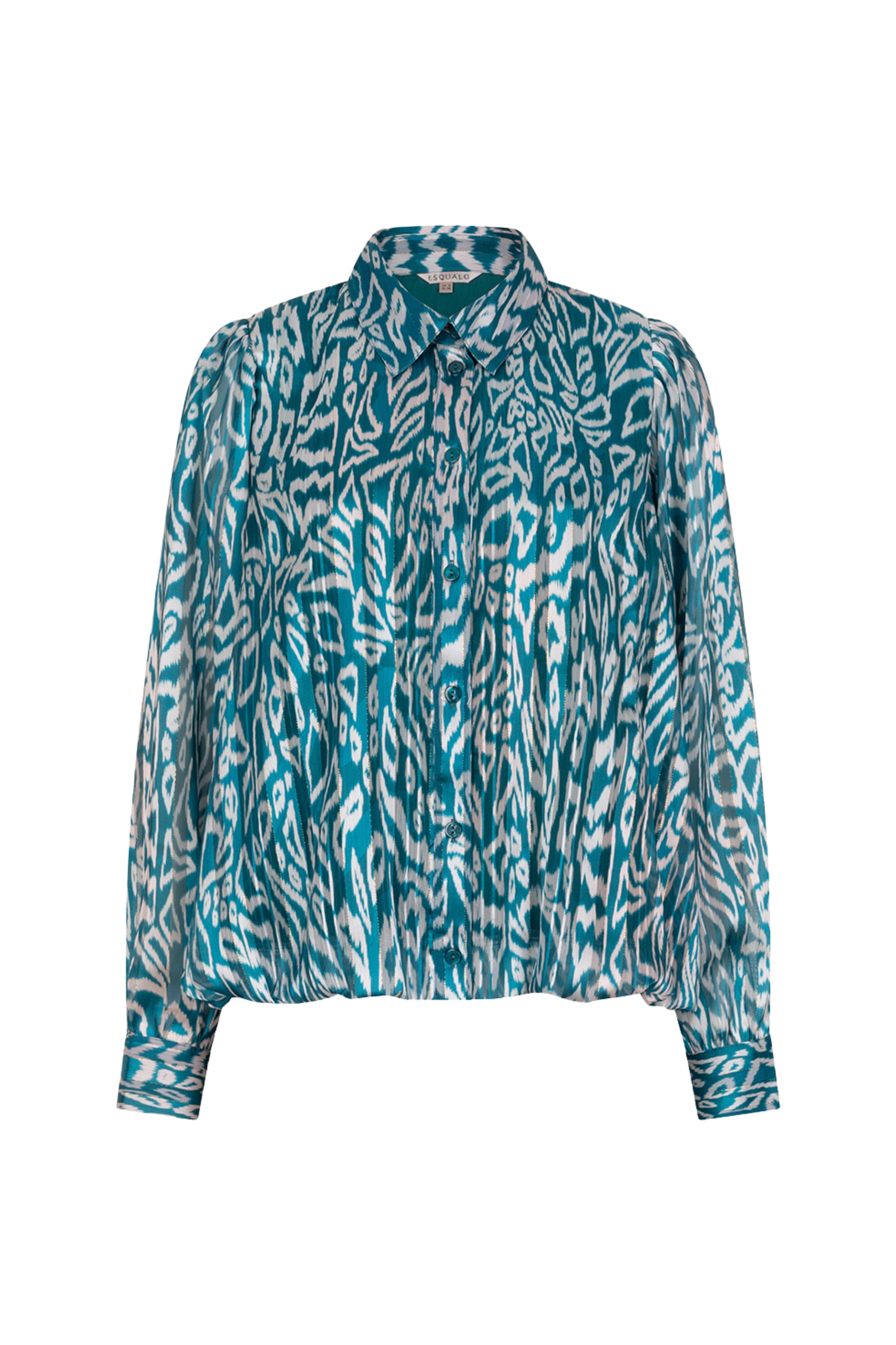De Blouse Puffed Hem Crystal Glow Print van EsQualo heeft een opvallende all-over print in turquoise en offwhite. Met de elastische zoom en luchtige stof is dit een stijlvolle blouse met een speels en modern karakter.