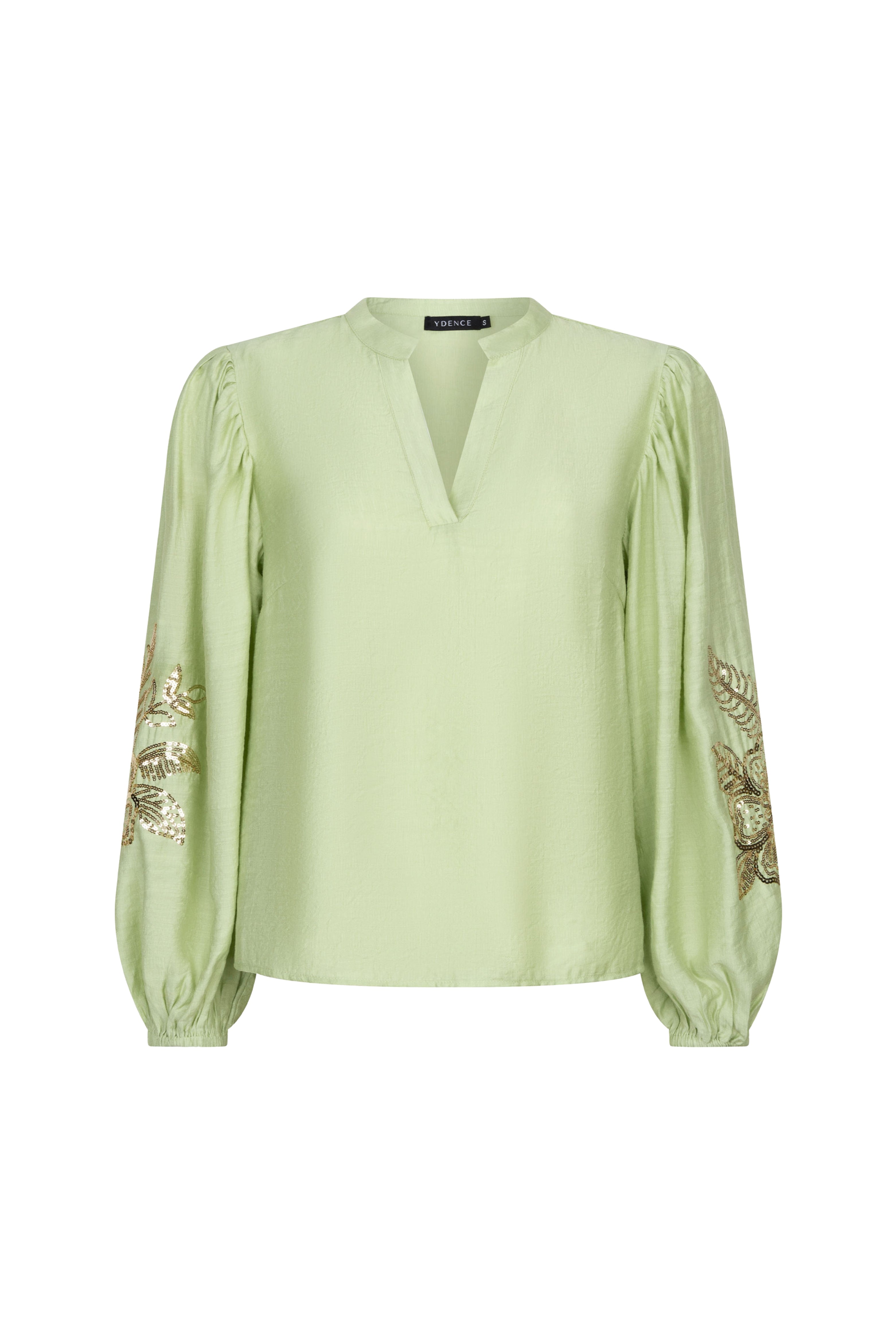 De Blouse Rose Soft Green van Ydence is een elegante blouse met een zachte glans en verfijnd goudkleurig borduurwerk op de mouwen. De frisse kleur en vrouwelijke pasvorm maken dit item perfect voor een stijlvolle outfit.
