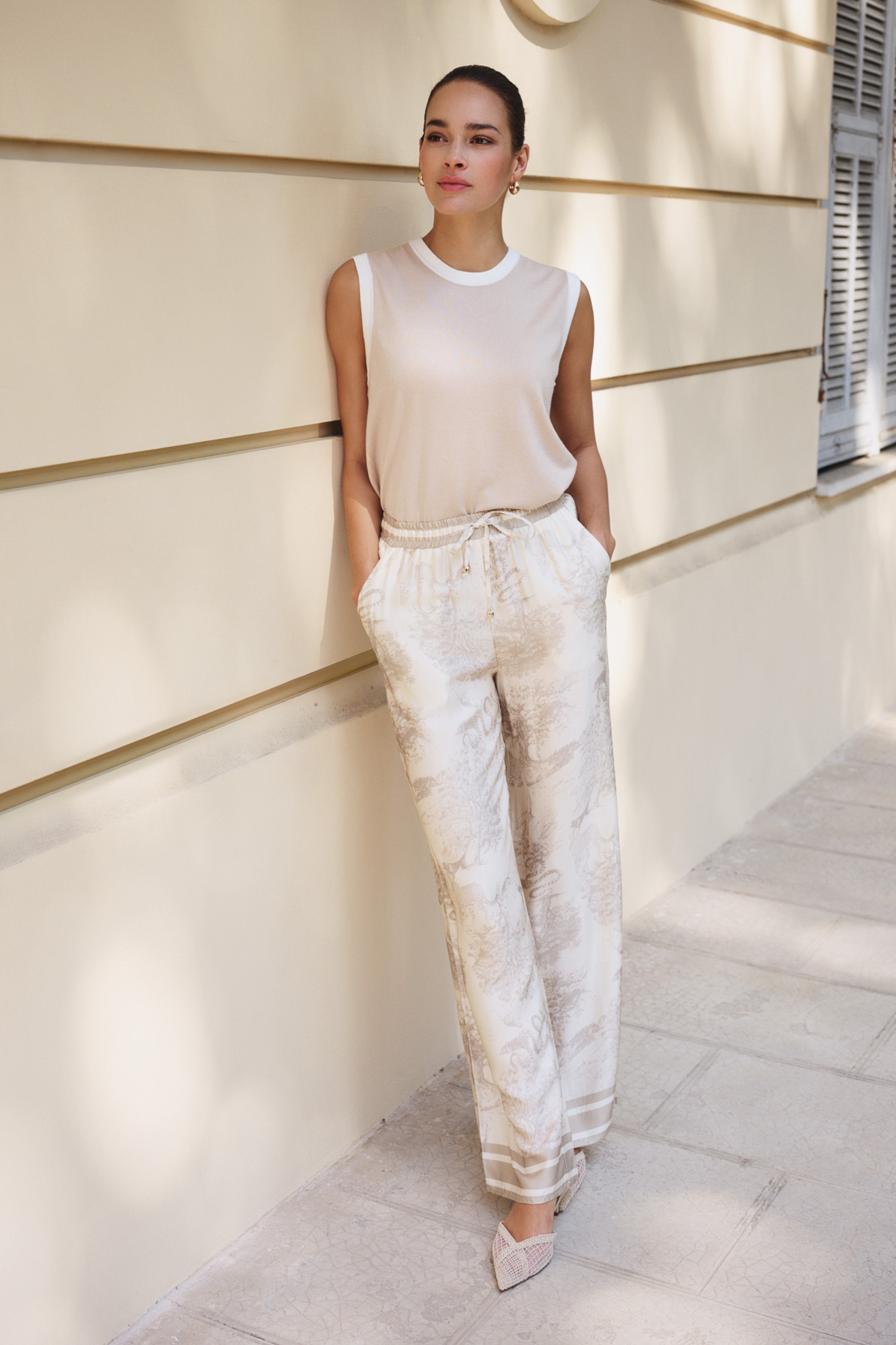 • Het eerste campagne model is 173 cm, het tweede campagne model is 175 cm, beiden dragen maat S