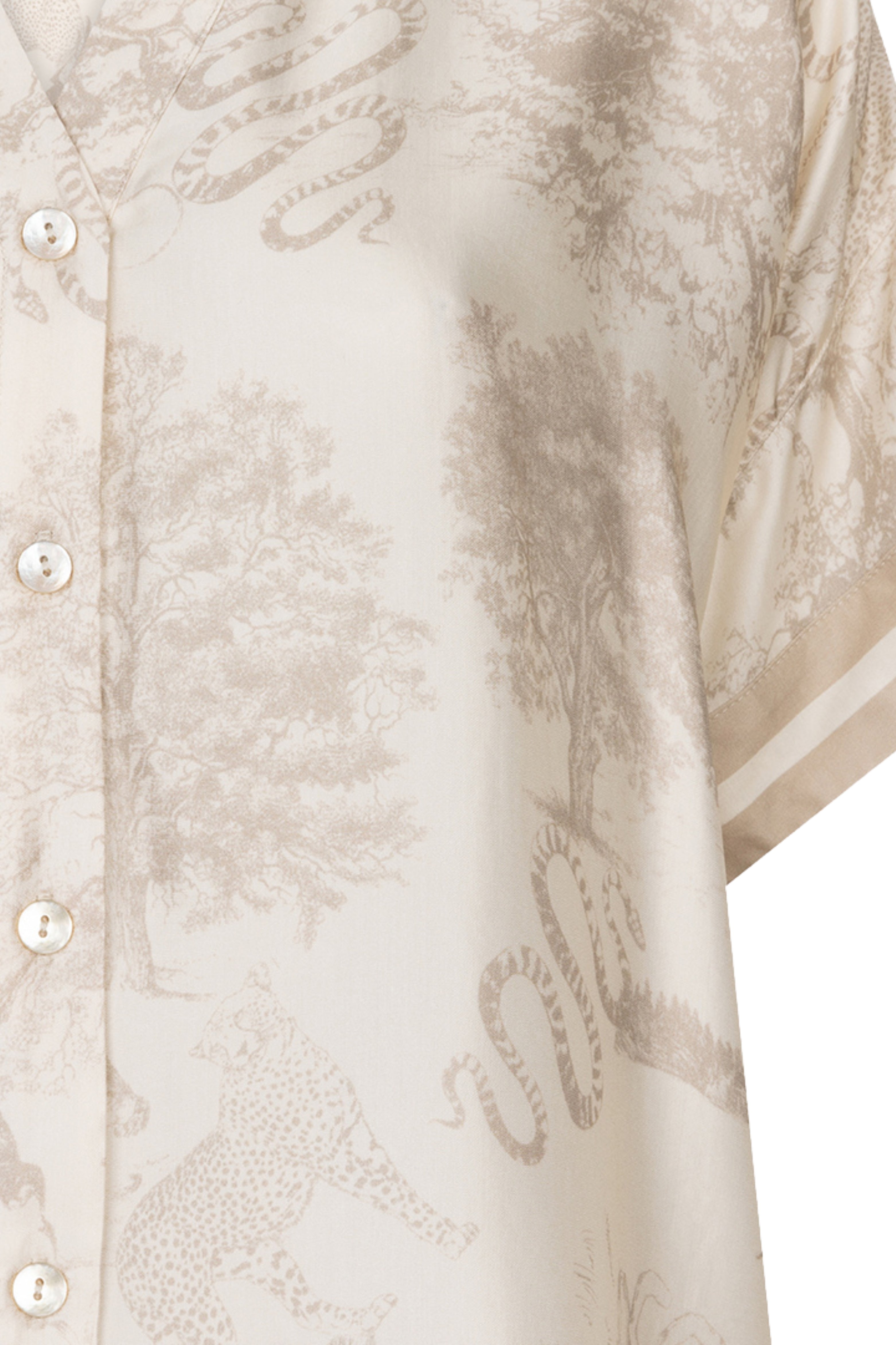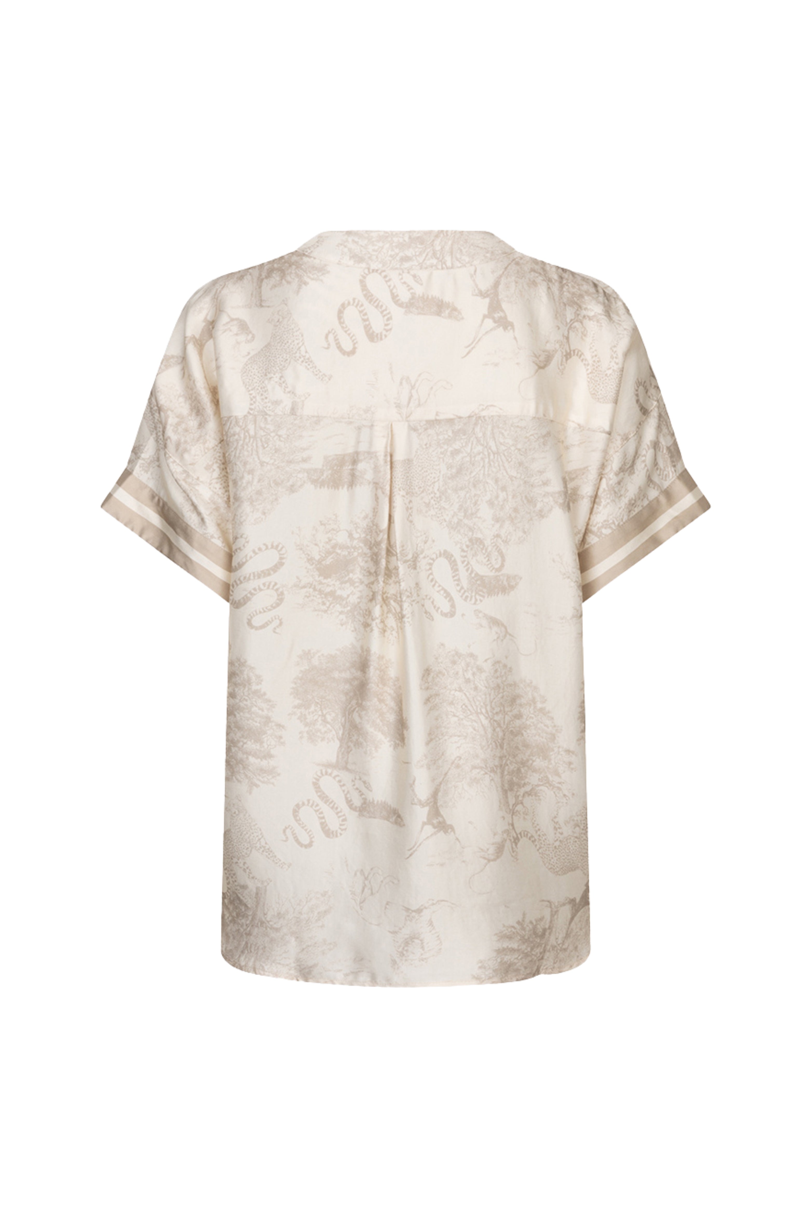 De Blouse Safari Print van Esqualo is een luchtige blouse met een verfijnde safari print in zachte natuurtinten. De doorknoopsluiting, korte mouwen en subtiele glans geven de blouse een elegante en zomerse uitstraling.