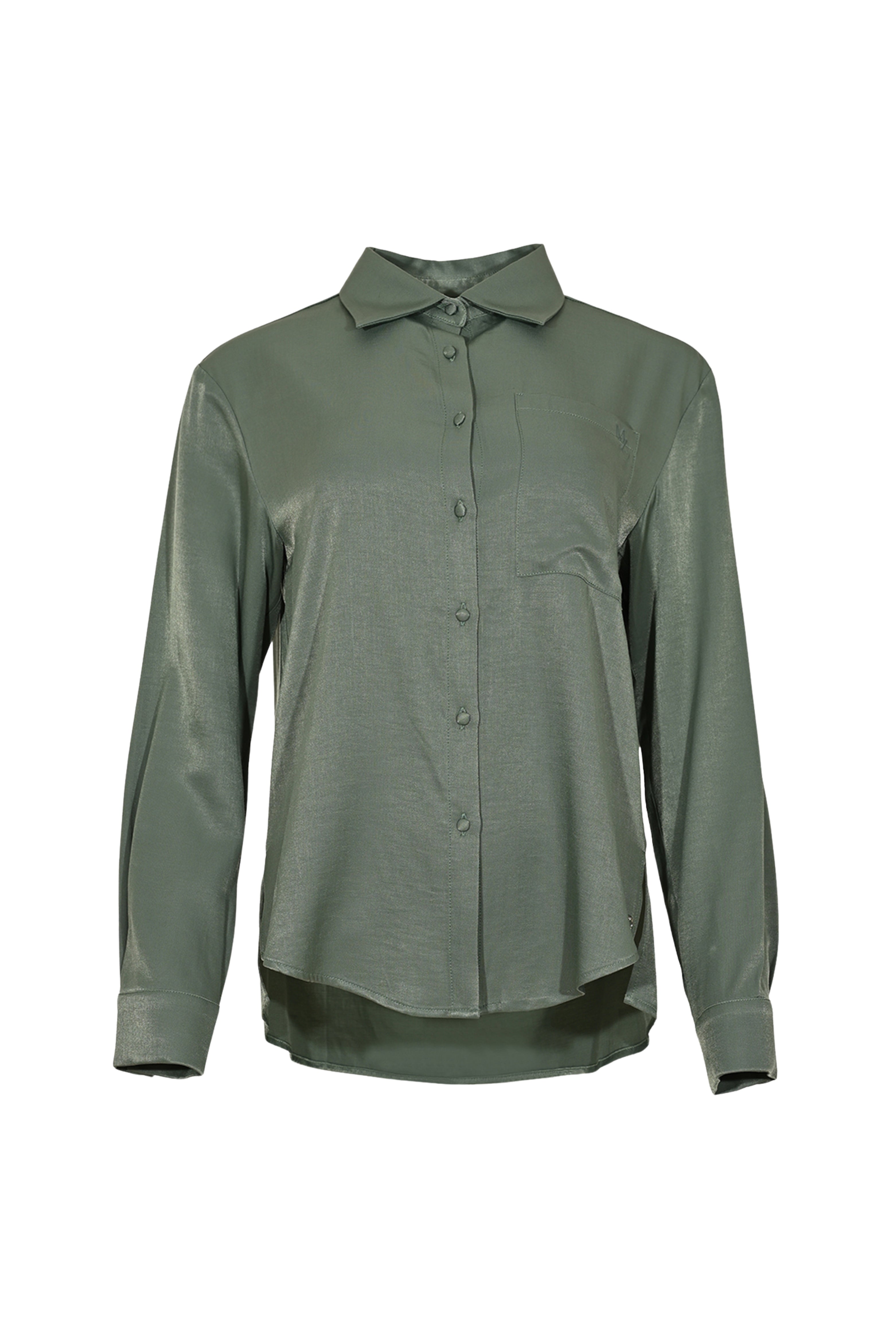 De Blouse Shoot Green Smoke van Maicazz is een elegante blouse met klassieke kraag. De subtiele glans en soepele stof vallen mooi om het lichaam. Perfect voor zowel kantoor als avondjes uit.