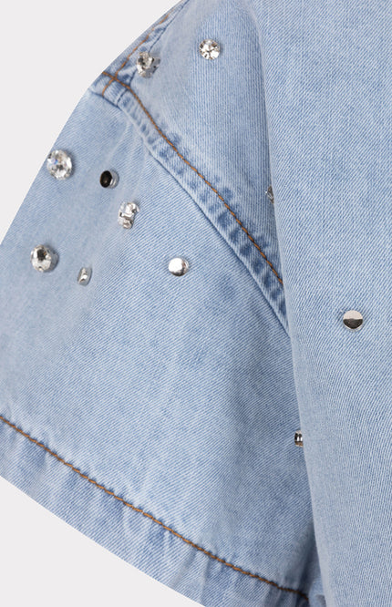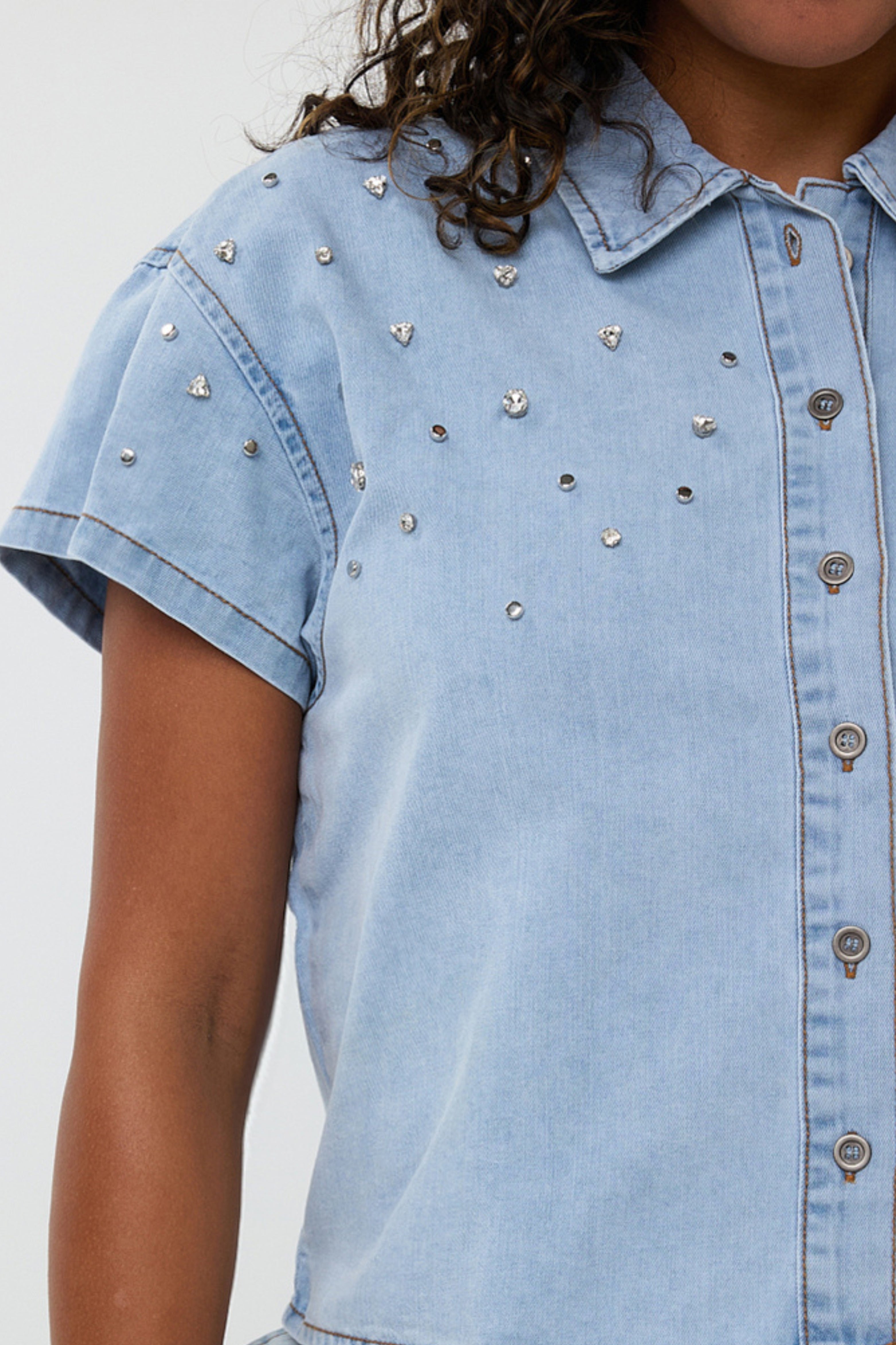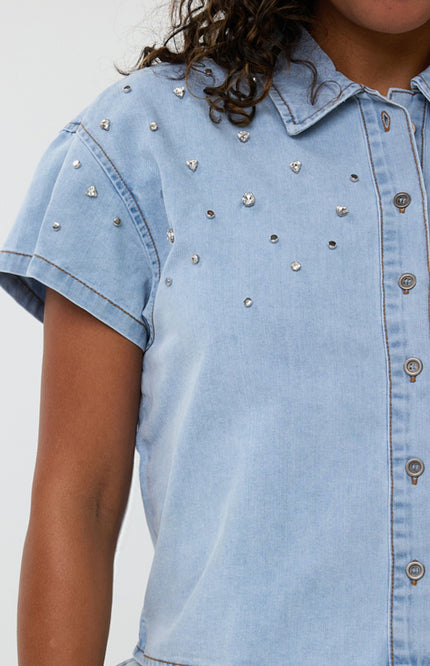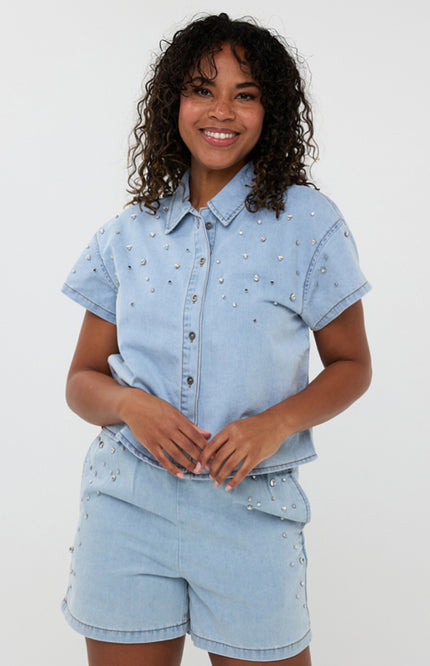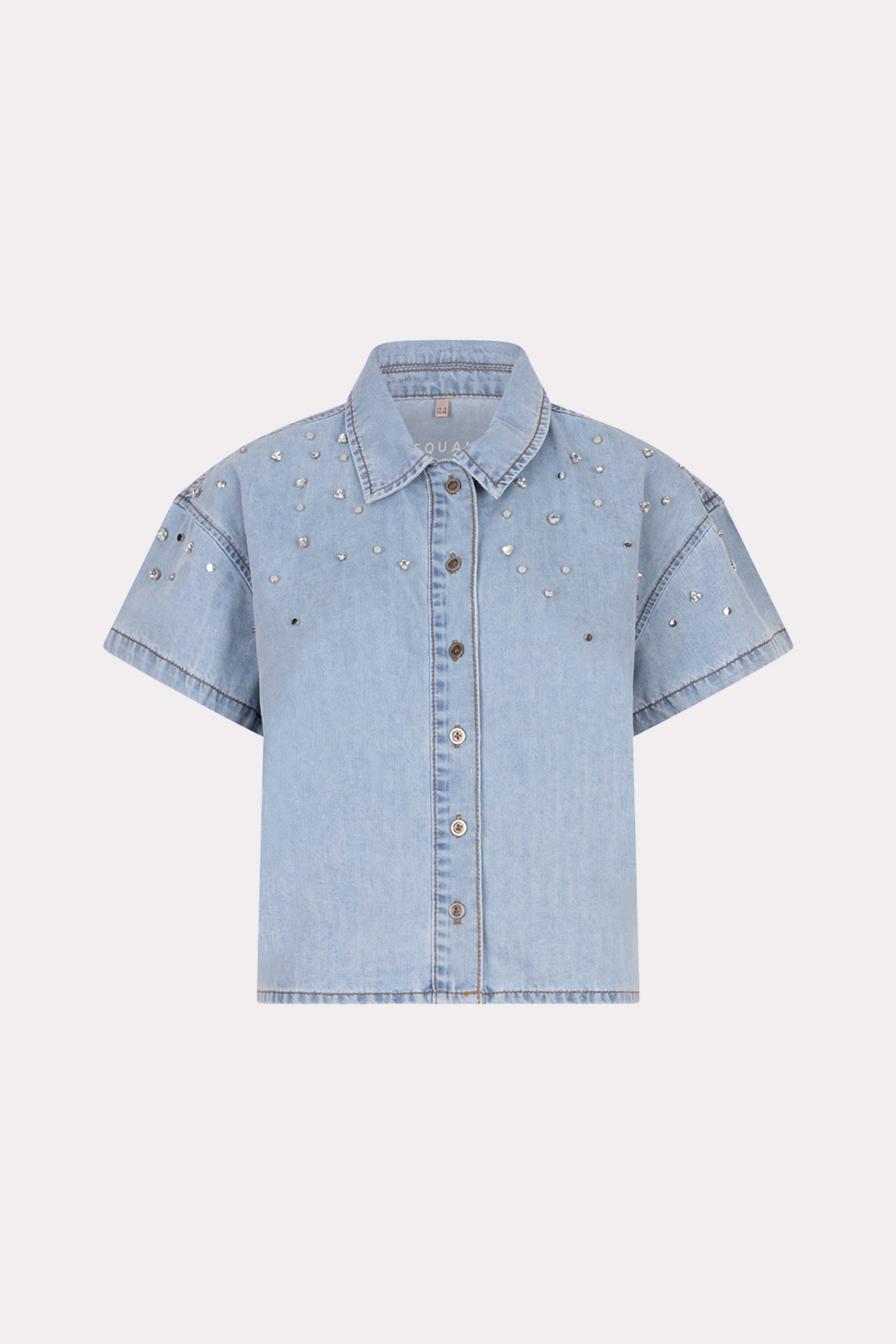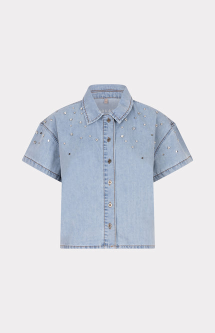 De Blouse Short Embellished Jeans Blue van Esqualo is een speelse denimblouse met korte mouwen en fonkelende strassdetails. Een trendy item dat je outfit net dat beetje extra geeft.