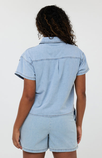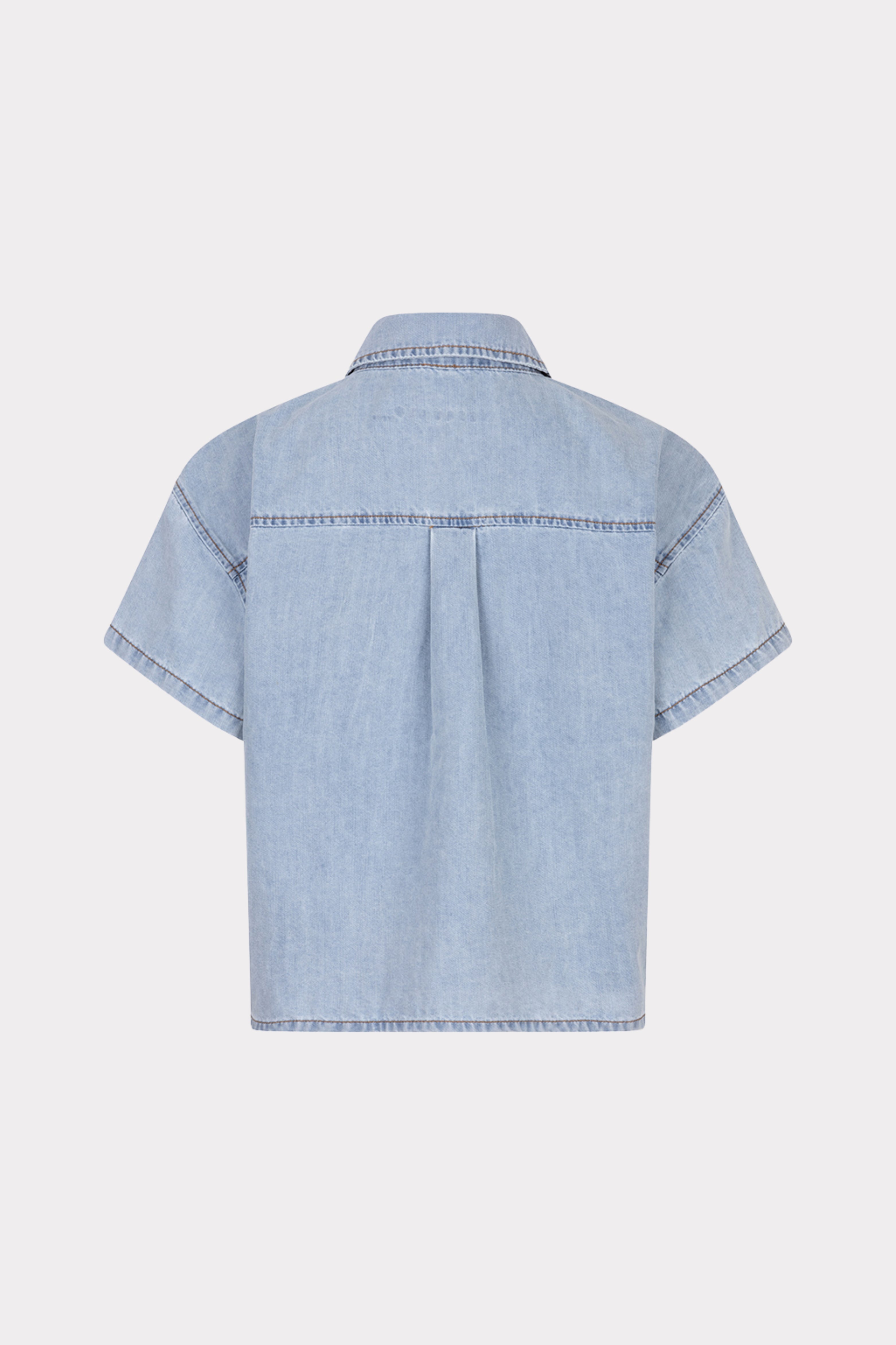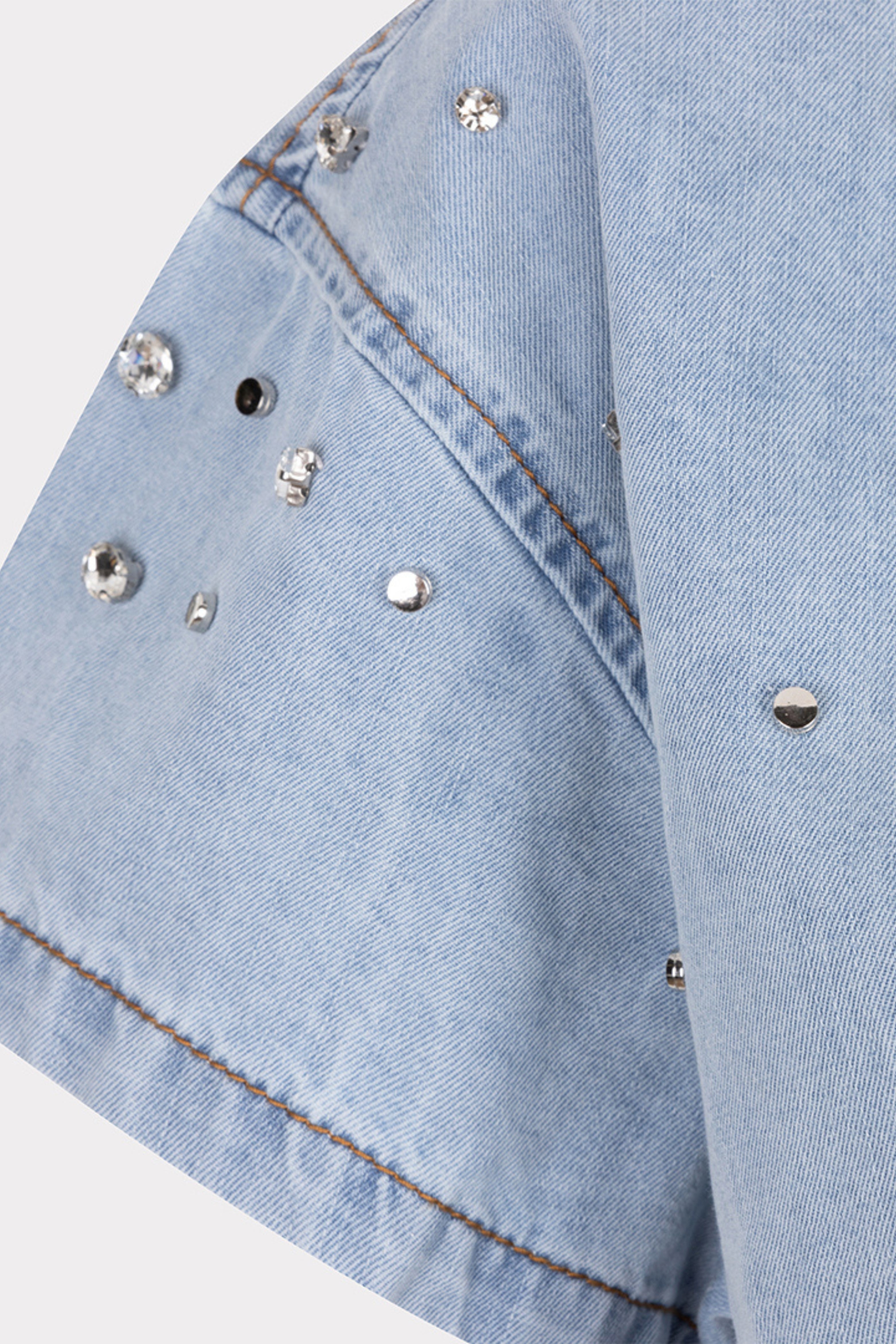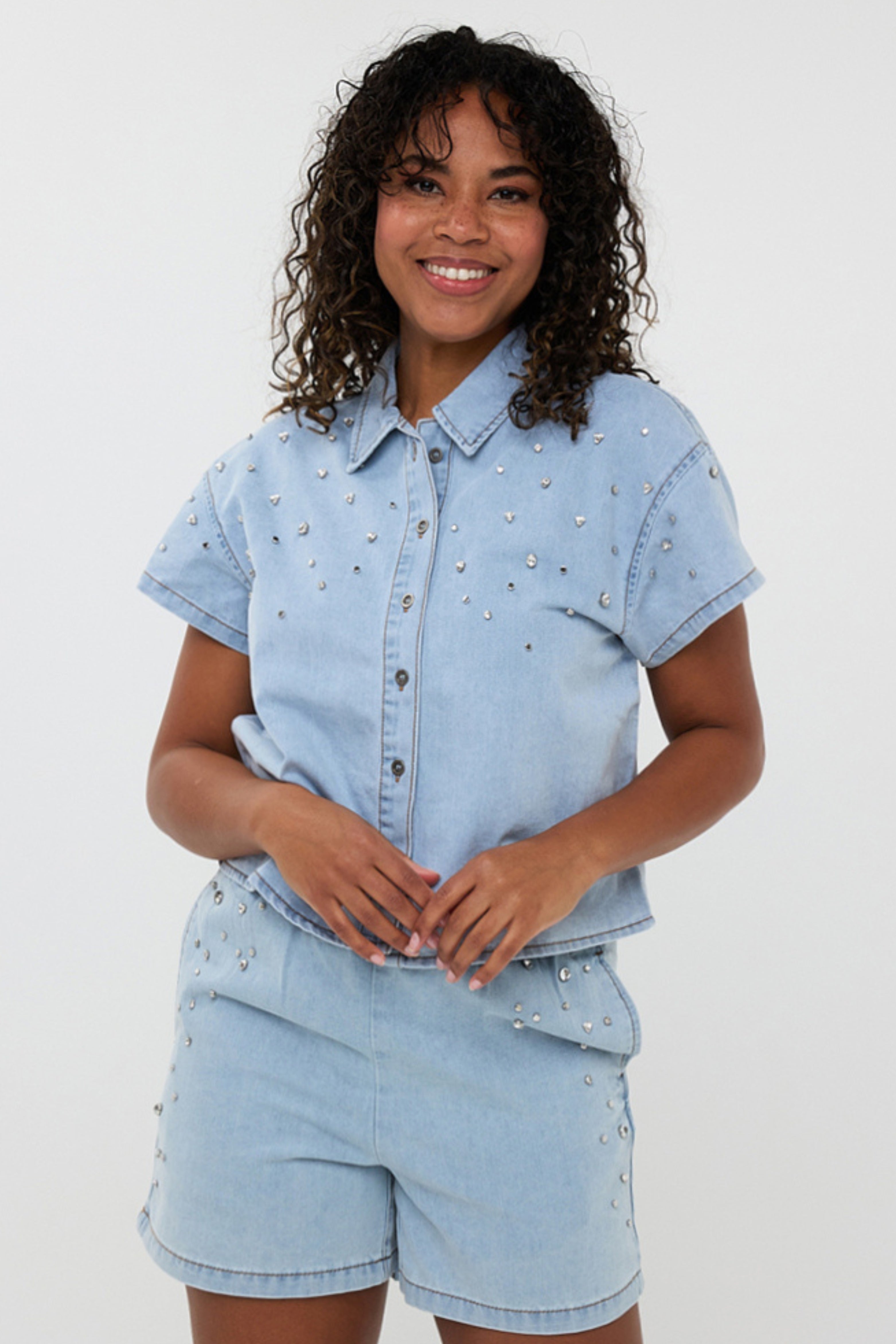 De Blouse Short Embellished Jeans Blue van Esqualo is een speelse denimblouse met korte mouwen en fonkelende strassdetails. Een trendy item dat je outfit net dat beetje extra geeft.