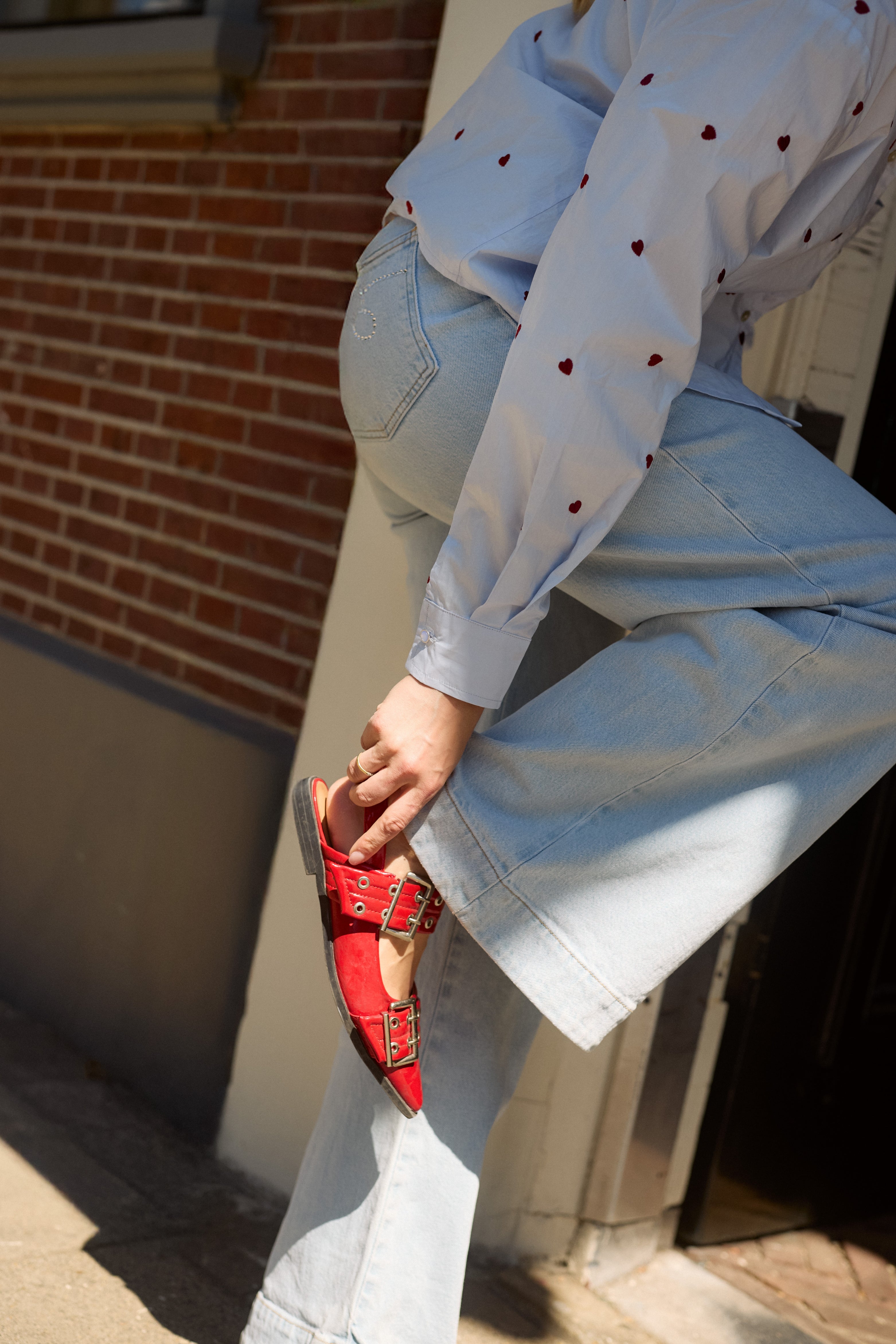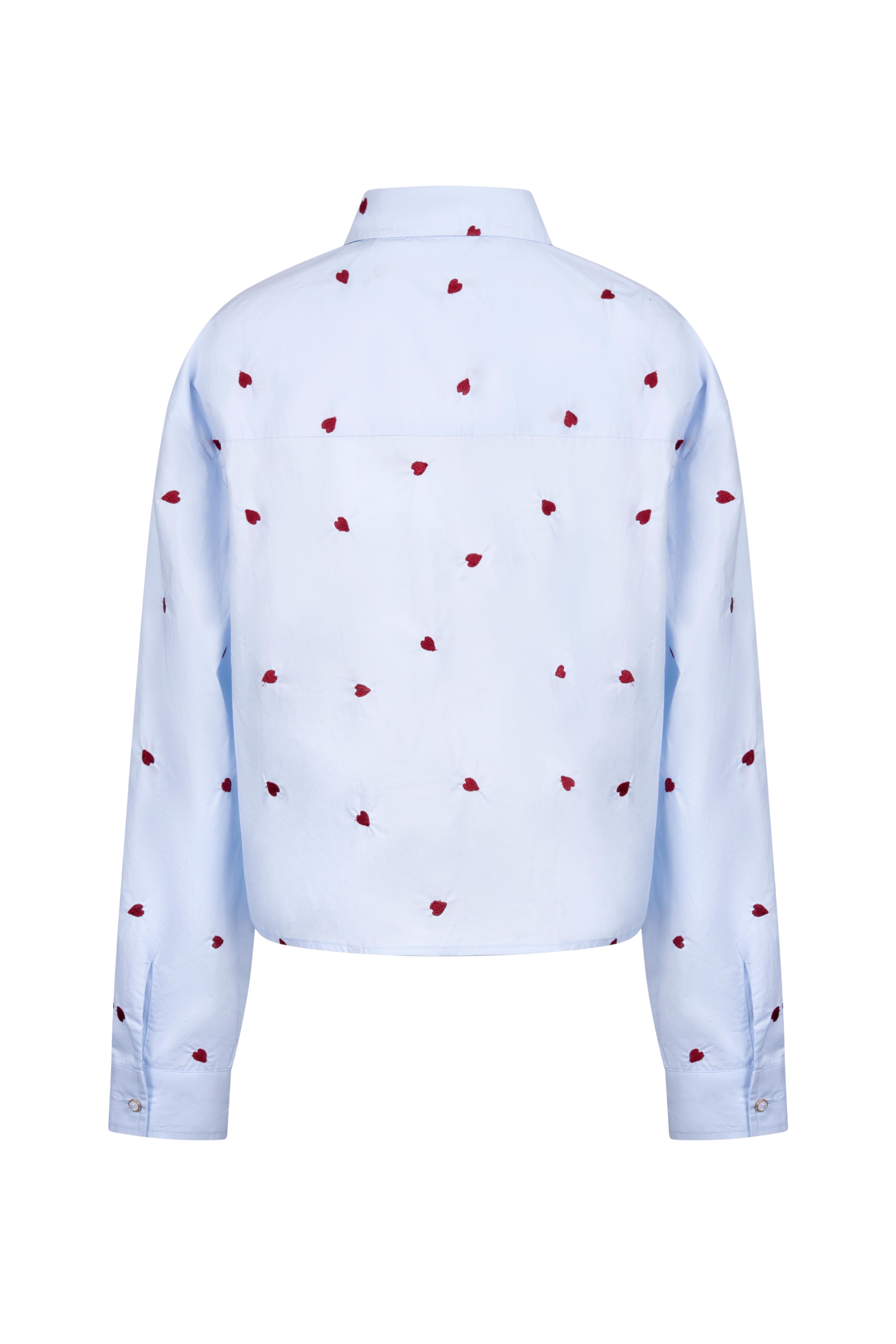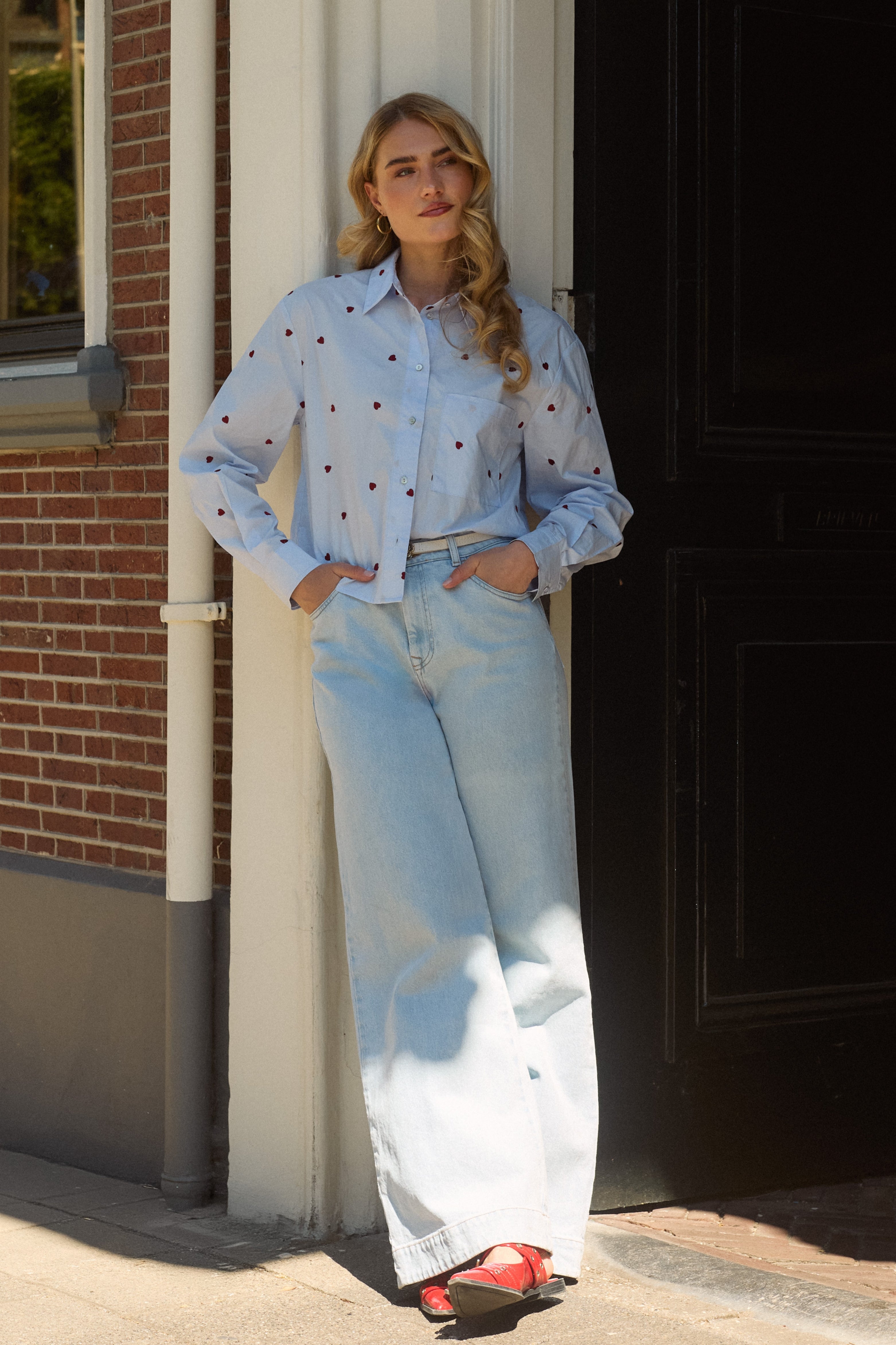 De Blouse Rosa Sky Kiss van Nukus is een frisse blouse met klassieke kraag. Licht poplin-gevoel en geborduurde hartjes geven een speelse, moderne look. Perfect voor casual en smart-casual.