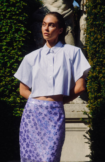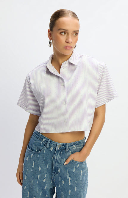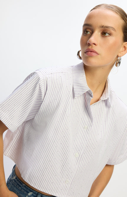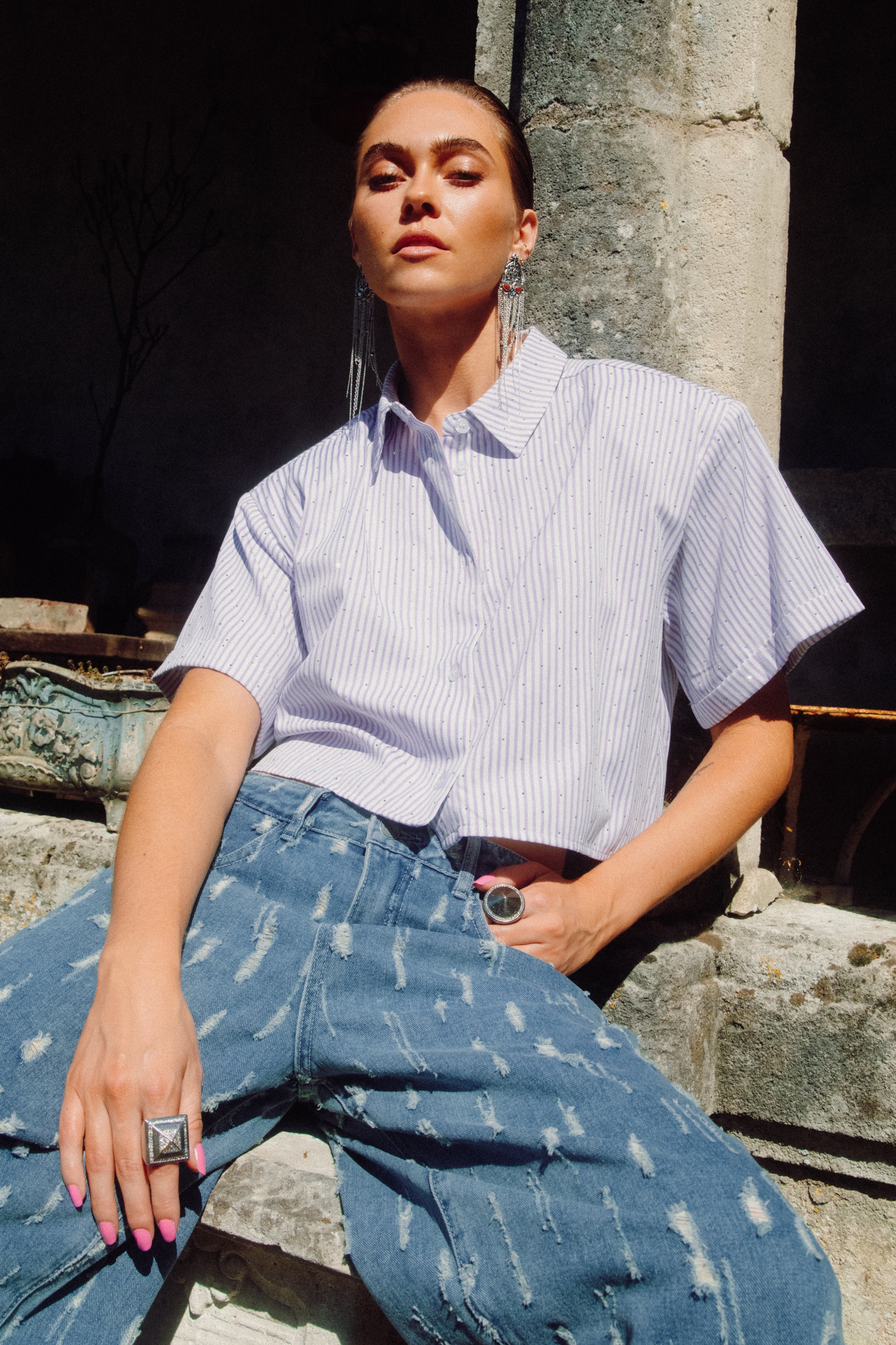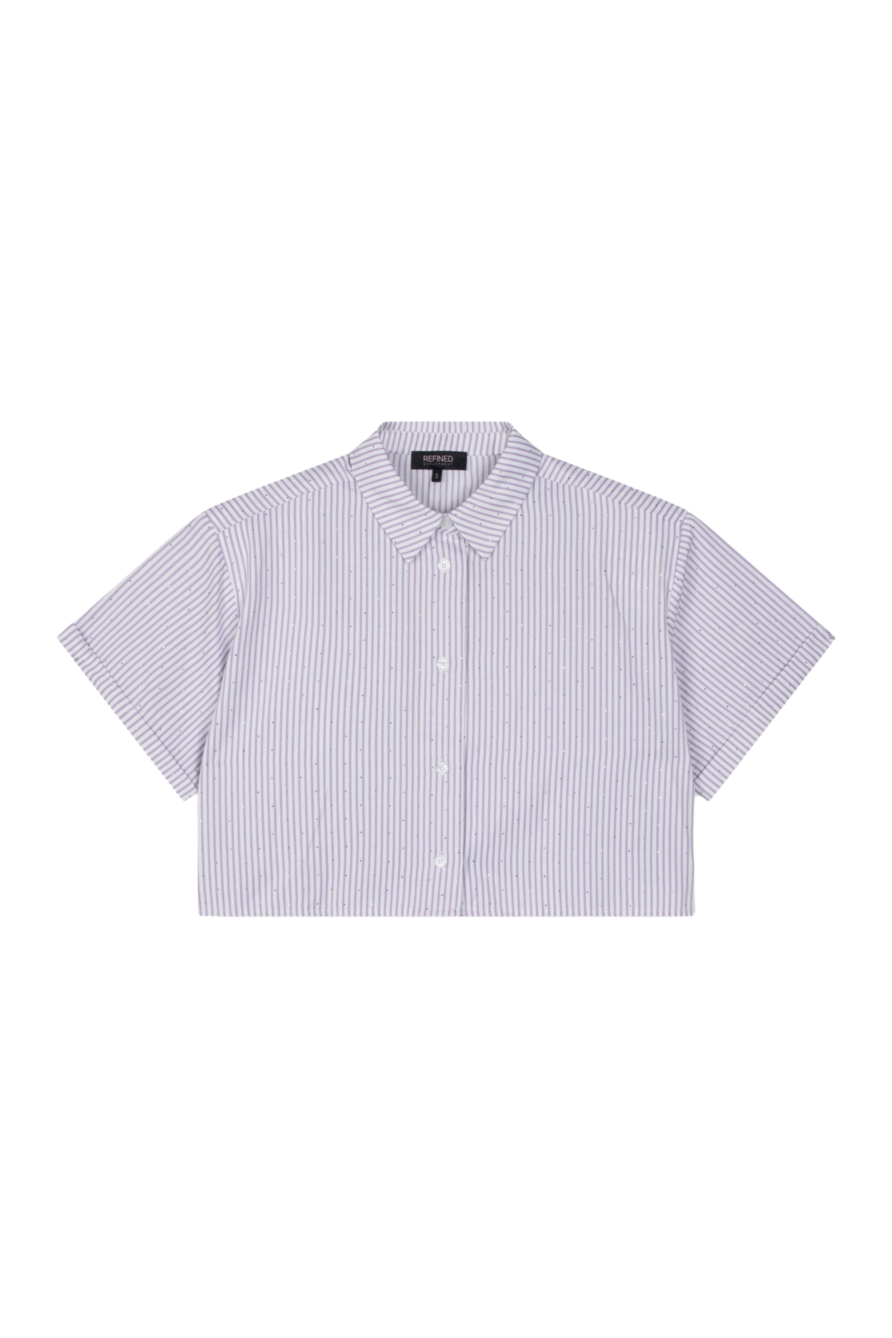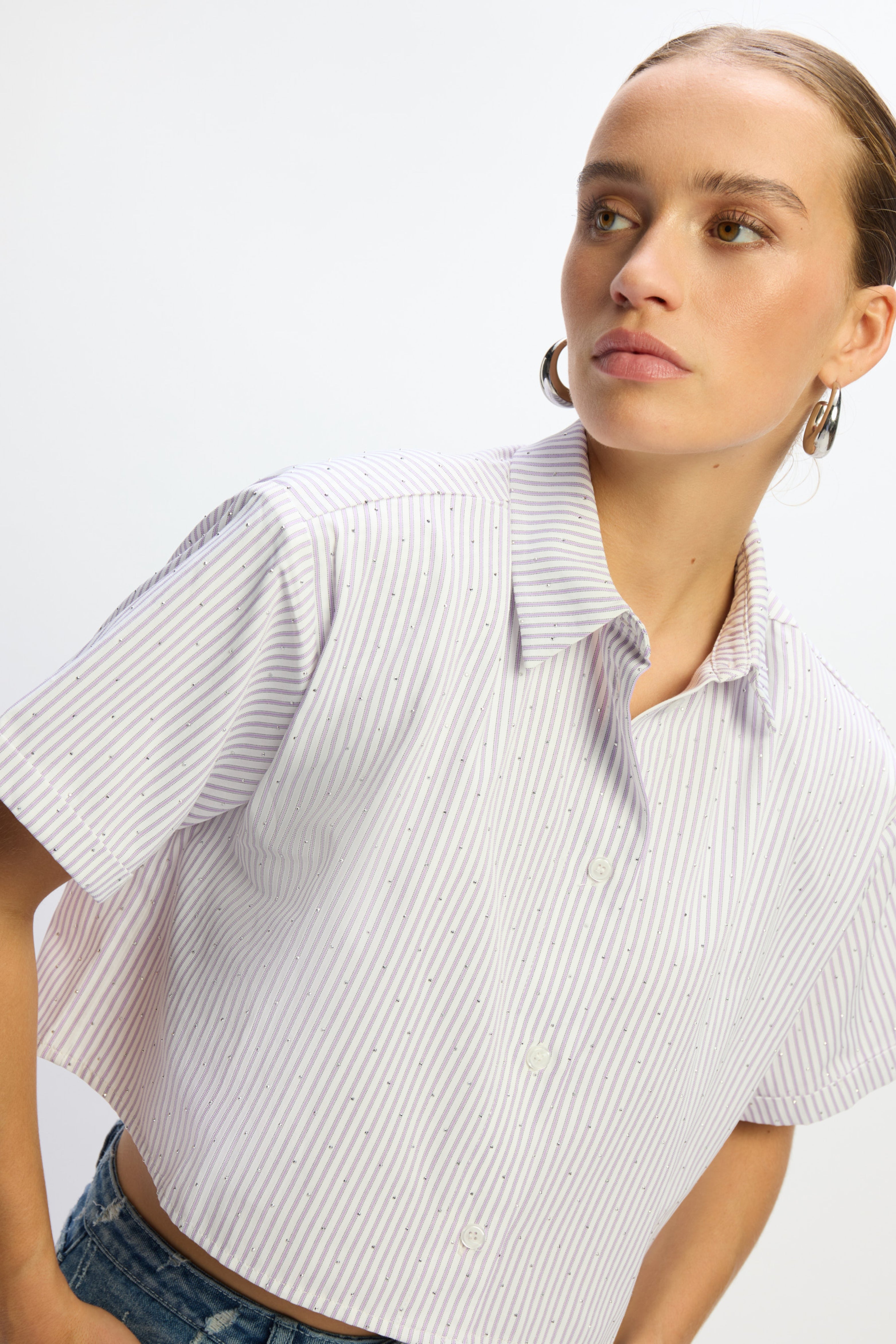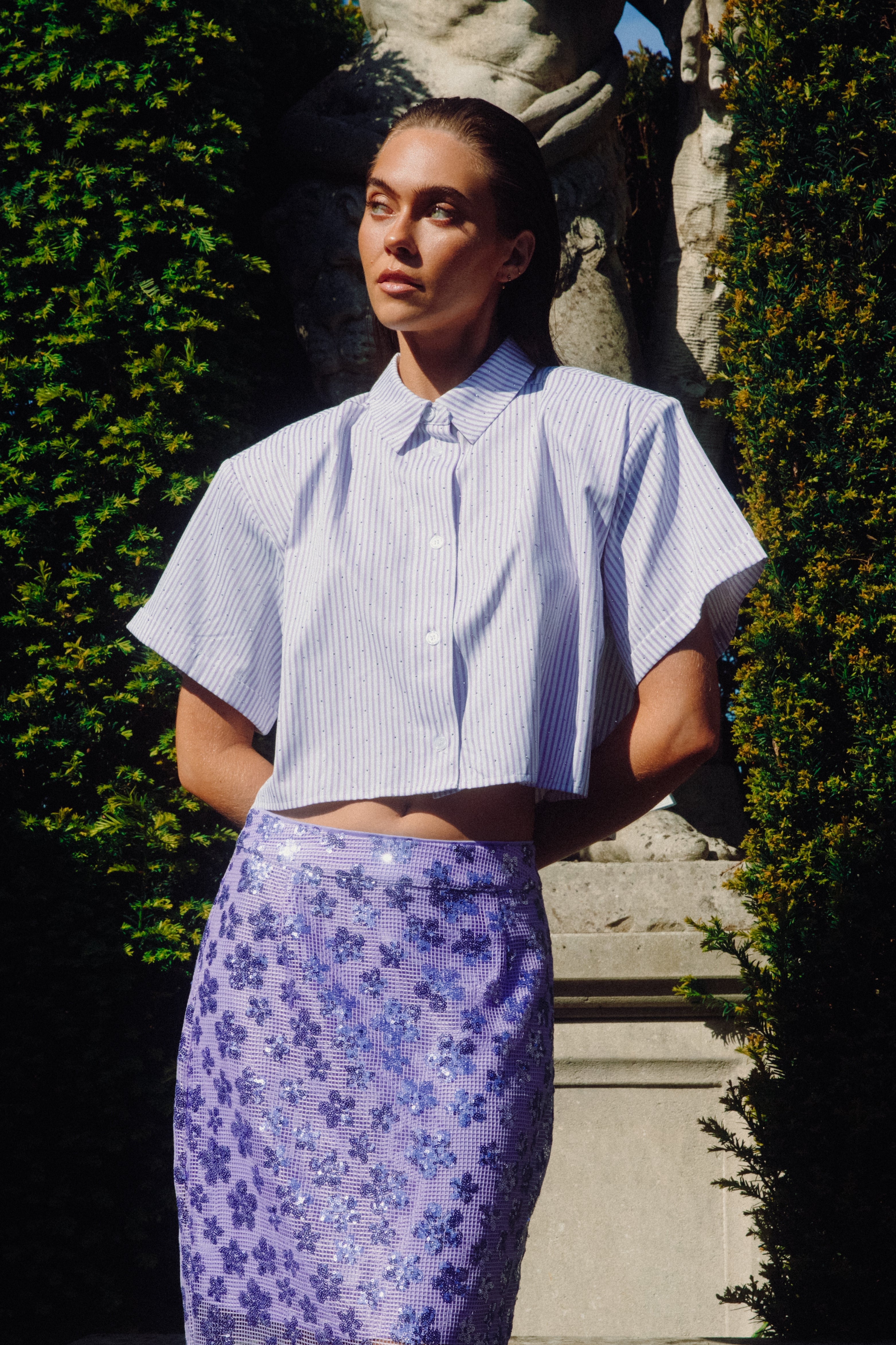 De Steph Striped Cropped Lilac Blouse is een moderne, cropped blouse met lila strepen en subtiele strassteentjes voor een vleugje sparkle. Perfect te combineren met denim voor een frisse en trendy look.