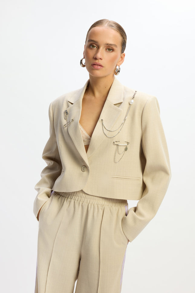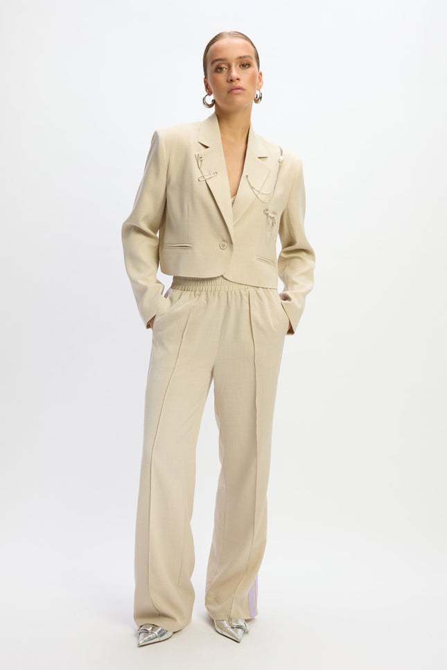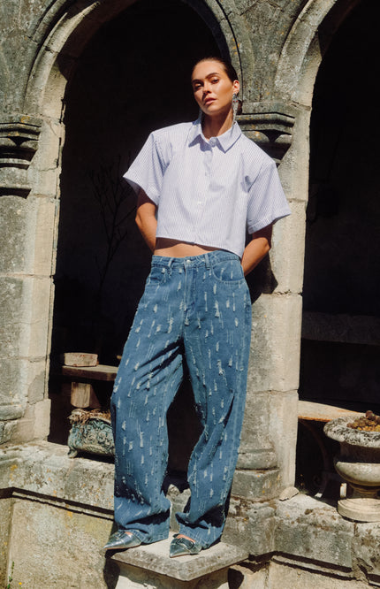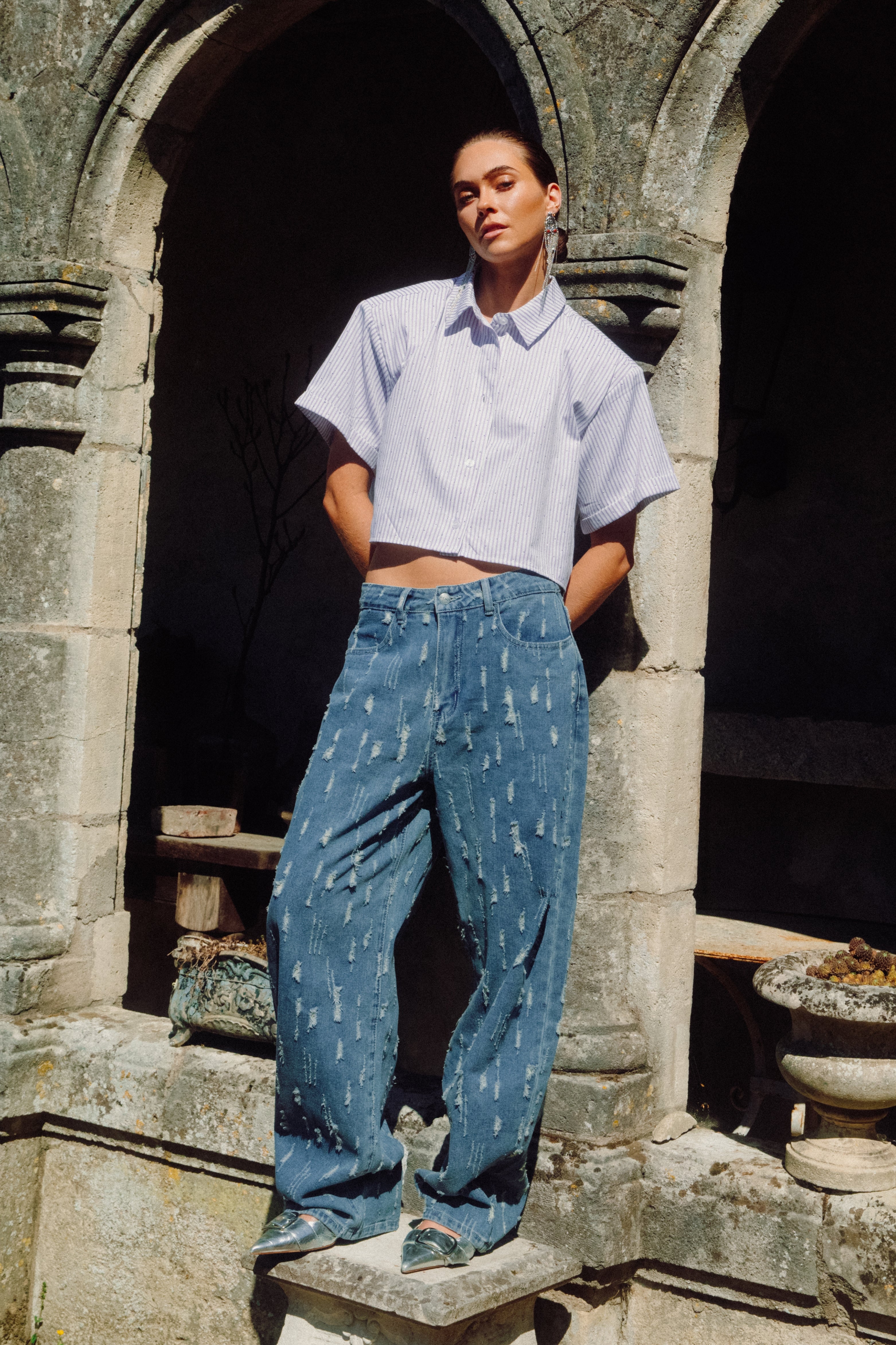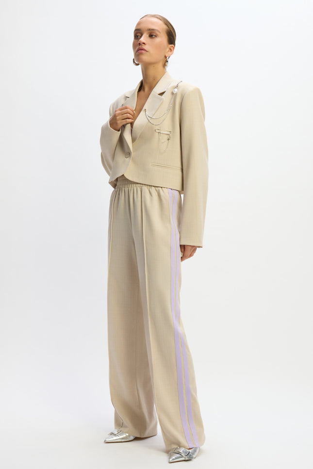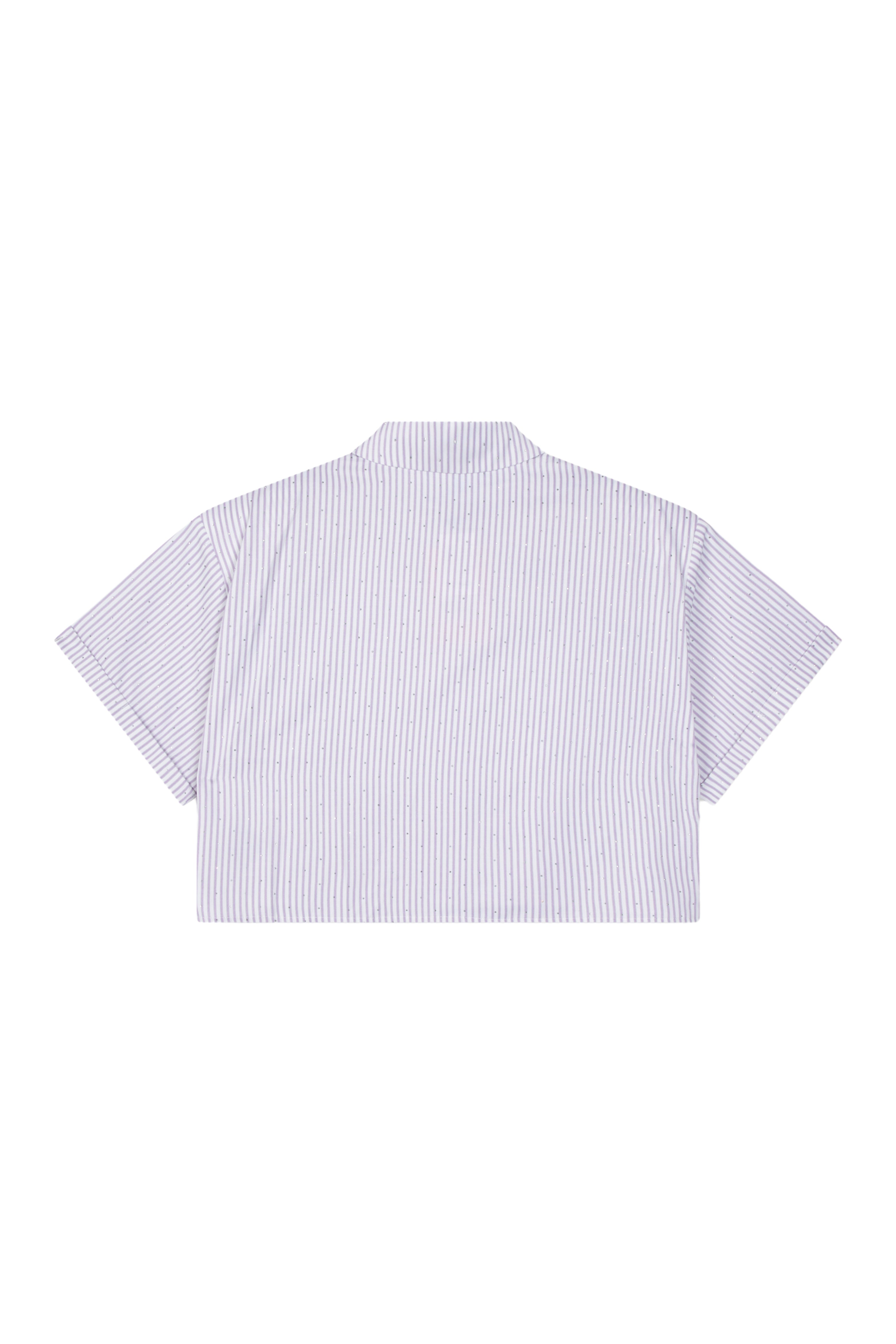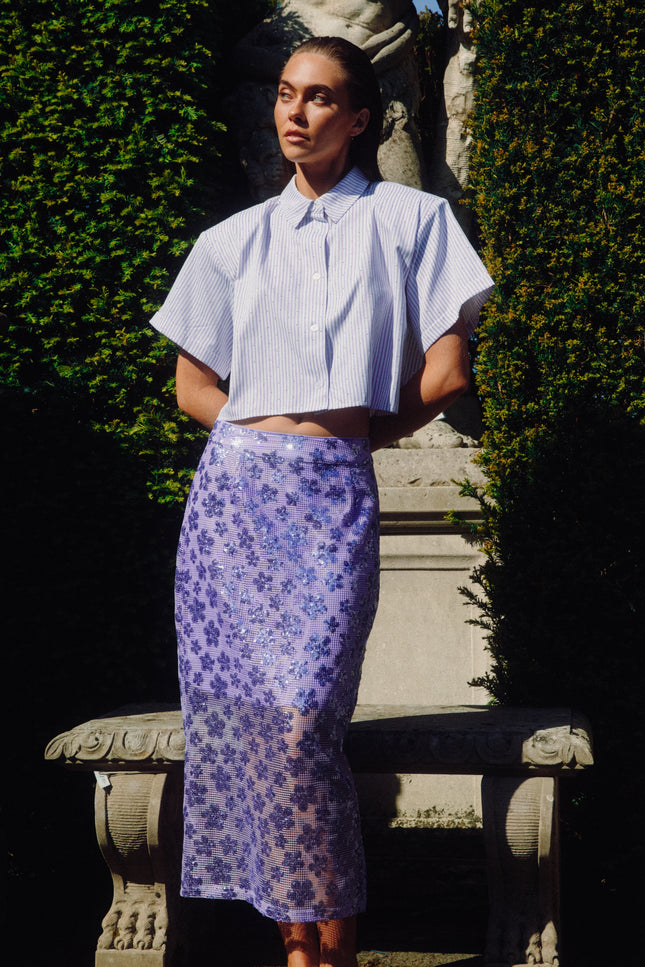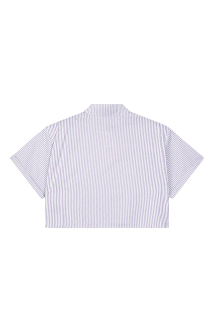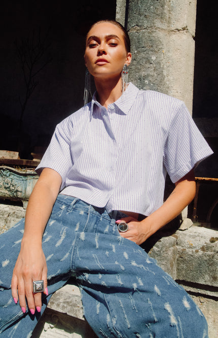 De Steph Striped Cropped Lilac Blouse is een moderne, cropped blouse met lila strepen en subtiele strassteentjes voor een vleugje sparkle. Perfect te combineren met denim voor een frisse en trendy look.