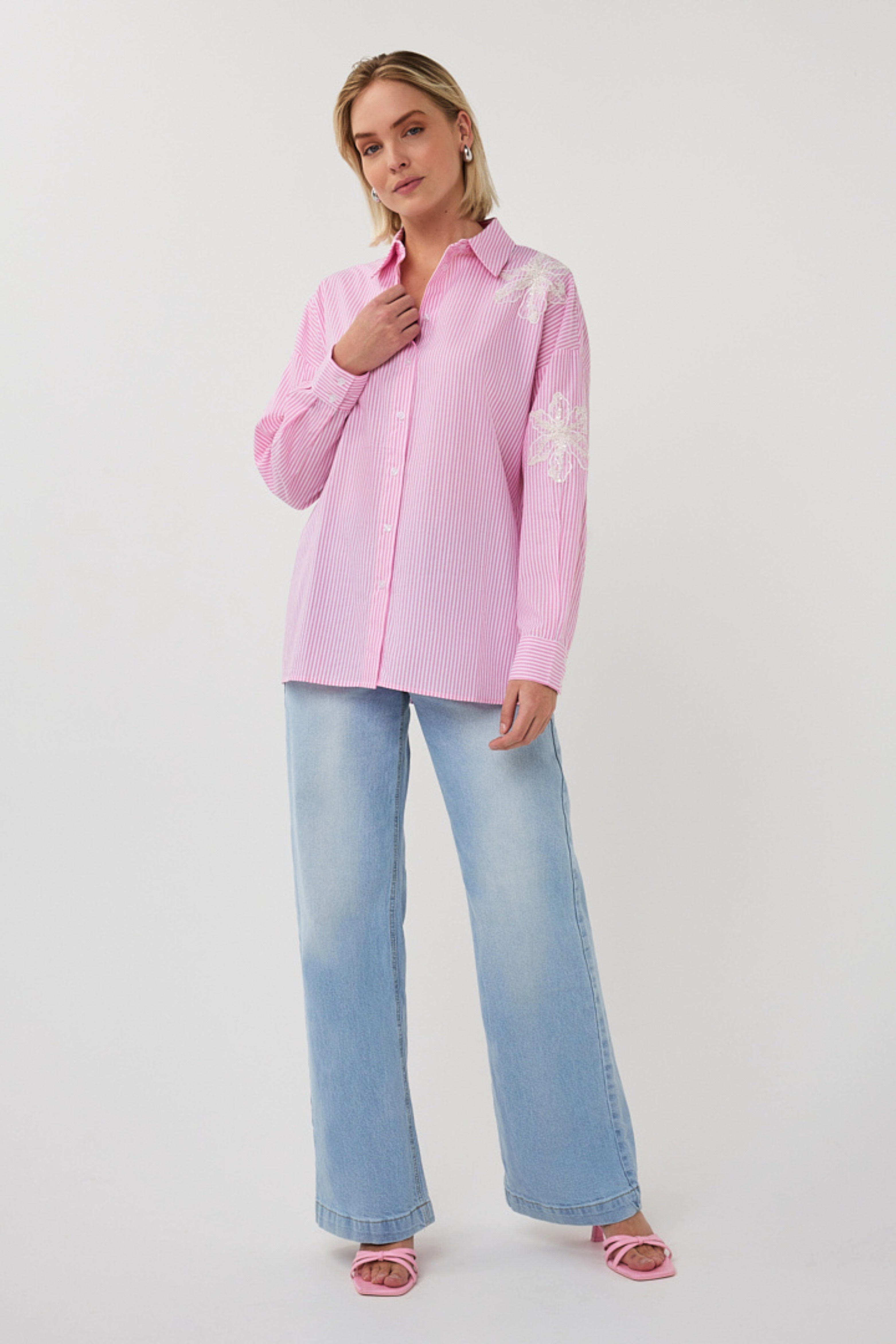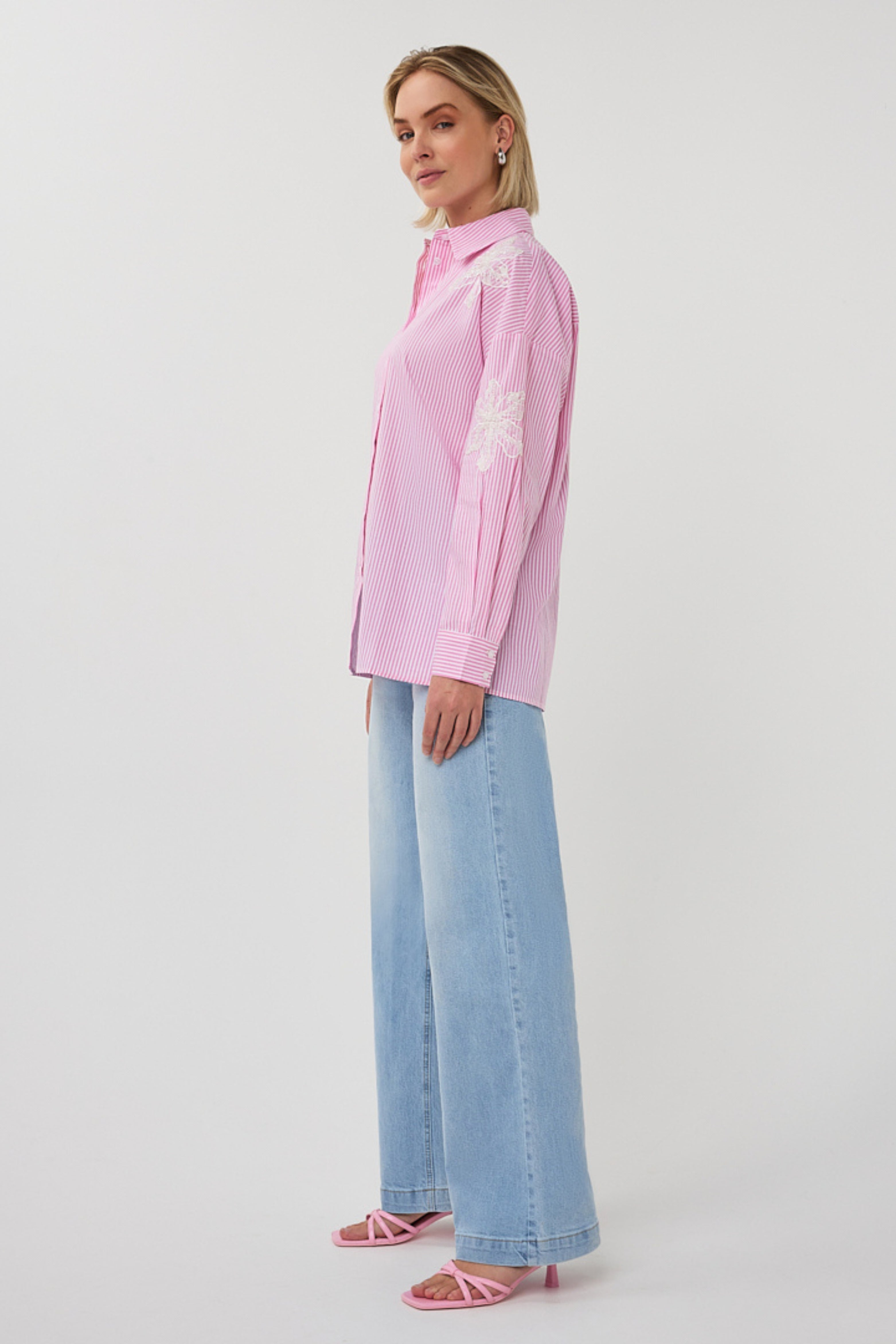 Blouse Striped Flower Patch White Pink SP26.14028
