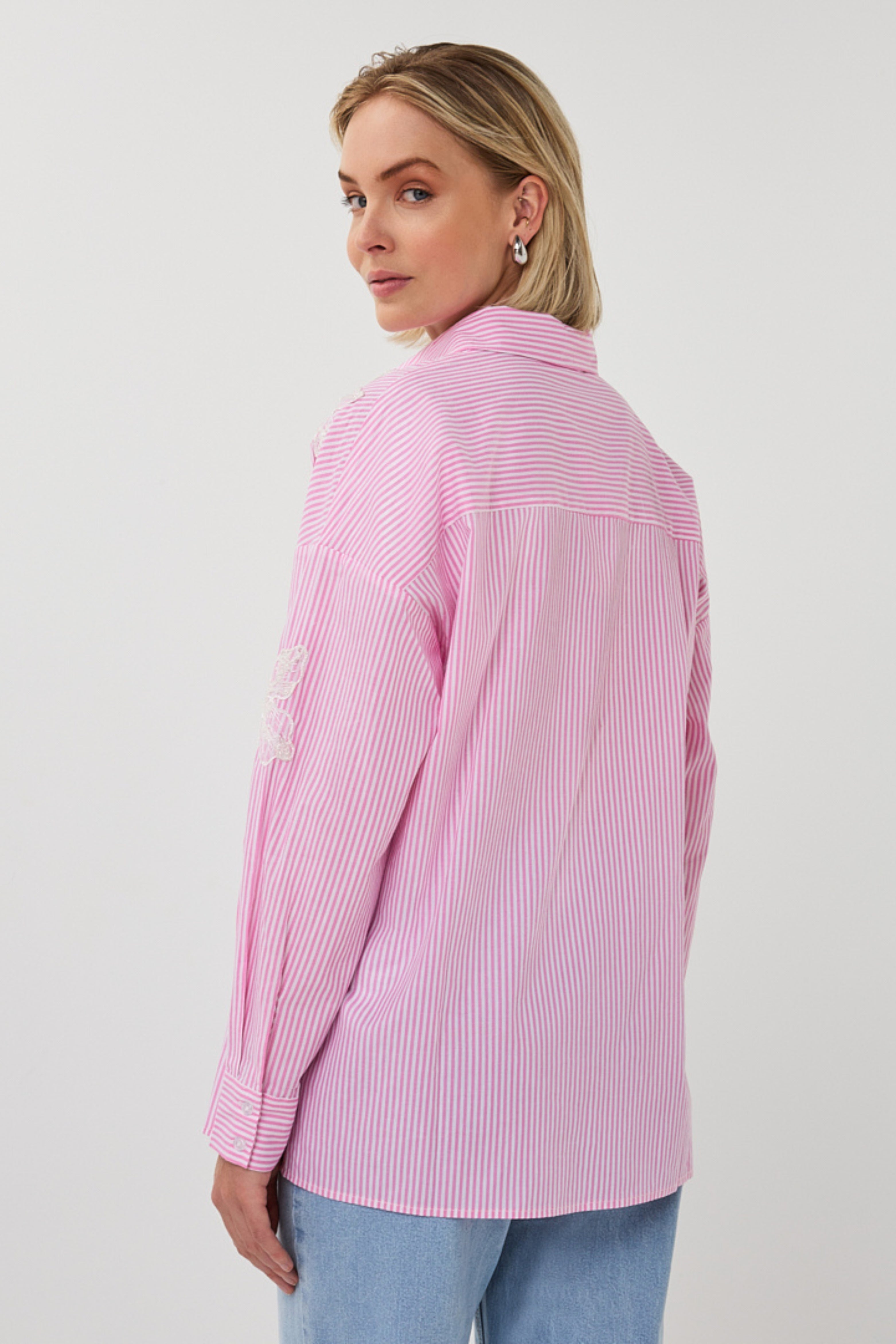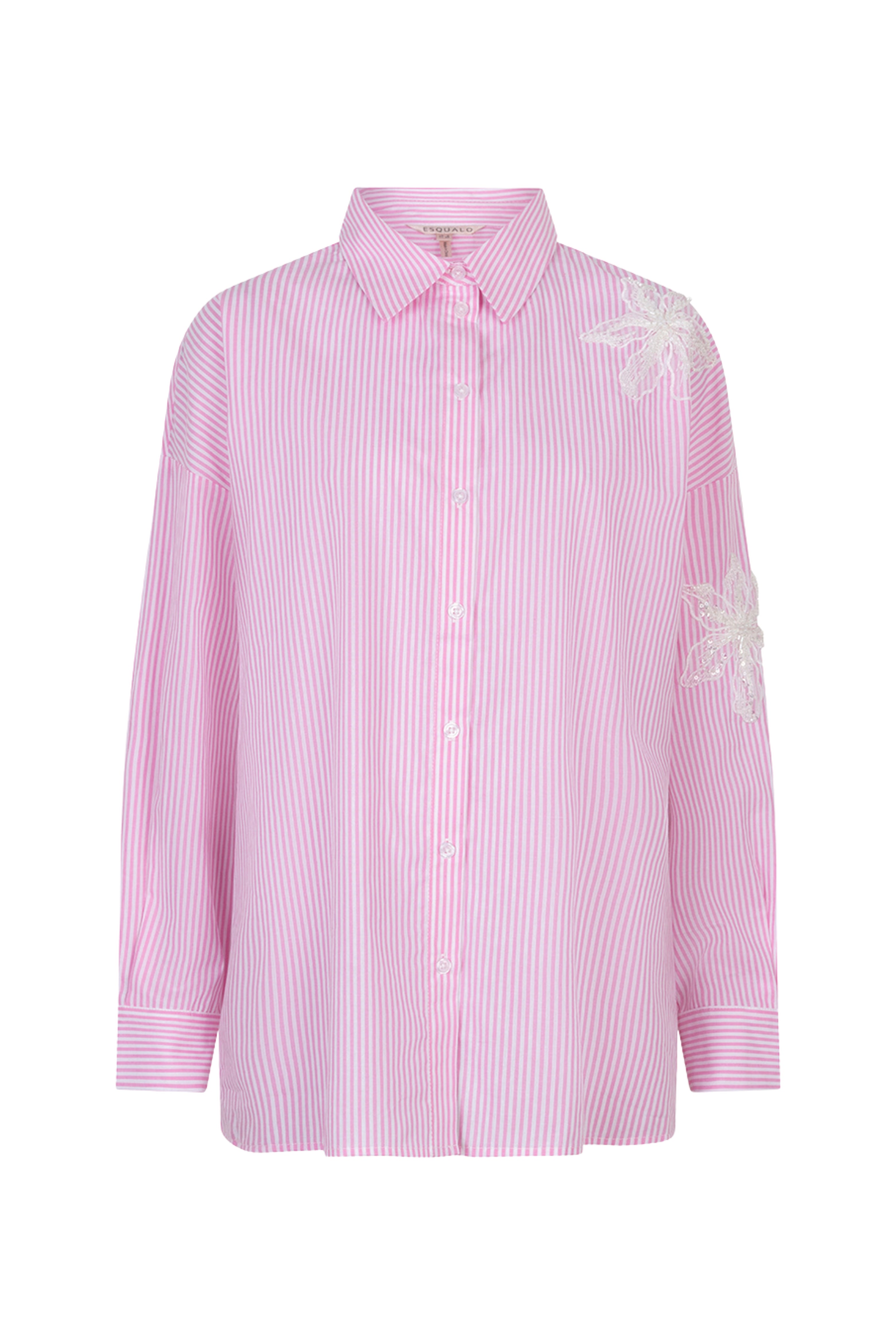 De Blouse Striped Flower Patch White Pink van Esqualo is een vrouwelijke blouse met klassieke kraag. Luchtige stof met streeppatroon en bloemapplicaties op schouder en mouw. Perfect voor een voorjaarsdag of citytrip.