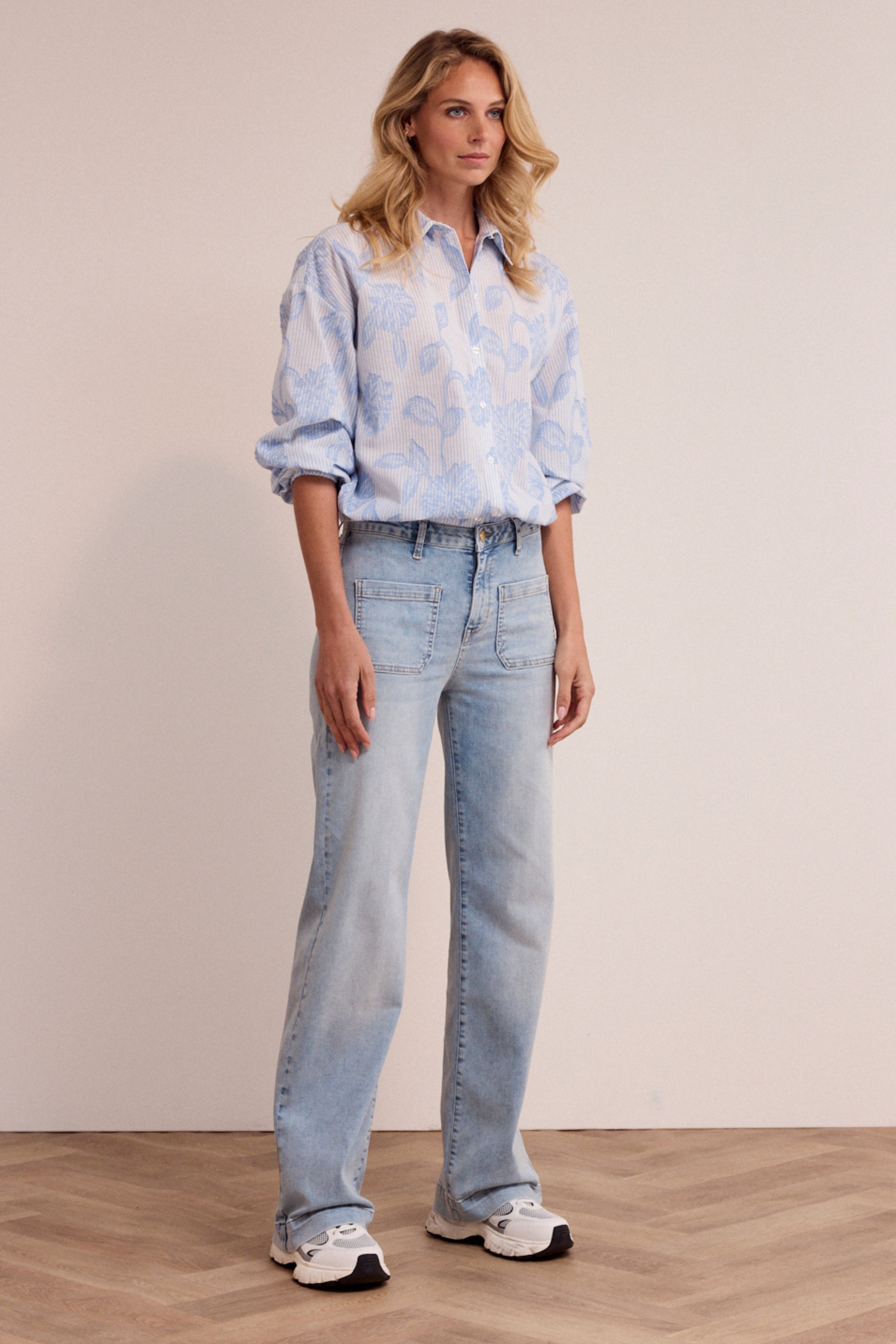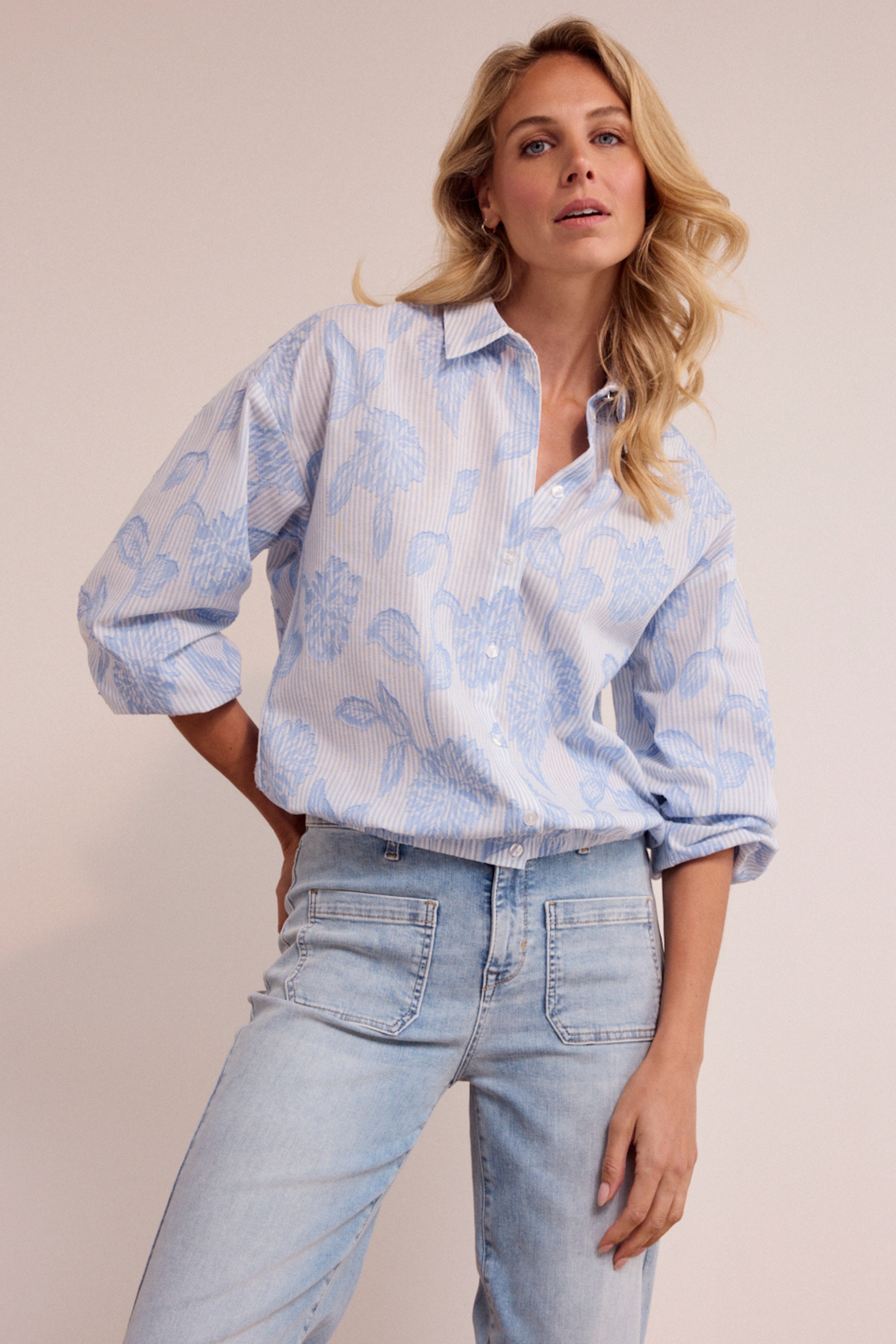 De Blouse Striped Flower Pattern Breezy Blue van Tramontana combineert een frisse streep met een subtiel bloemenpatroon. De luchtige stof en vrouwelijke pasvorm maken deze blouse ideaal voor stijlvolle, zachte najaarslooks.